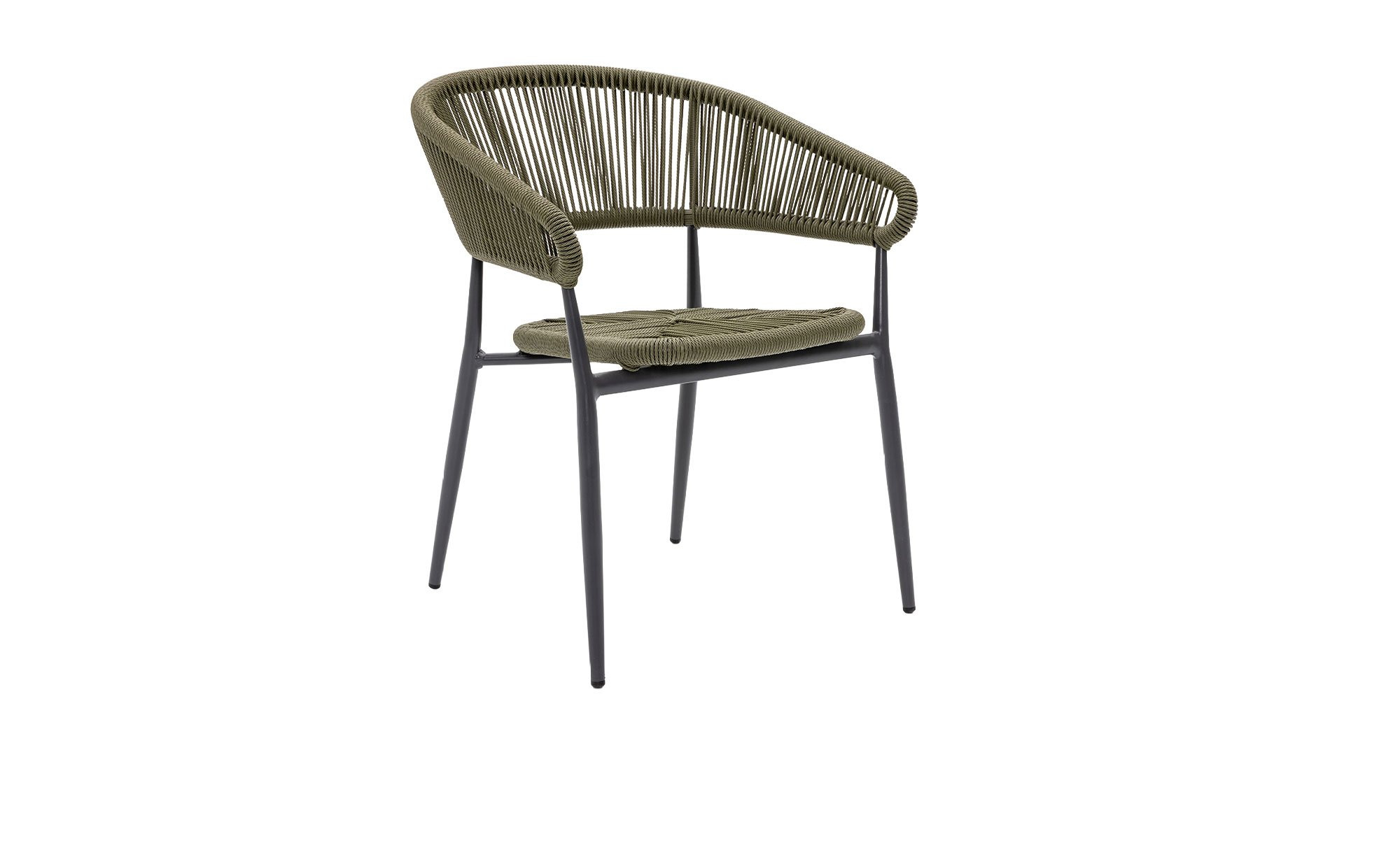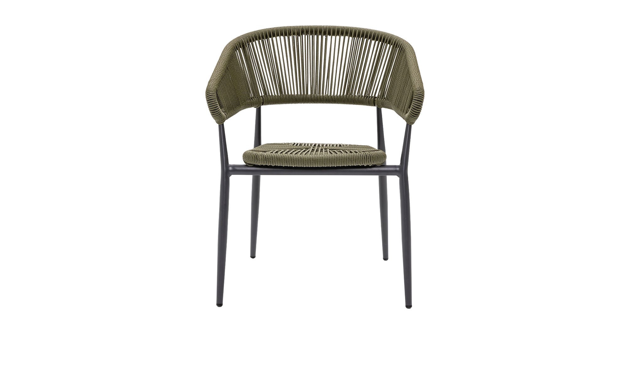 Das ca. 61 x 77 x 58 cm große Möbelstück verfügt über ein stabiles 4-Fuß-Gestell aus pulverbeschichtetem Aluminium in Anthrazit. Sitzfläche und Rücken sind mit einem ca. 5 mm dicken PE-Seilgeflecht in Salbeigrün ausgestattet.