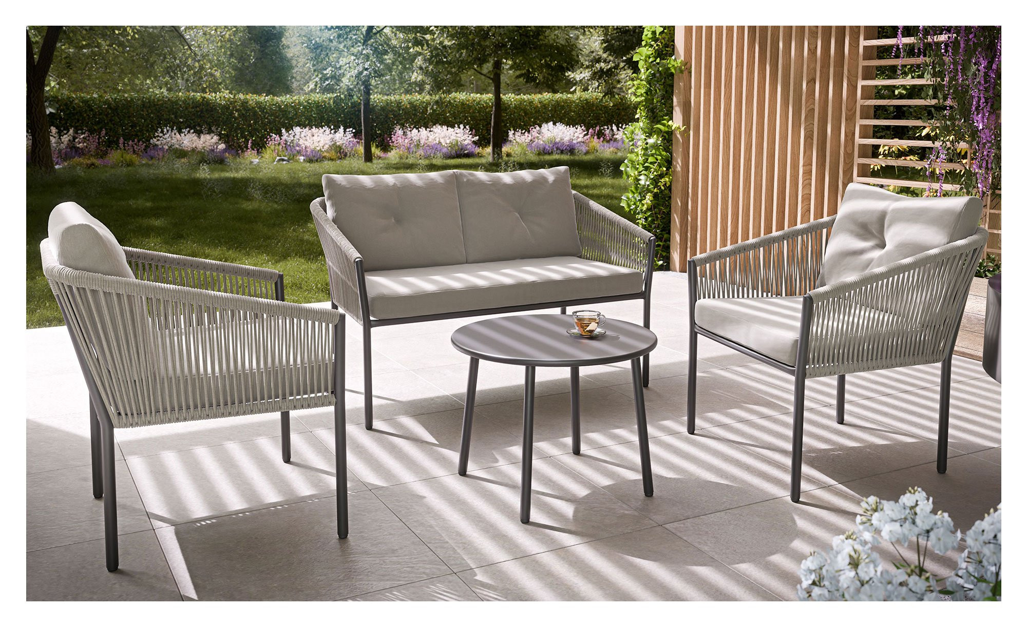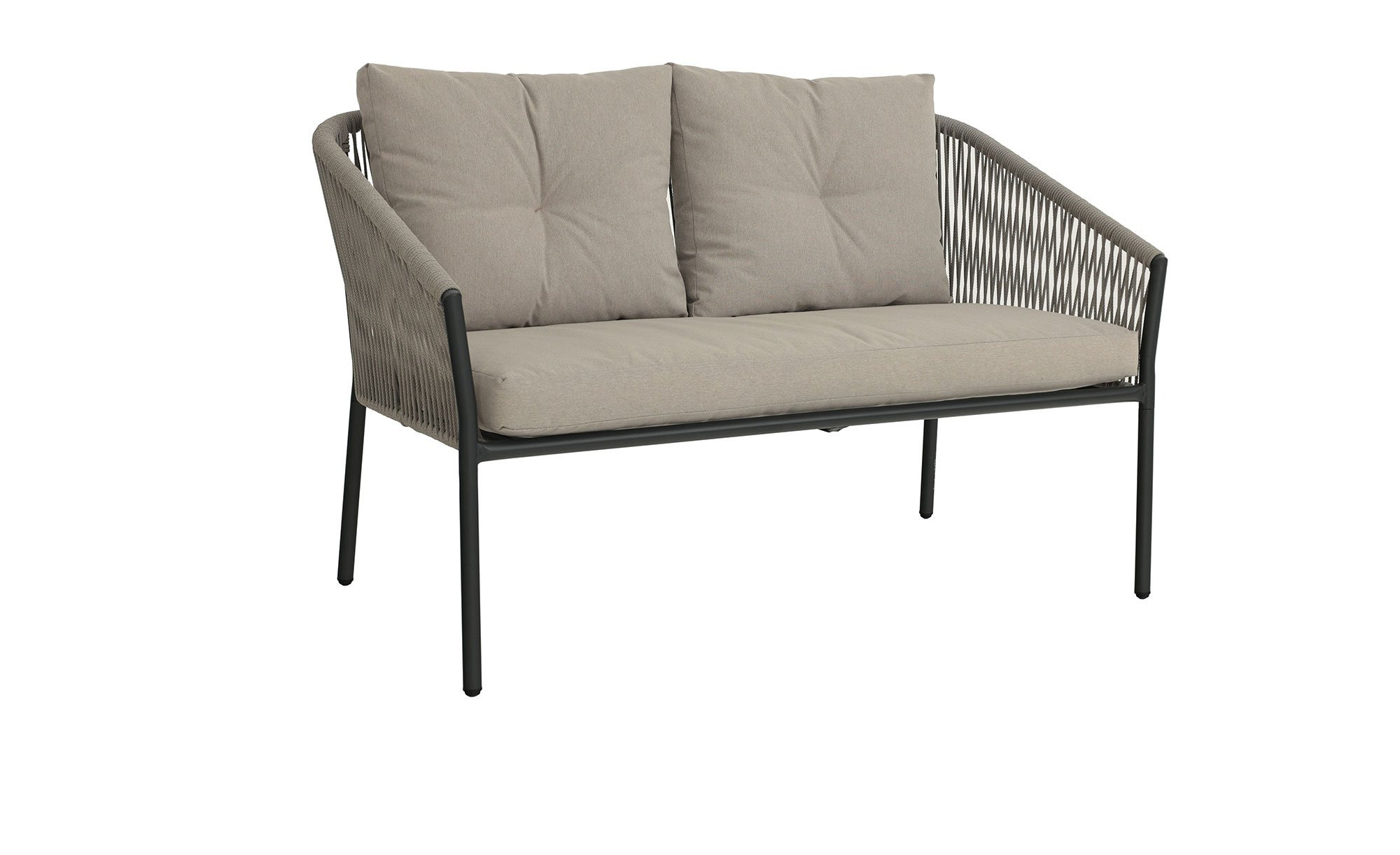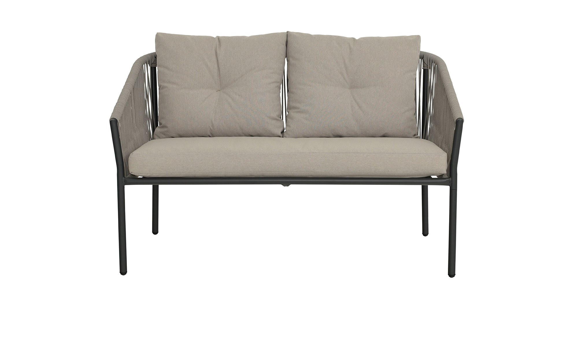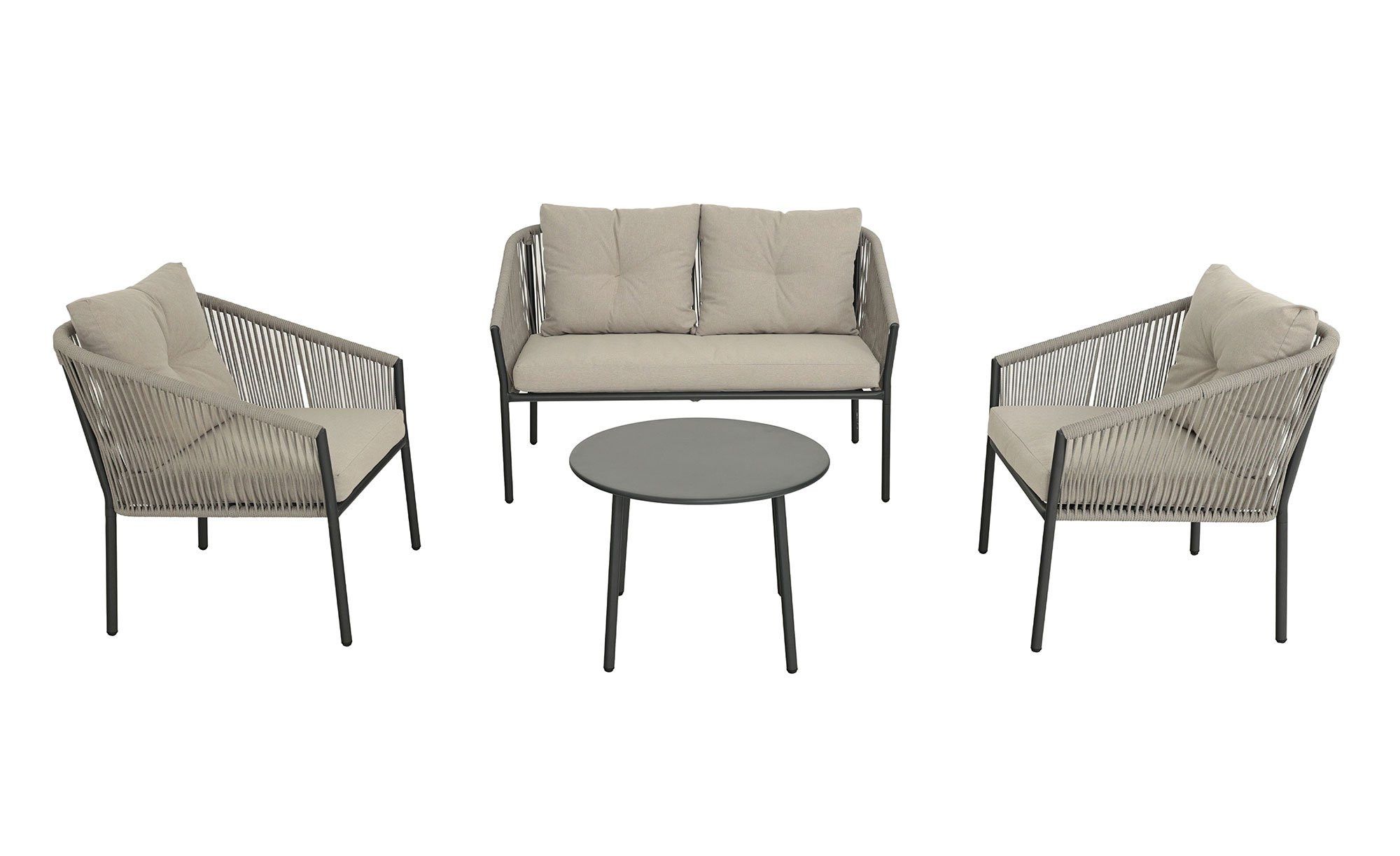 Zum Angebot der Marke outdoor gehören neben einem Tisch auch zwei jeweils ca. 67 x 74,5 x 67 cm große Sessel sowie ein Sofa mit grauen Auflagen aus gesponnenem Polyester. Alle Möbel verfügen über vierfüßige Gestelle aus Stahl mit grauer Pulverbeschichtung. Zudem wurden an den Rücken- und Armlehnen der Sitzgelegenheiten jeweils mit gewebtem grauem Rope bestückte Bereiche integriert.