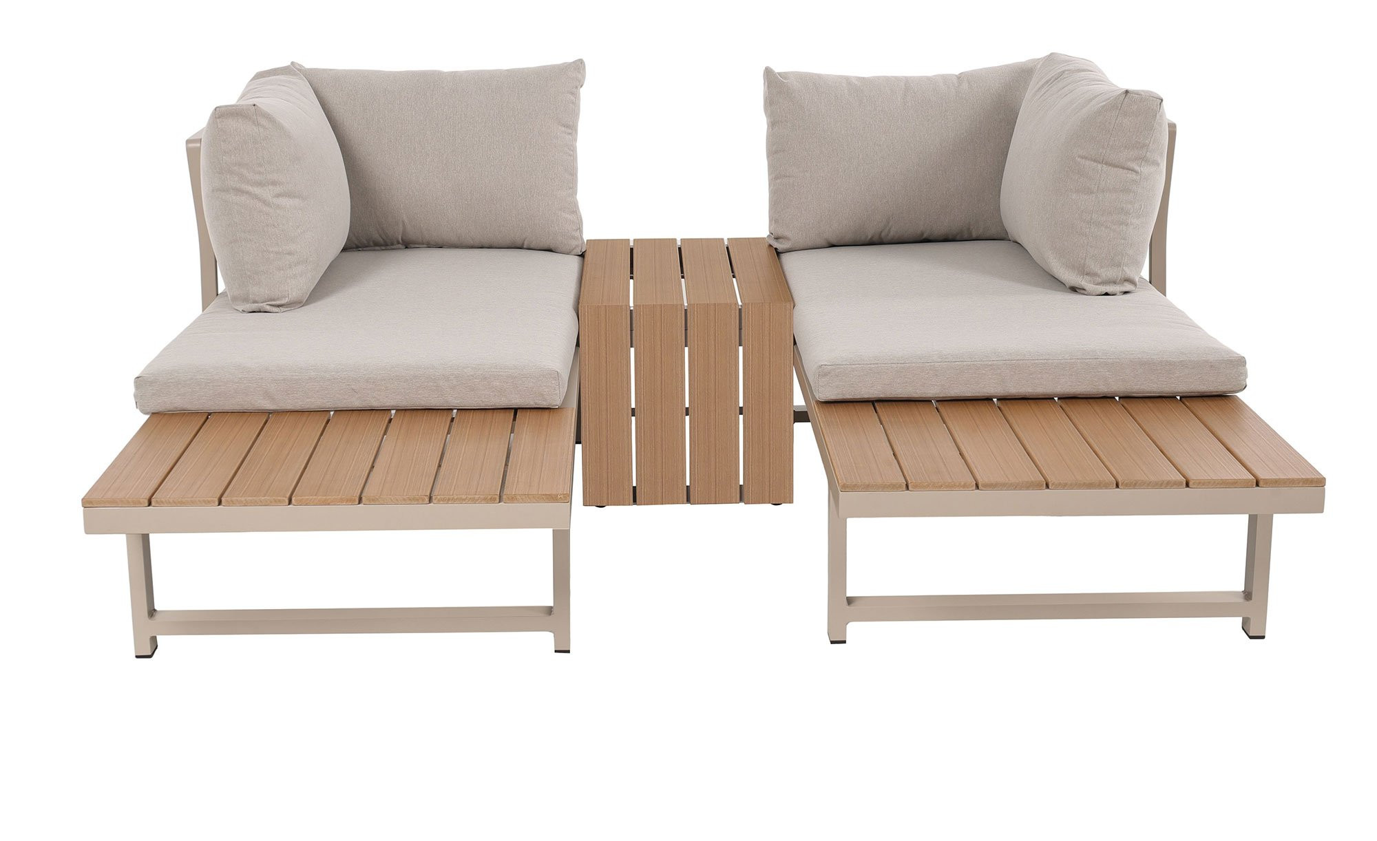 Das Set besteht aus einem Tisch und zwei 2-Sitzer Sofas mit Maßen von ca. 175 x 70 x 72 cm. An ihren aus Aluminium gefertigten Gestellen verfügen die Möbel über Kufenfüße und eine beige Pulverbeschichtung. Zusätzlich dürfen Sie sich auf Kunststoff-Latten in authentischer Holz-Optik freuen. Beim ca. 70 x 39 x 40 cm großen Tisch erwartet Sie zudem eine mit max. 70 kg belastbare Platte.