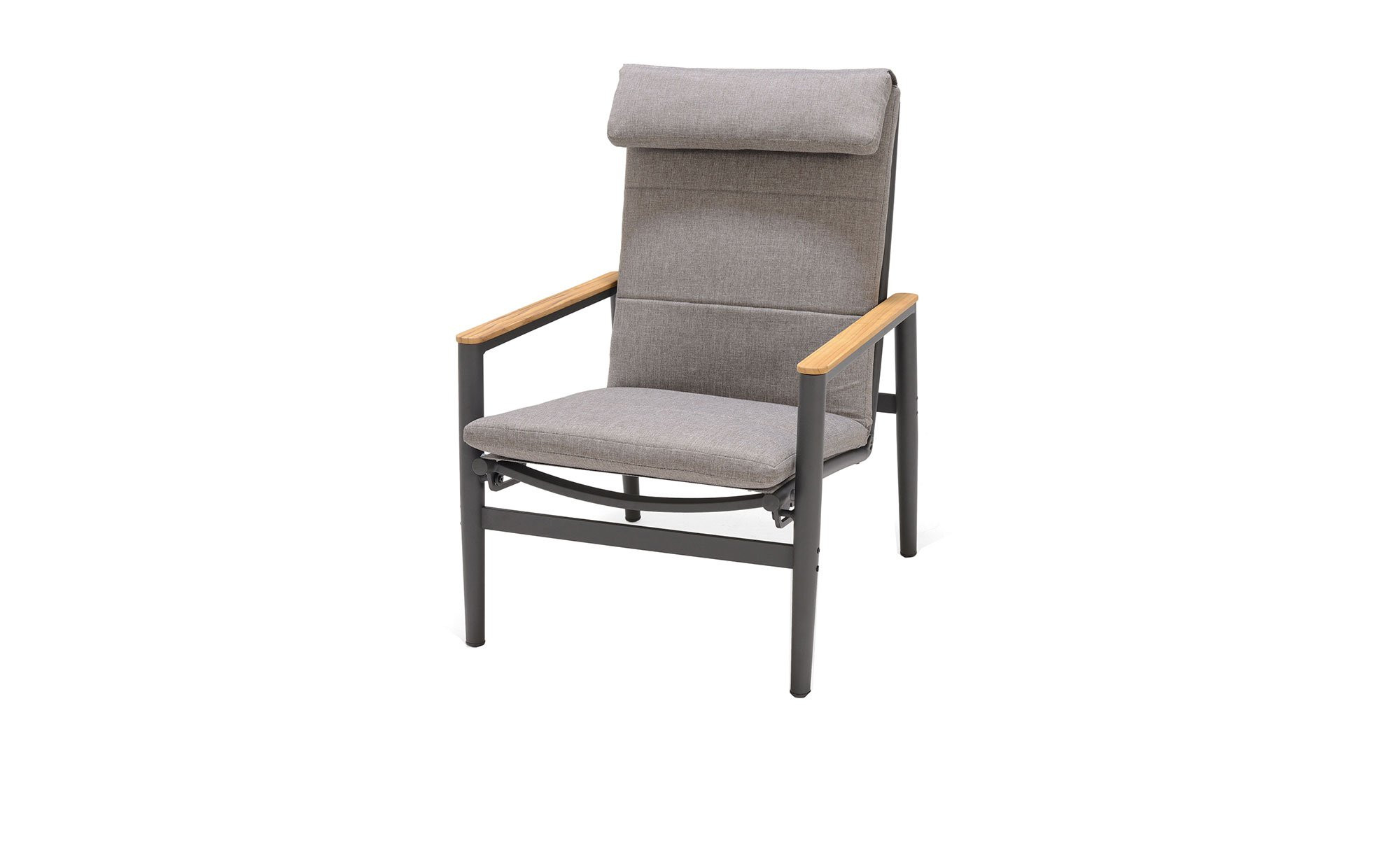 Am magnesiumgrauen Aluminiumgestell des ca. 86 x 97 x 71 cm großen Gartenmöbels sorgen holzfarbene Armlehnen aus Teakholz für einen natürlichen Einfluss. Zum Angebot gehören außerdem Kissen. Sie sind mit grauem Olefin aus 100 % Polyprobylen bezogen.