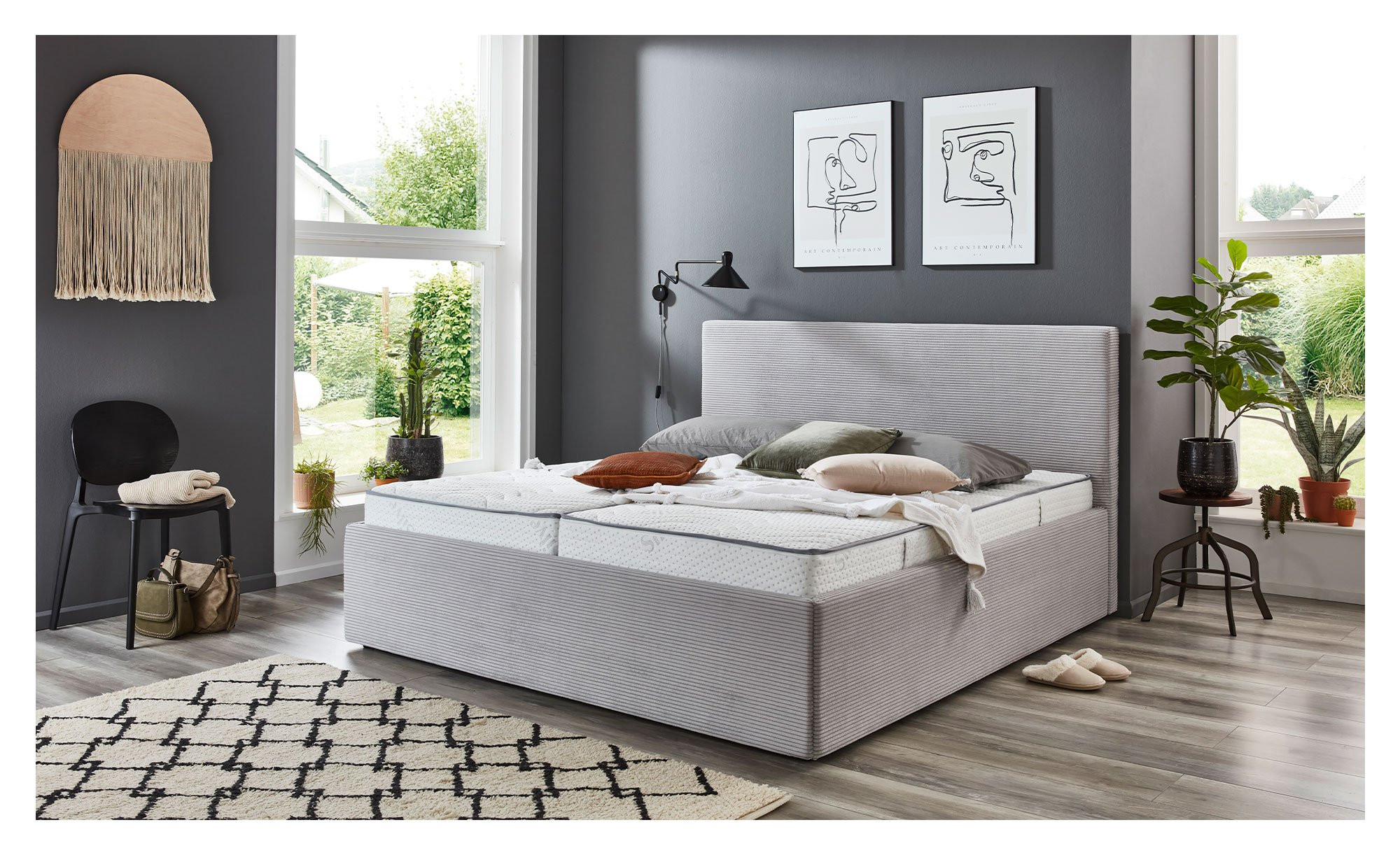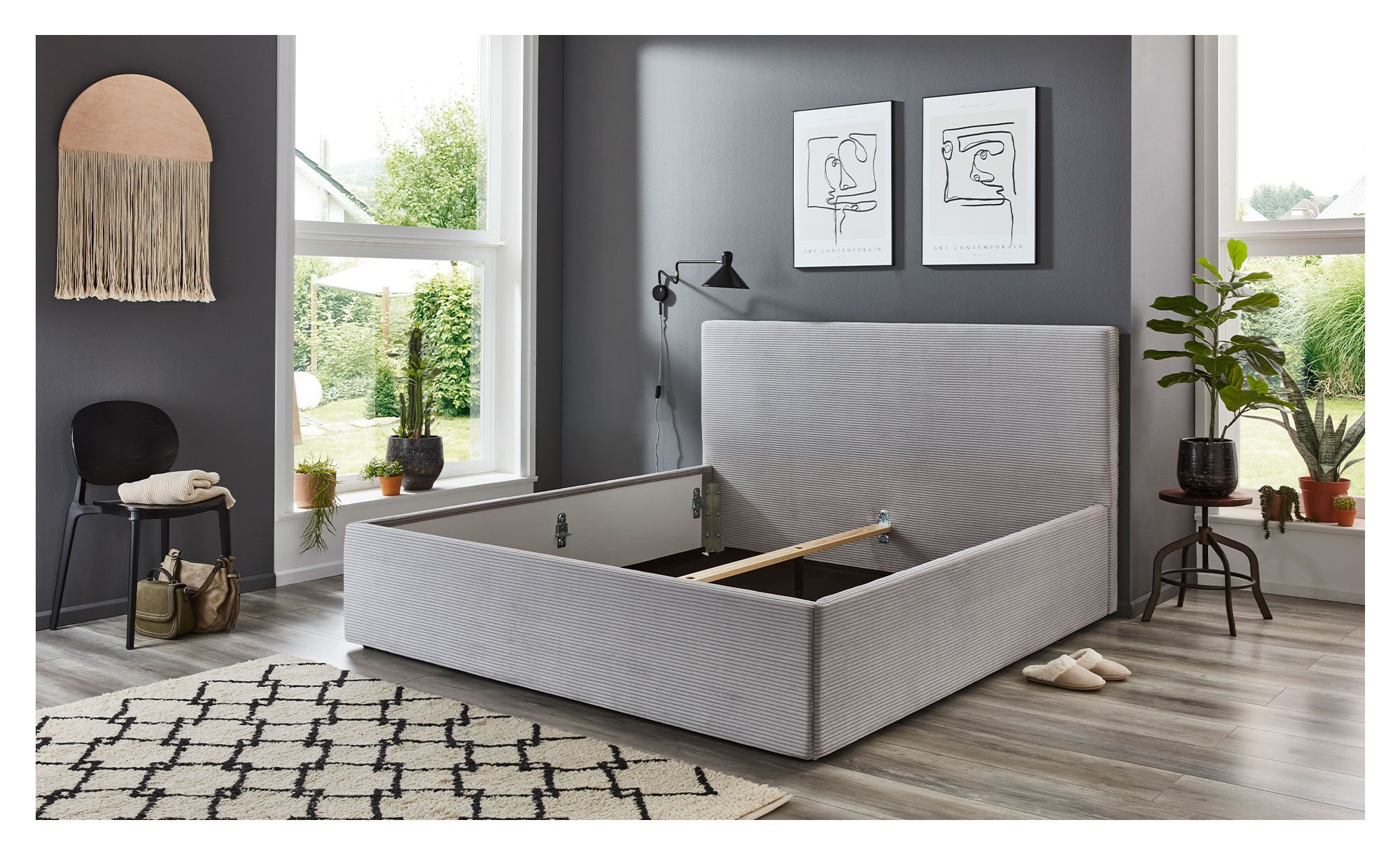 Dank des Stoffbezugs aus silbernem Breitcord springt das ca. 180 x 110 x 213 cm große Möbelstück unmittelbar ins Auge. Seine ca. 180 x 200 cm umfassende Liegefläche bietet jede Menge Platz zum Entspannen. Außerdem ist durch den integrierten Bettkasten auch für den nötigen Stauraum gesorgt.