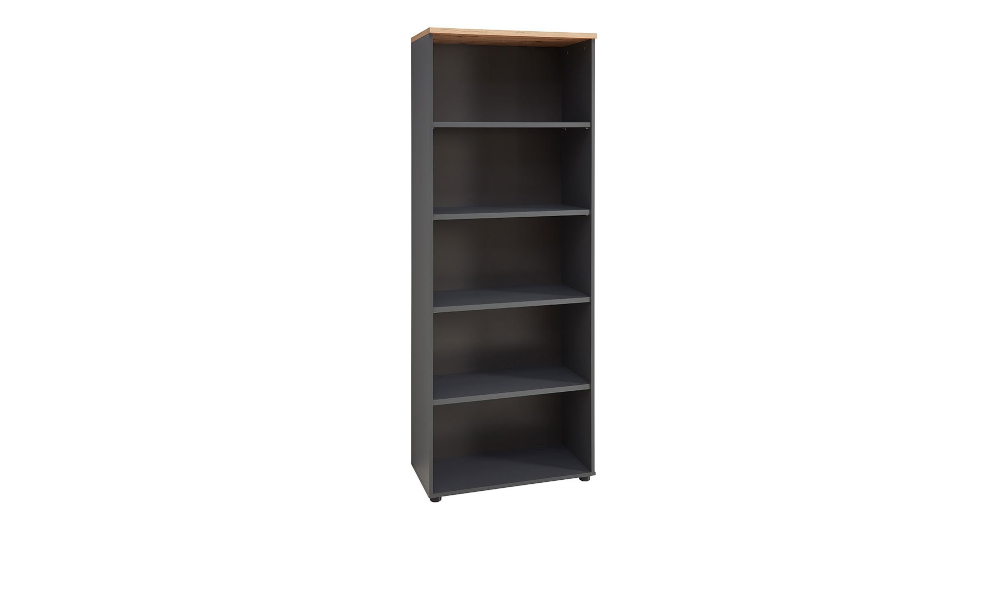 Der aus Holzwerkstoff bestehende Korpus des ca. 75 x 197 x 38 cm großen Regals ist ebenso wie seine Rückwand und das Innendekor in ansprechendem Graphit gehalten. Als Kontrast fungiert die Deckplatte in einem Artisan Eiche-Dekor. Zudem gibt es schwarze Füße in Form von Kunststoffgleitern.