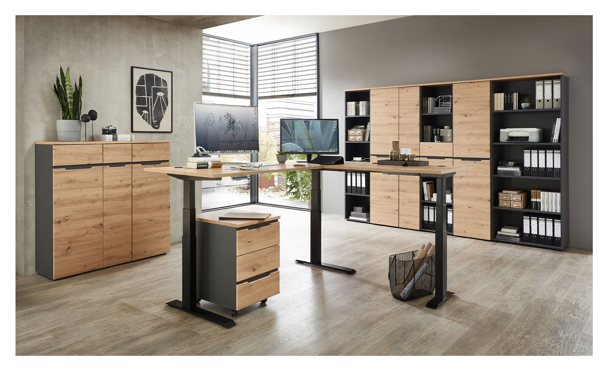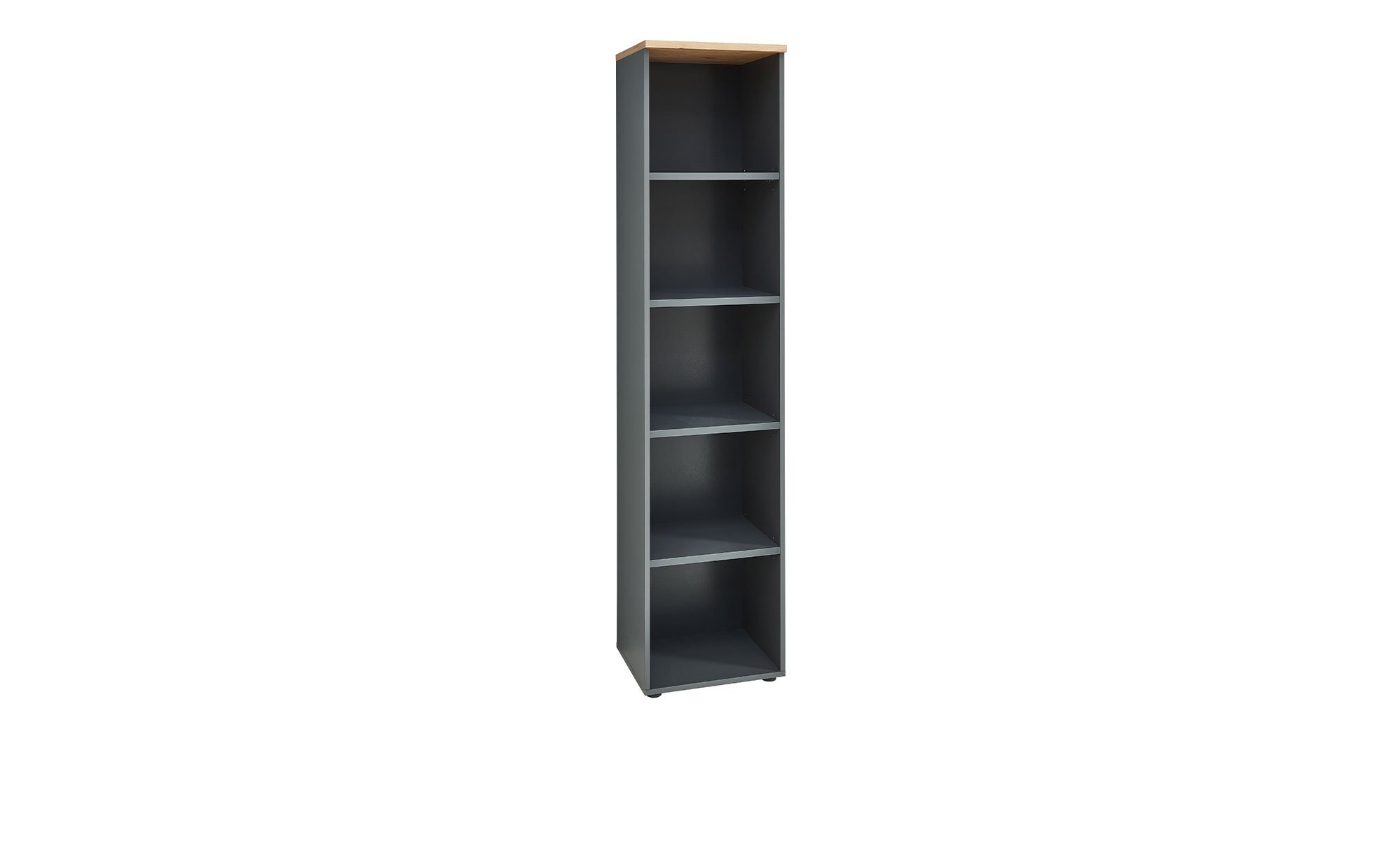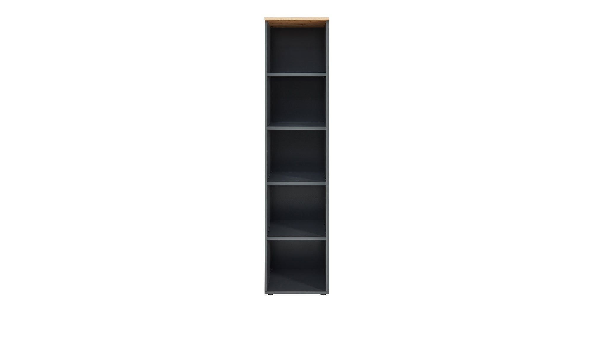 Sowohl der aus Holzwerkstoff bestehende Korpus als auch die Rückwand und das Innendekor des Möbels sind in einem ansprechenden Graphit-Ton gestaltet. Während sich die schwarzen Kunststoffgleiter unauffällig in das Gesamtbild fügen, sticht die Deckplatte im Dekor Artisan Eiche unmittelbar ins Auge.