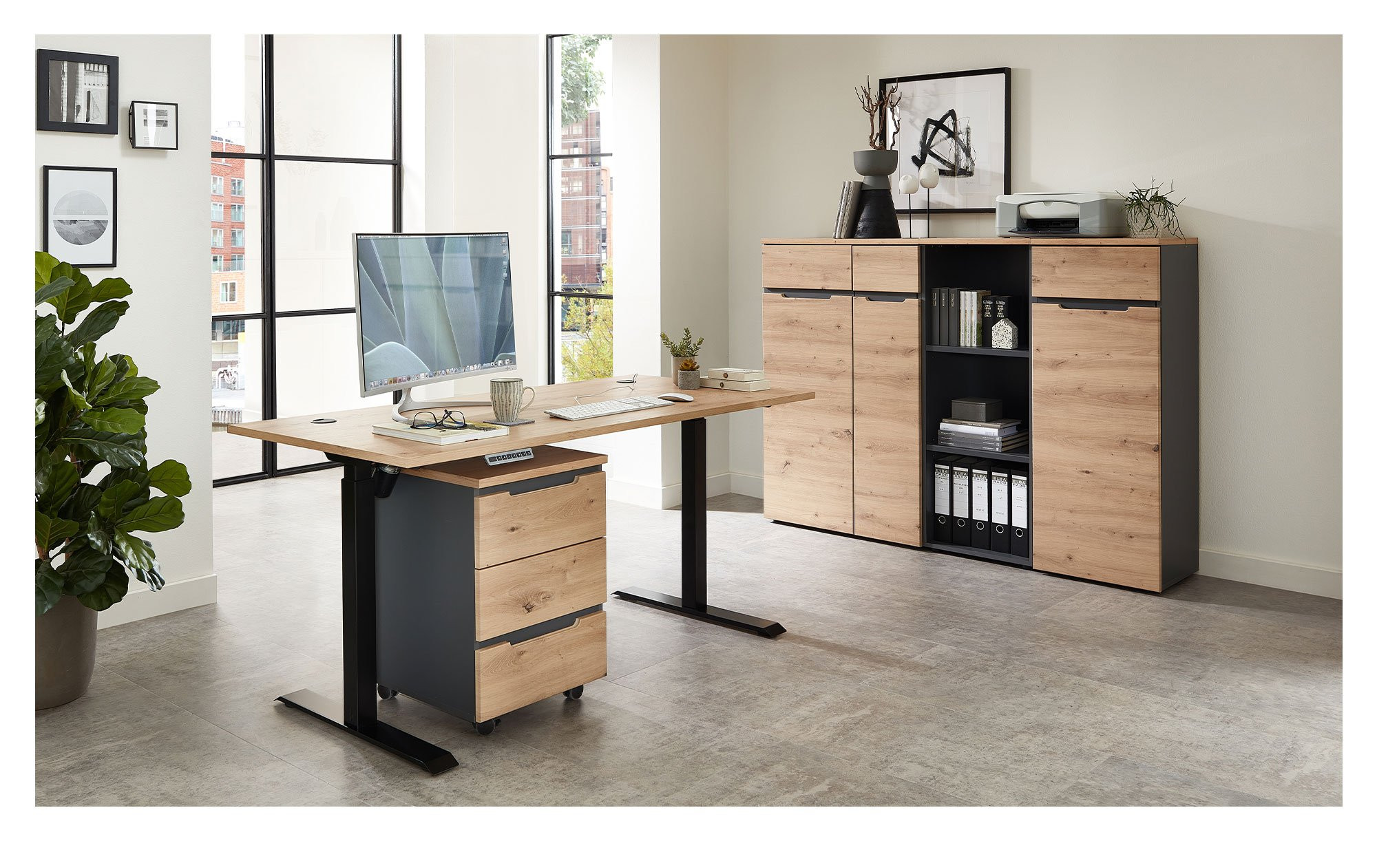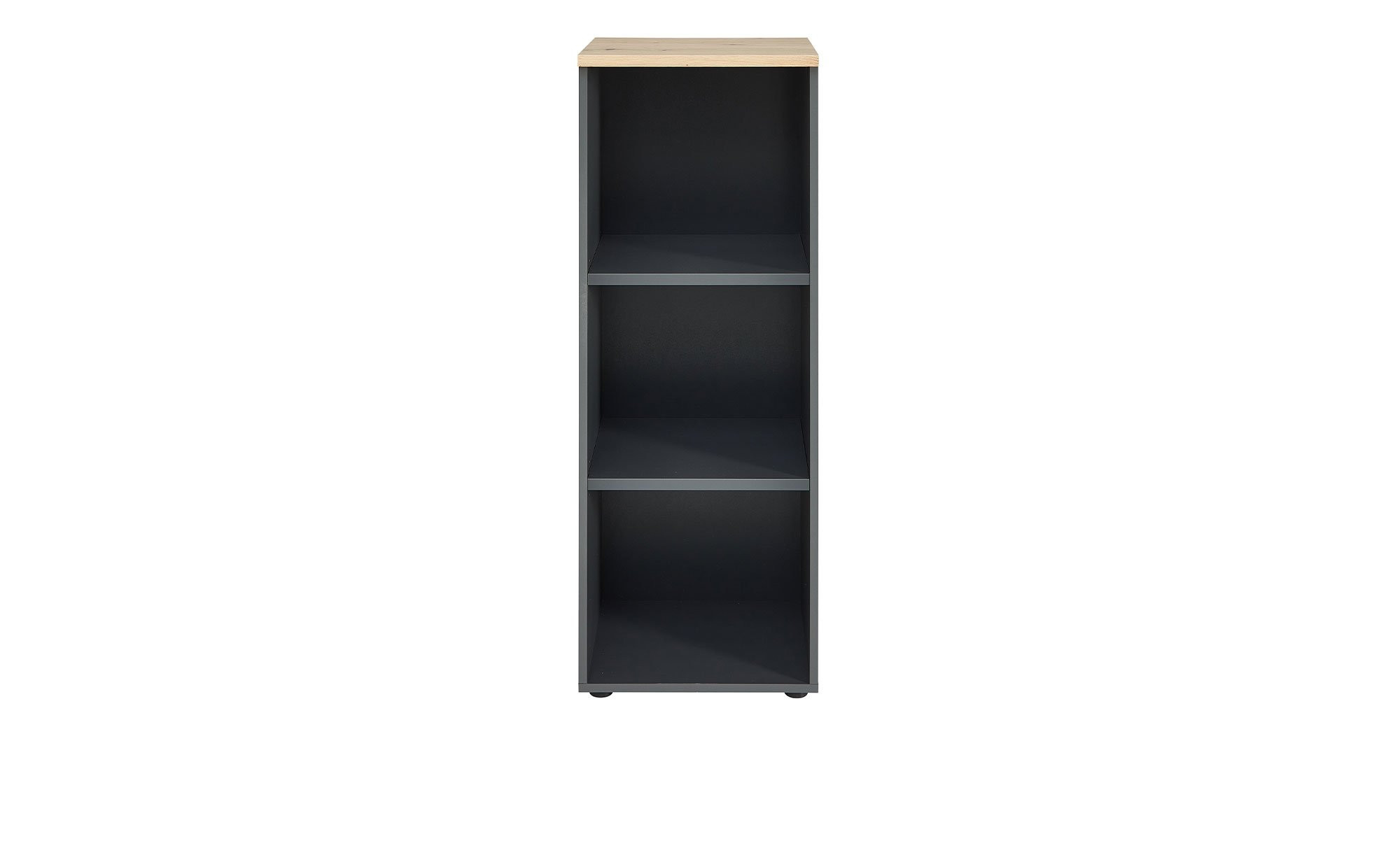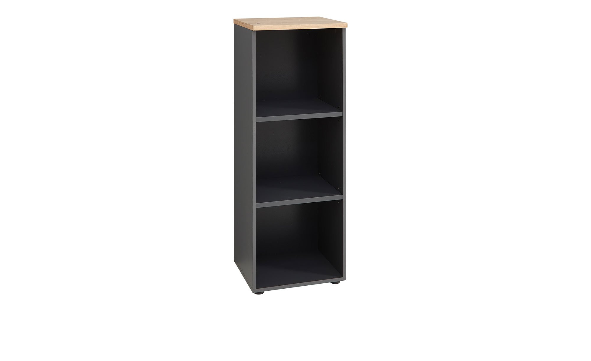 Der Korpus des ca. 45 x 122 x 38 cm großen Regals besteht aus Holzwerkstoff und ist genau wie das Innendekor und die Rückwand in einem ansprechenden Graphit-Ton gestaltet. Passend dazu gibt es schwarze Kunststoffgleiter als Füße. Für einen gelungenen Kontrast sorgt die Deckplatte im Dekor Artisan Eiche.