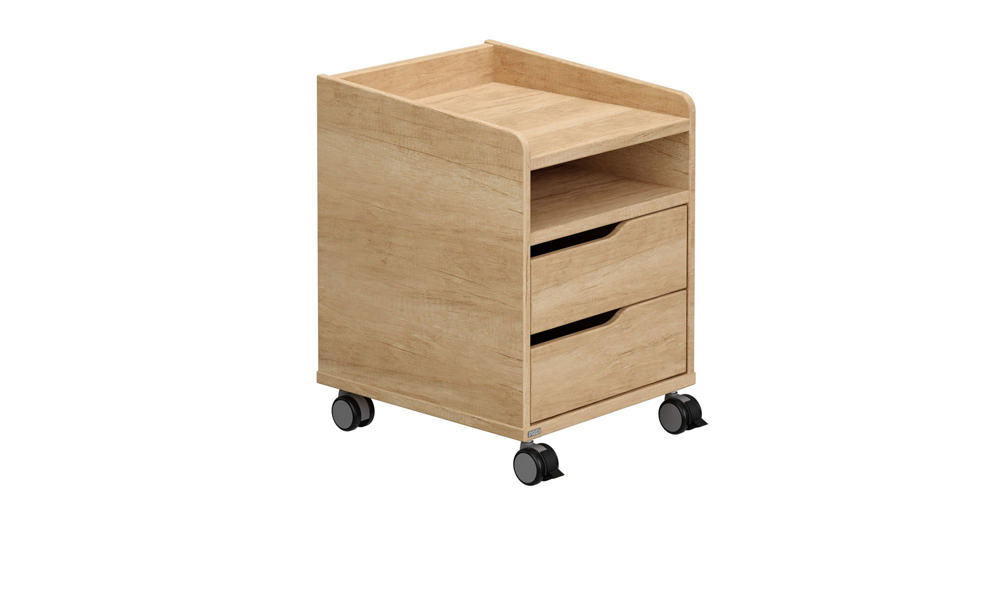 Front und Korpus des ca. 43,3 x 60,5 x 47,6 cm großen Artikels bestehen aus Holzwerkstoff im Dekor Eiche Nebraska. An der Unterseite befinden sich vier schwarze Rollen, von denen zwei bei Bedarf feststellbar sind. Innerhalb eines offenen Fachs und zwei Schubladen mit Soft-Close-Funktion lassen sich diverse Arbeitsmaterialien ordentlich verstauen.
