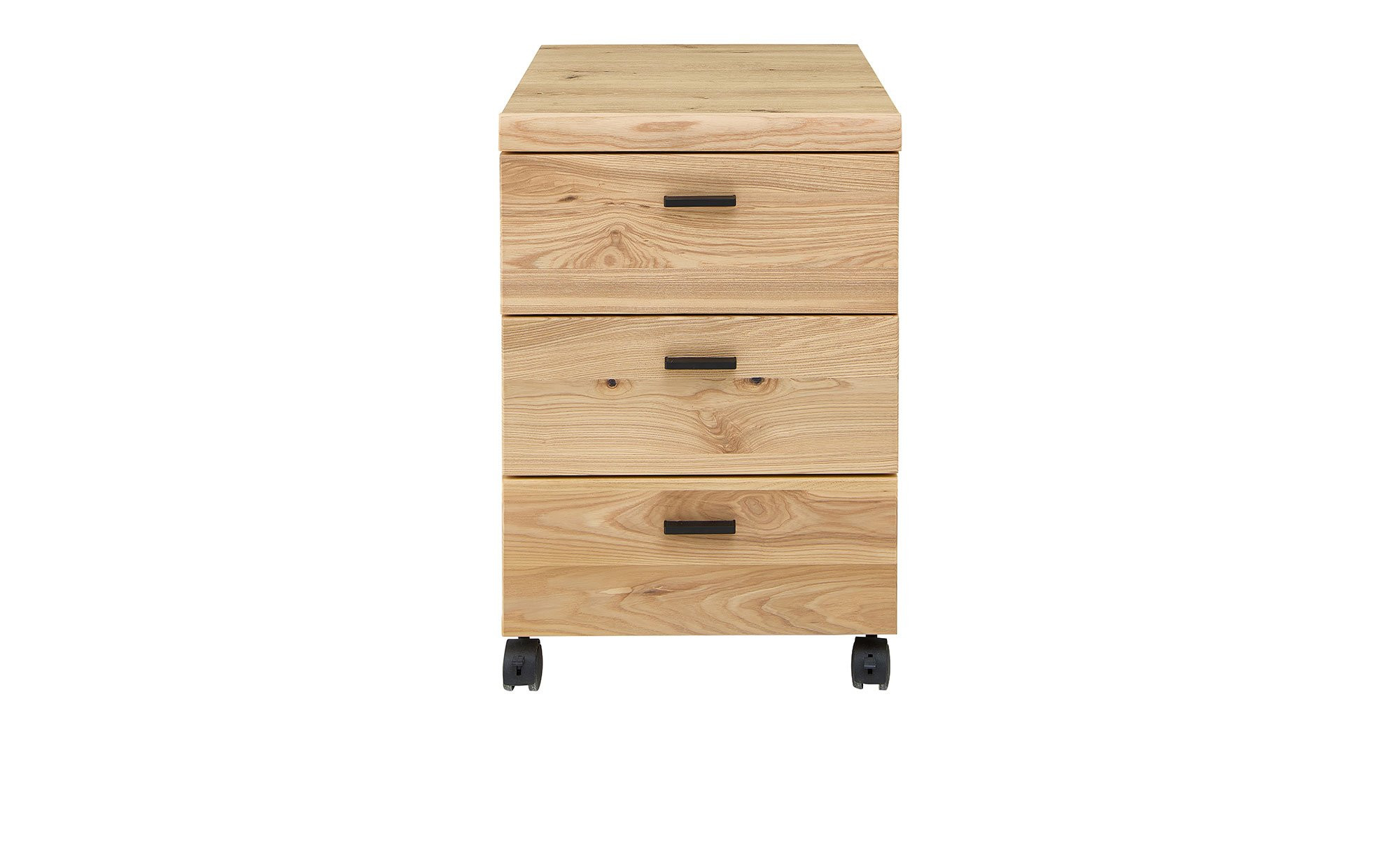 Die Front des ca. 45 x 66 x 55 cm großen Möbelstücks besteht aus massiver Altesche mit gebürsteter Oberfläche. Der Korpus besteht aus Holzwerkstoff mit einer Old Artisan Oak Nachbildung. Schwarz-matte Kunststoffgriffe setzen dazu einen klaren Kontrast. Für die Standfläche können Sie zwischen einem Sockel oder vier schwarzen Rollen (zwei mit Bremse) wählen.
