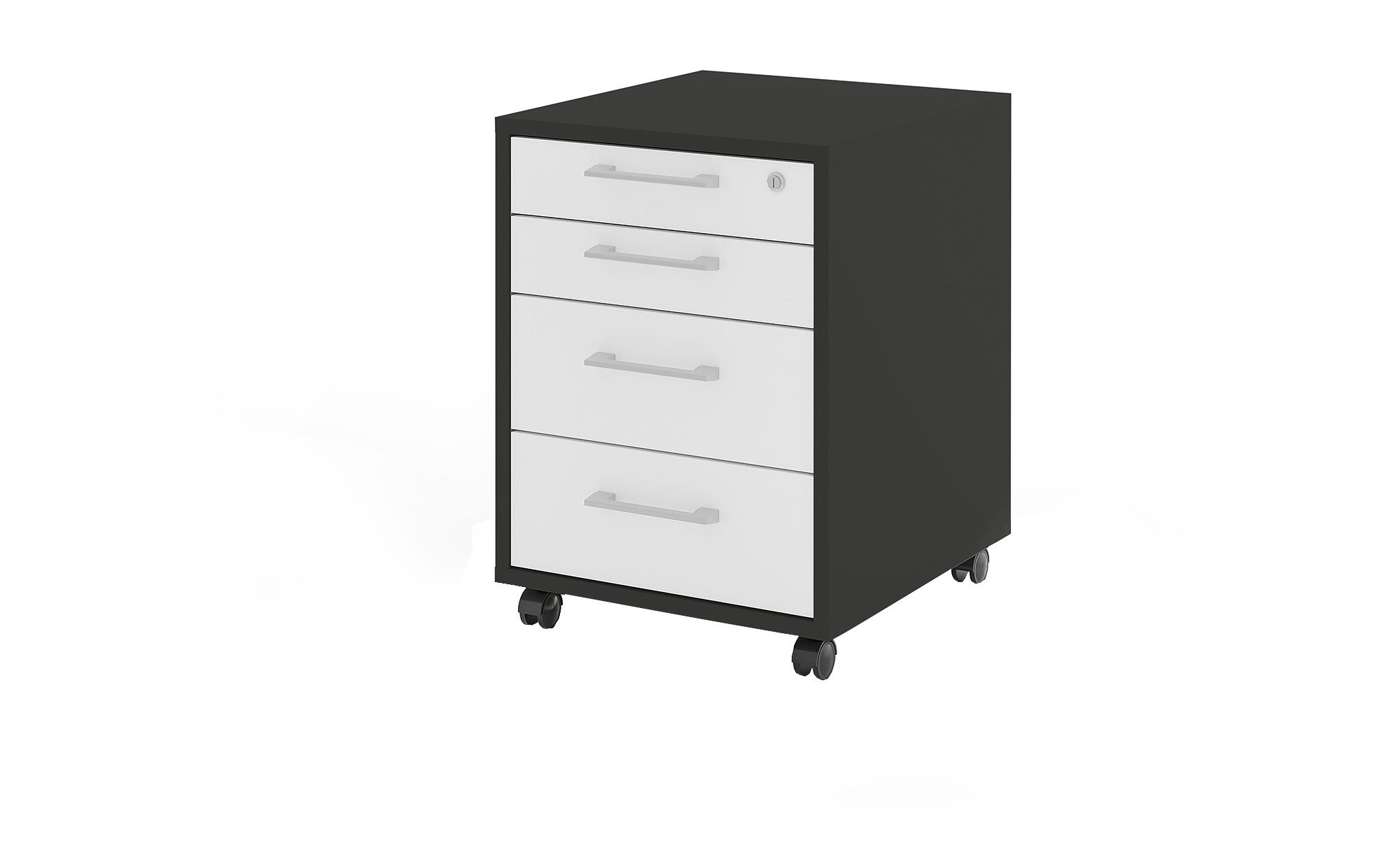Mit Maßen von ca. 46 x 64 x 51 cm passt das Möbelstück perfekt unter Schreibtische oder neben Arbeitsplätze. Front und Korpus bestehen aus Holzwerkstoff. Während letzterer in einem supermatten Anthrazit begeistert, ist die Vorderseite in Ice White Supermatt gehalten. Die Oberflächen sind durch eine Melaminharzbeschichtung vor Abnutzung geschützt. Hochwertige Metallbeschläge sorgen ebenso wie die stabile Dickkante für ein langlebiges Nutzungserlebnis. Als Füße fungieren vier schwarze Kunststoffrollen, die Metallgriffe sind weiß.