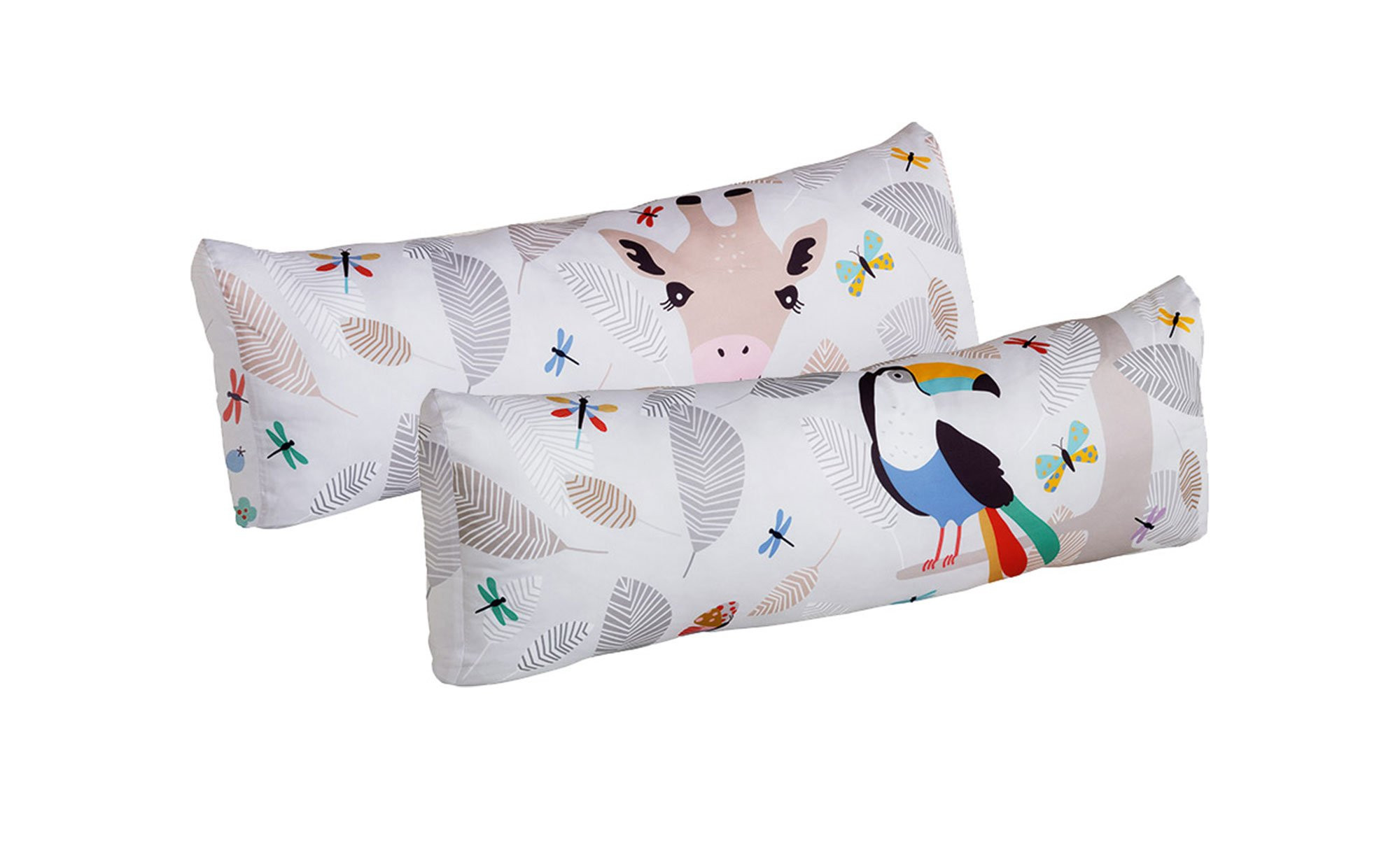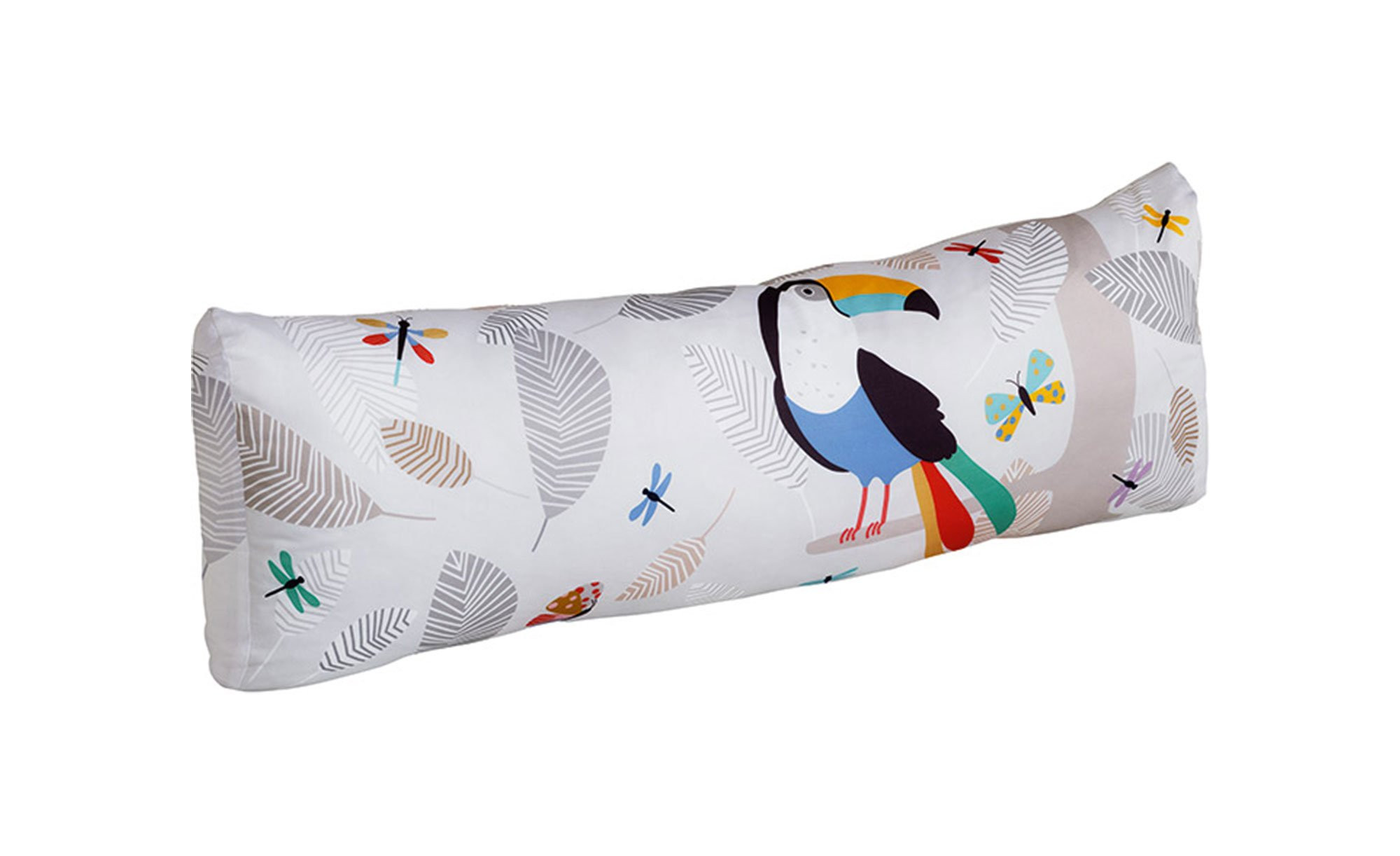 Neben einer süßen Giraffe auf der Vorderseite des ca. 100 x 40 x 25 cm großen Kissens erwartet Sie auf der Rückseite zusätzlich ein bunter Tukan. Der Bezug besteht aus 100 % Baumwolle und kann dank seines Reißverschlusses bei Bedarf abgenommen werden. Waschbar ist der Stoff bei 30 Grad.