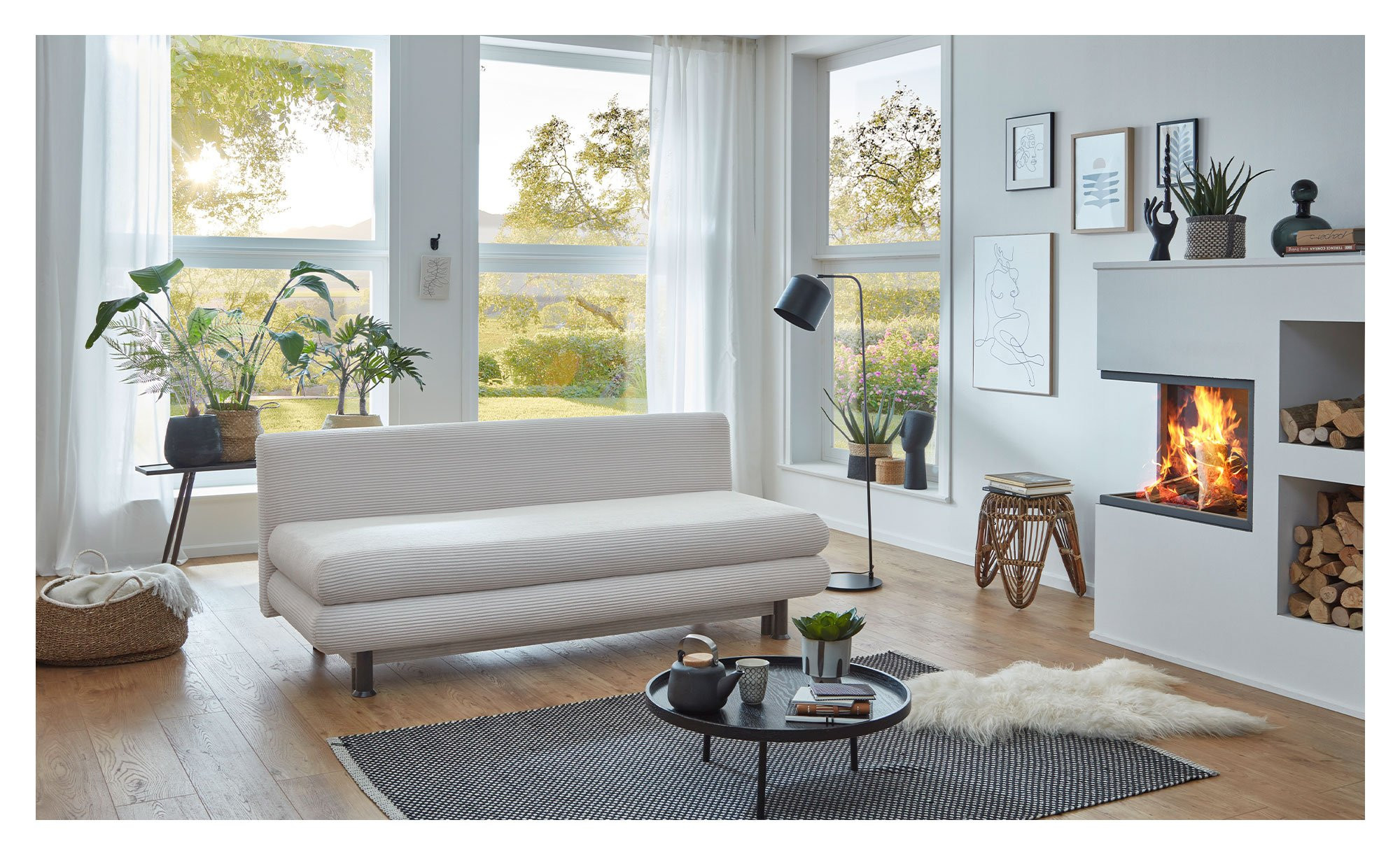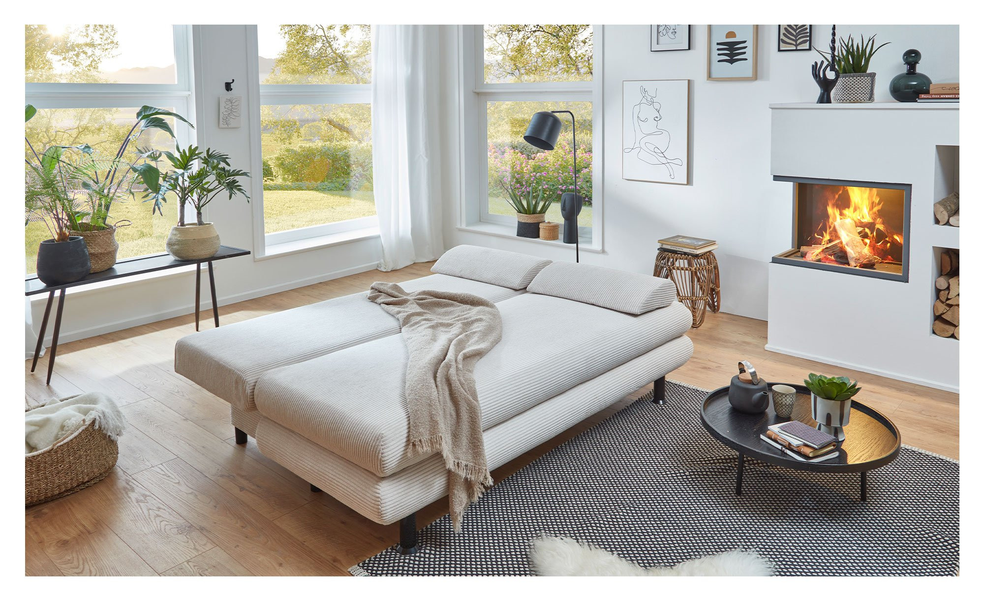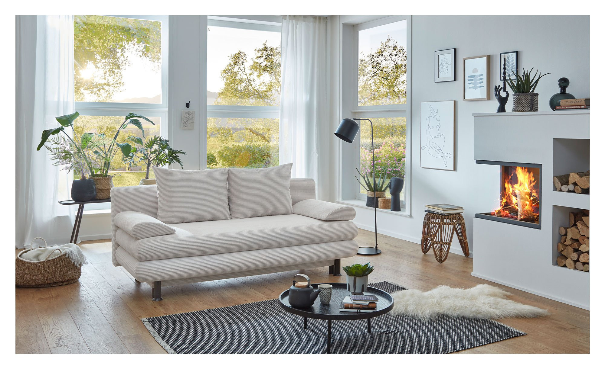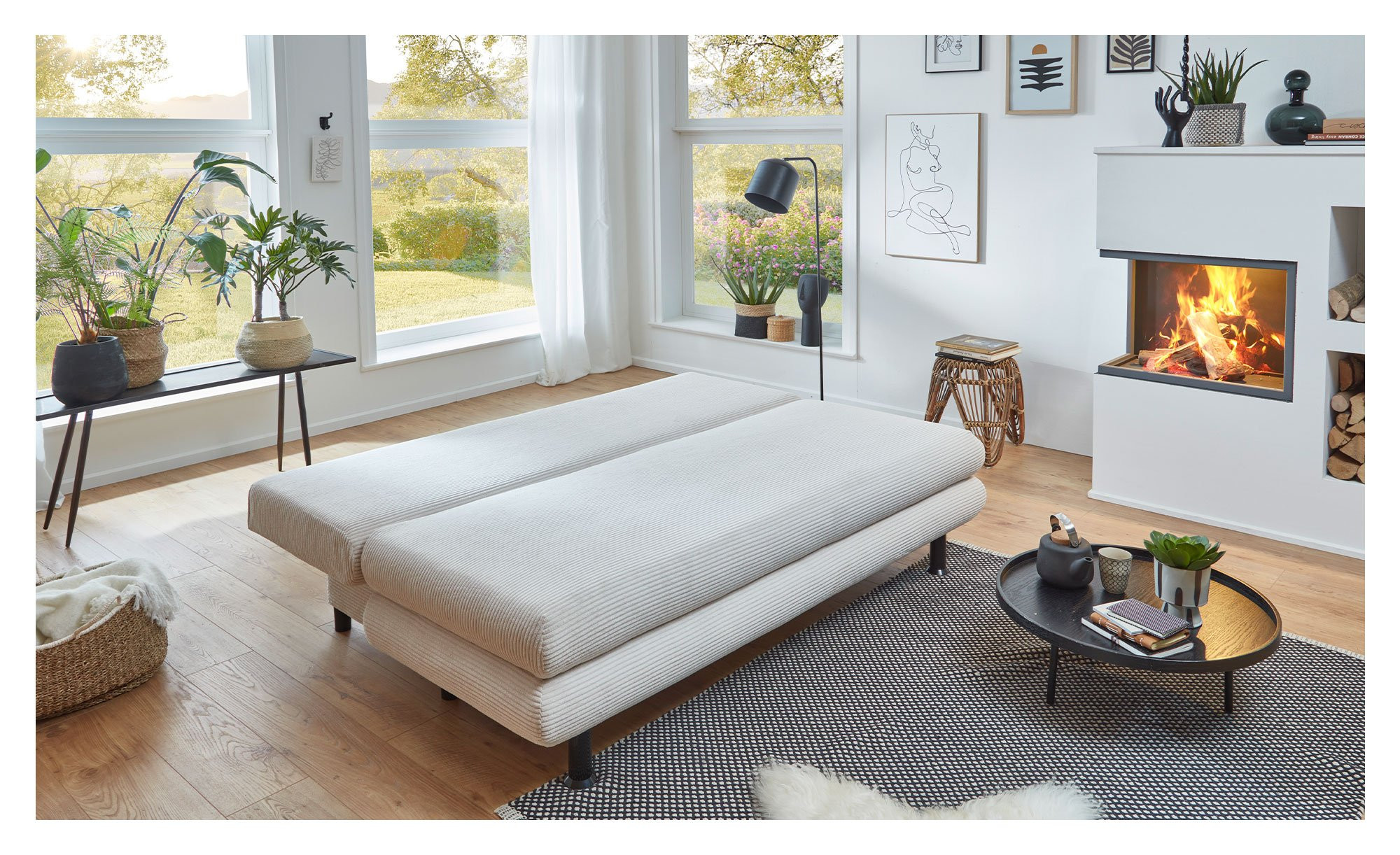 Das Möbelstück ist ca. 196 x 92 x 93 cm groß und mit einem Natur-farbigen Bezugsstoff aus Breitcord versehen, der auch den Rücken schmückt und Ihnen verschiedene Stellmöglichkeiten bietet. Auch die beiden mitgelieferten Rücken- und Armlehnkissen sind mit diesem Stoff bezogen. Abgerundet wird das Bild von schwarzen Kunststofffüßen.