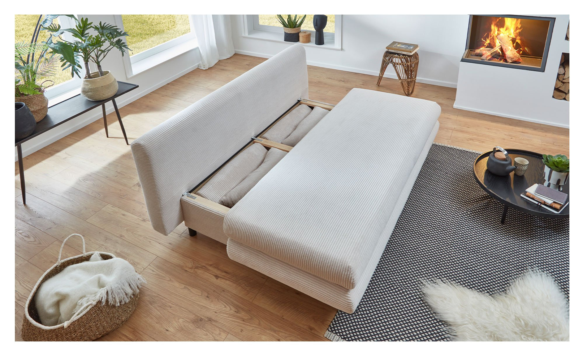 Im Sitzbereich erwartet Sie eine bequeme Polsterung mit Federkern und Komfortschaum mit Polyesterwatte. Die Sitztiefe beträgt mit Kissen ca. 54 cm, ohne ca. 76 cm. Natürlich lässt sich bei Bedarf auch jederzeit die ca. 140 x 188 cm umfassende Liegefläche ausklappen und es gibt praktischen Stauraum.