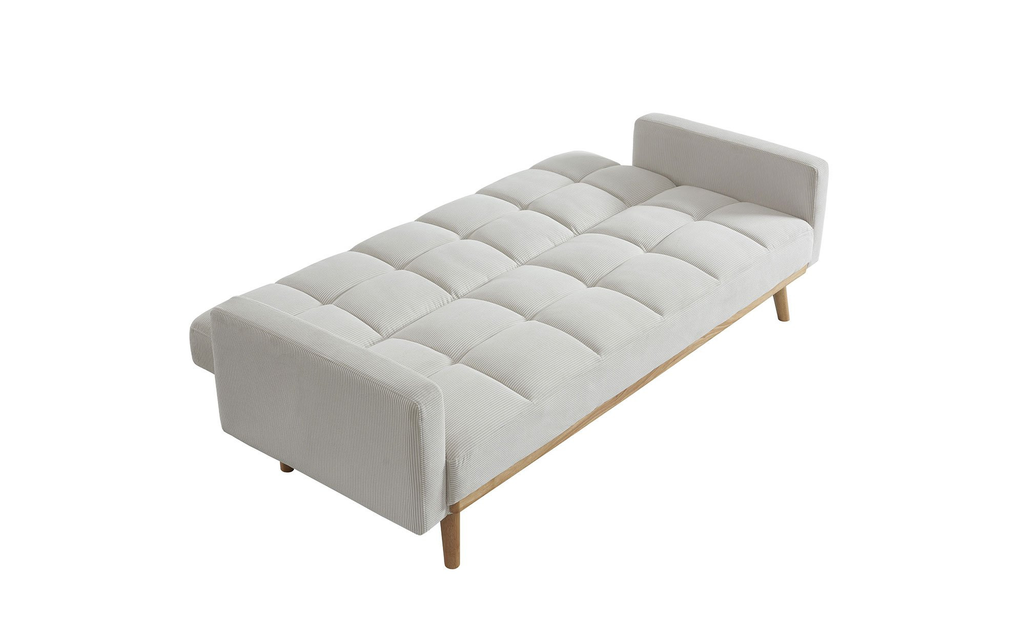 Mit seiner Breite von ca. 212 cm und einem Stoff-Bezug aus 100 % Polyester im Ton Creme fügt sich das Sofa stilvoll in jedes Ambiente. Dank des bezogenen Rückens können Sie es zudem vollkommen flexibel im Raum platzieren. Eine moderne Steppung und die ca. 20 cm hohen Füße aus stabilem Gummibaum-Holz runden den Look ab.