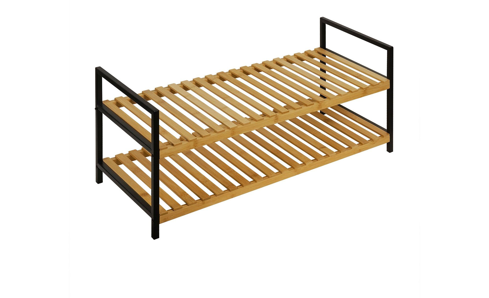 Der Artikel misst ca. 70 x 32 x 30 cm. Seine Basis bildet ein schwarzes Gestell aus pulverbeschichtetem Metall, das zuverlässig zwei Bambus-Böden in natürlicher Färbung trägt. Hier finden diverse Schuhpaare den idealen Platz!