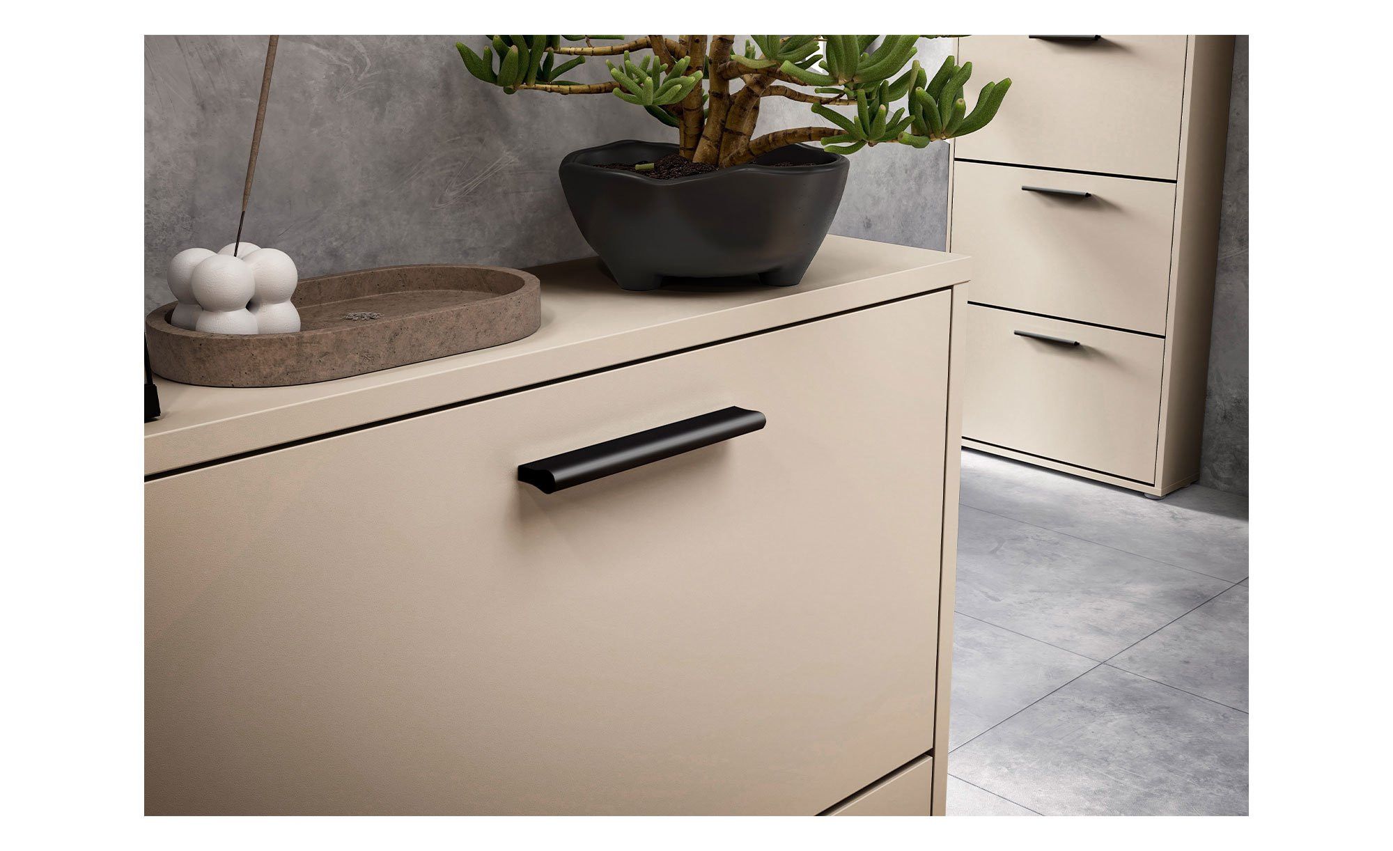 Das ca. 59 x 103 x 17 cm große Möbelstück wurde aus Holzwerkstoff gefertigt und begeistert in einem edlen Kaschmir-Ton. Schwarze Stangengriffe und Füße aus Kunststoff setzen gelungene Akzente. Zur Unterbringung von etwa sechs Paar Schuhen stehen Ihnen drei geräumige Klappen zur Verfügung.