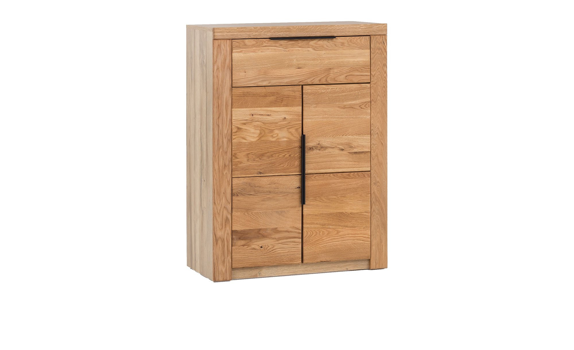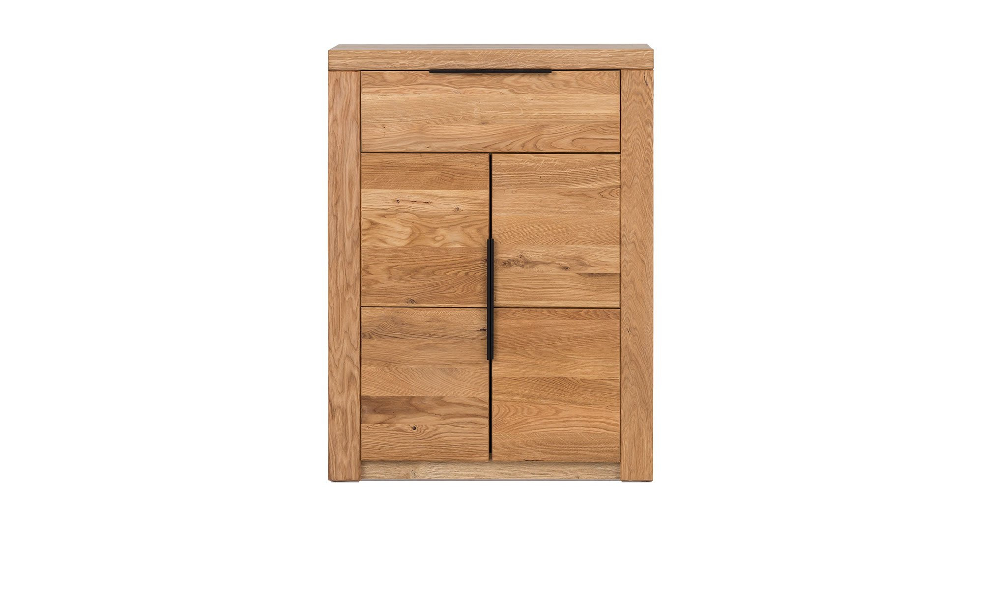 Das teilmassive Möbel ist in einem Trendholz Eiche-Look gestaltet und ca. 80 x 107 x 40 cm groß. Es verfügt über einen Korpus inklusive Rückwand aus Holzwerkstoff im Dekor Eiche. Außerdem dürfen Sie sich auf eine geölte Massivholz-Front mit durchgehenden Lamellen freuen. Auch das Innendekor ist eichefarbig, außen wurden schwarze Griffe aus Metall integriert.