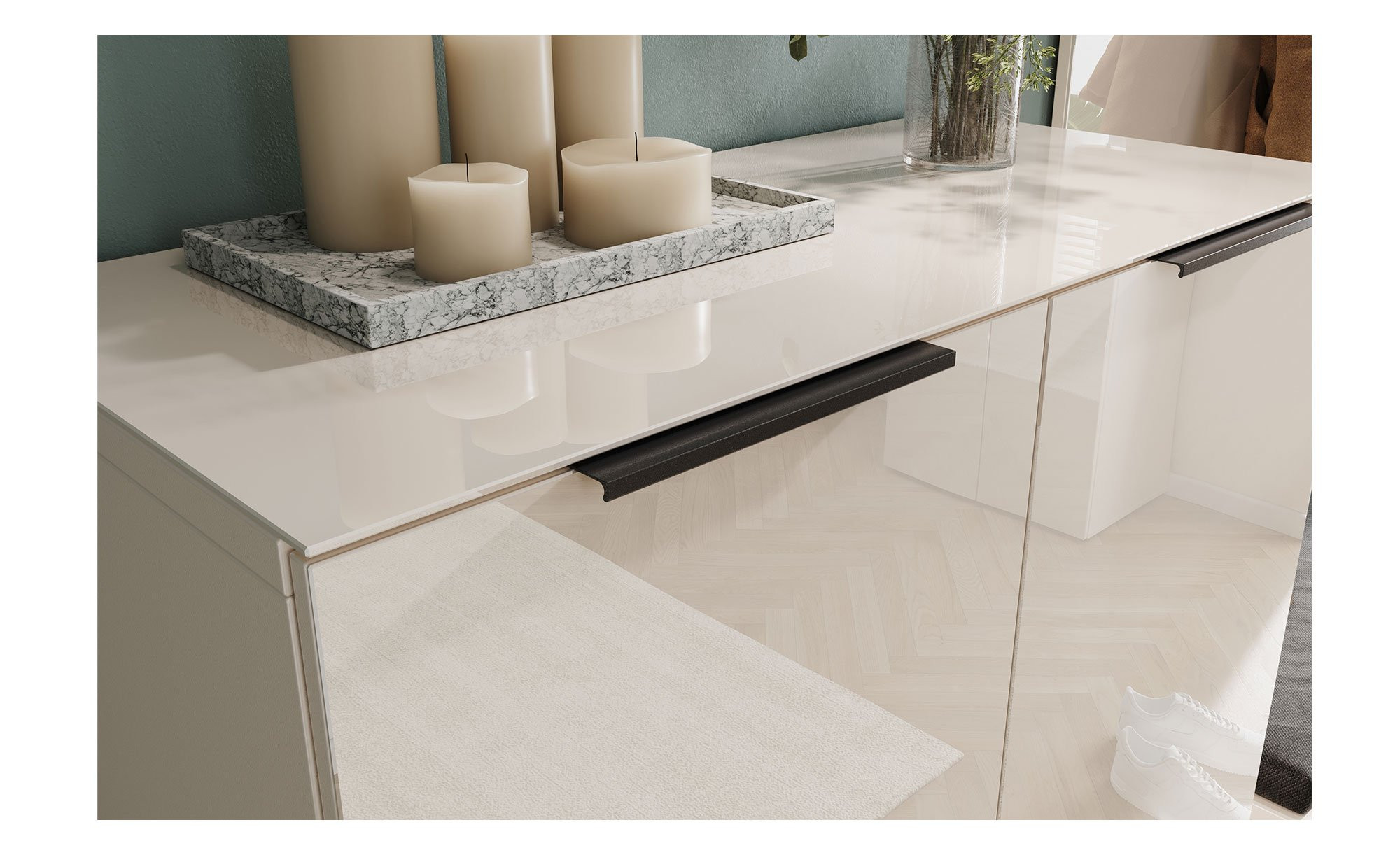An der Vorderseite des Artikels empfängt Sie hinterlackiertes Glas. Einscheibensicherheitsglas mit hoher Widerstandskraft fungiert darüber hinaus als mit max. 20 kg belastbare Auflage. Neben den schwarzen Kunststofffüßen sorgen auch pulverbeschichtete Metallgriffe in mattem Schwarz für einen gelungenen Kontrast.