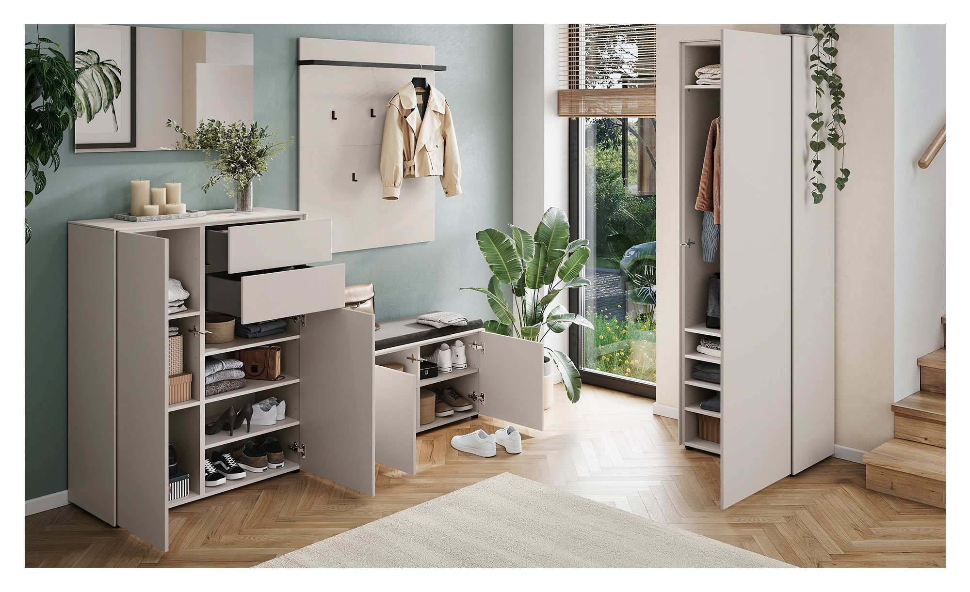 Der Schuhschrank Luna versorgt Sie in Ihrem Eingangsbereich auf stilvolle Weise mit einem großen Platzangebot. Front und Korpus des Möbelstücks bestehen aus Holzwerkstoff in der Farbe Kaschmir. Eine Beschichtung aus Melaminharz sorgt für kratzfeste und widerstandsfähige Oberflächen, zusätzlich dürfen Sie sich auf stoß- und schlagfeste Kanten freuen. Die schwarzen Füße gewährleisten ihrerseits einen stabilen Stand.