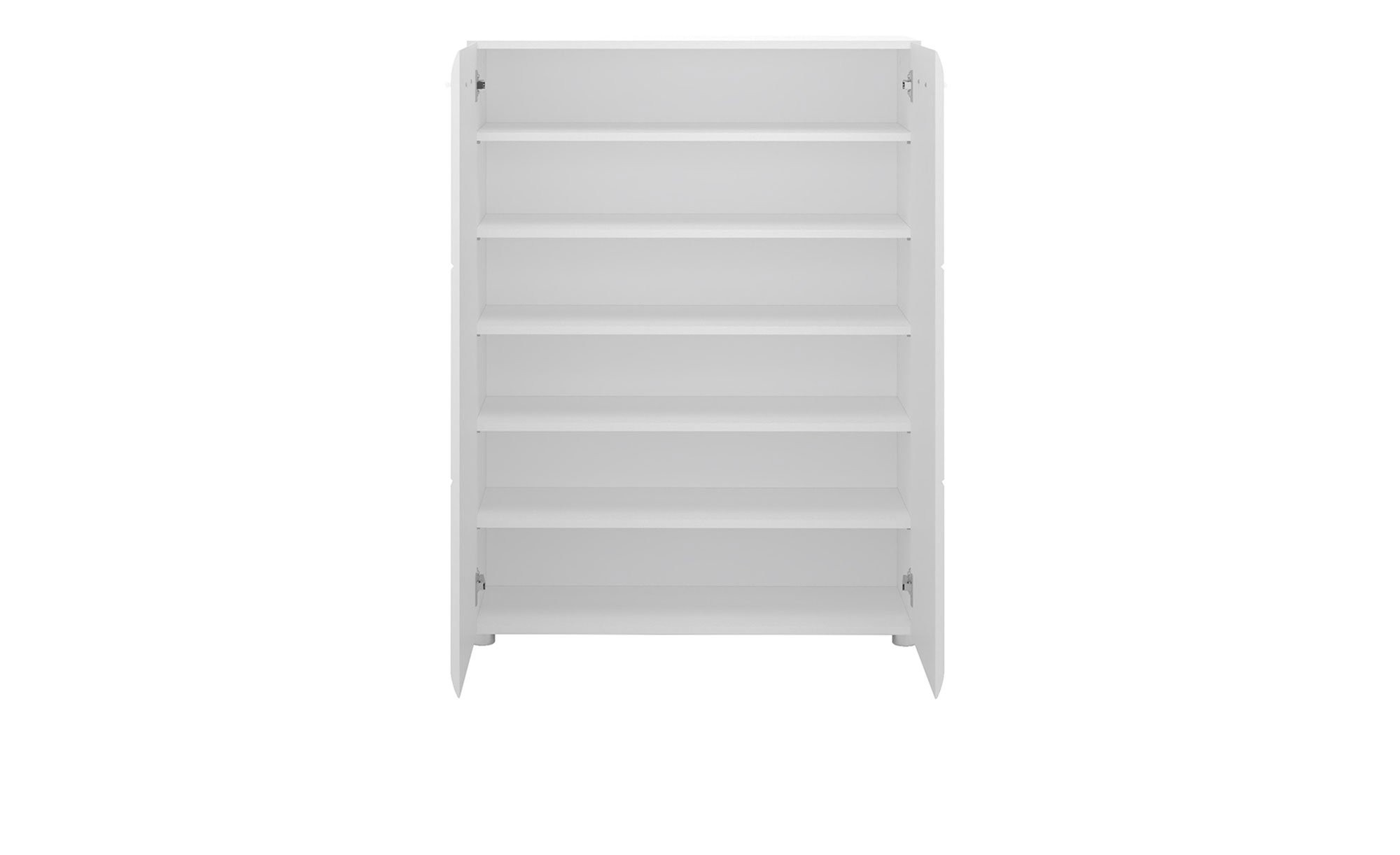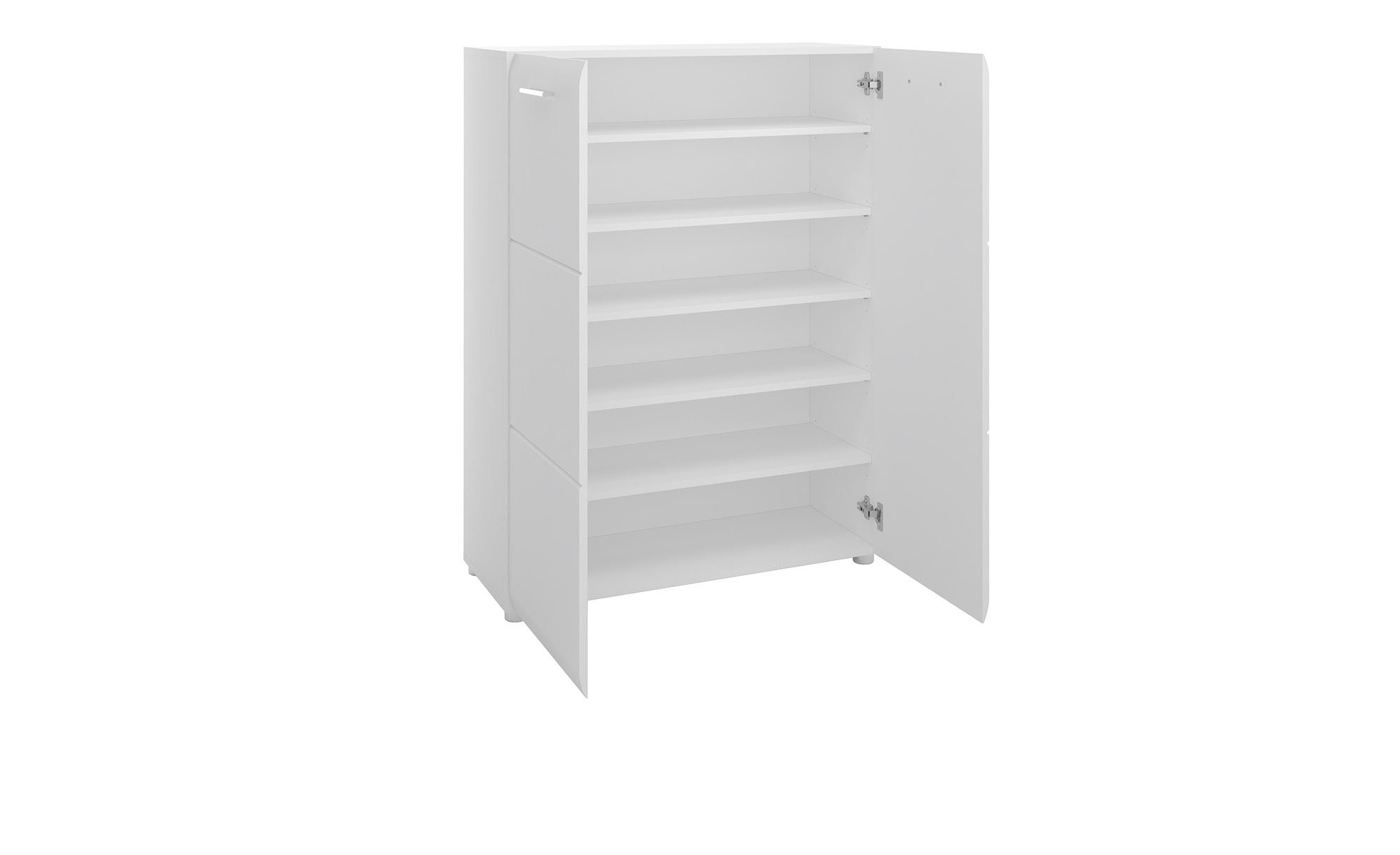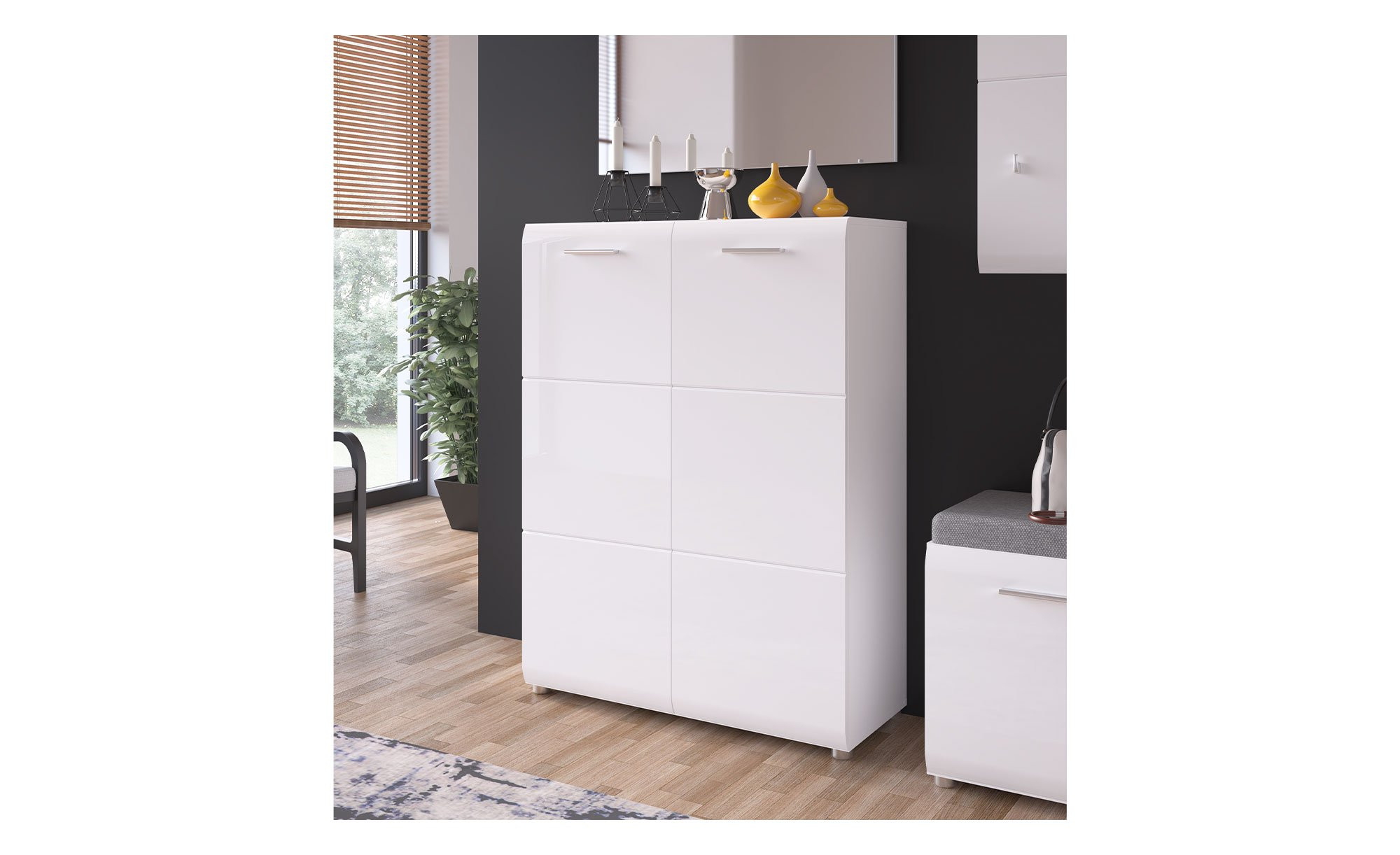 Mit seinen 5 Einlegeböden bietet Mestre optimalen Stauraum für Ihre Schuhe. Der komplette Schuhschrank ist in einem weißen Farbton gehalten und die Front ist in einer edlen Hochglanzausführung.