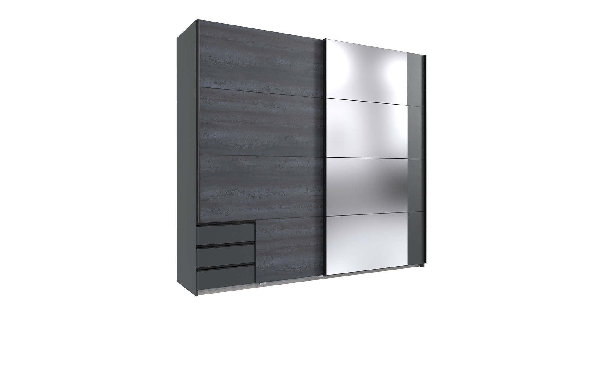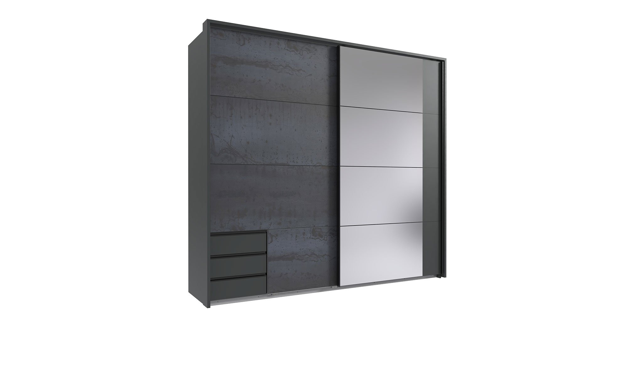 Das ca. 225 x 208 x 65 cm große Möbelstück wurde aus Holzwerkstoff gefertigt und besticht an seiner Vorderseite durch eine ansprechende Digi-Steel-Optik. Am Korpus des Schranks findet sich hingegen ein elegantes Graphit, während der Innenbereich in stilvollem Line Grey erstrahlt. Eine schwarze Kunststoffgriffleiste rundet das Design harmonisch ab.