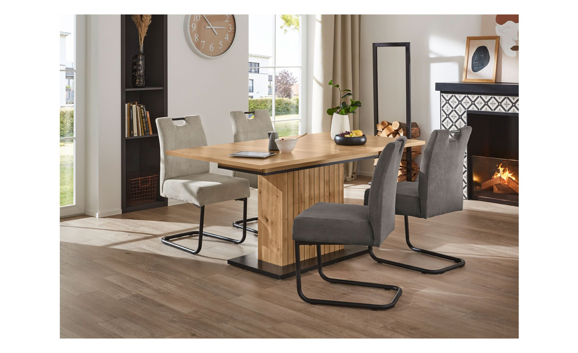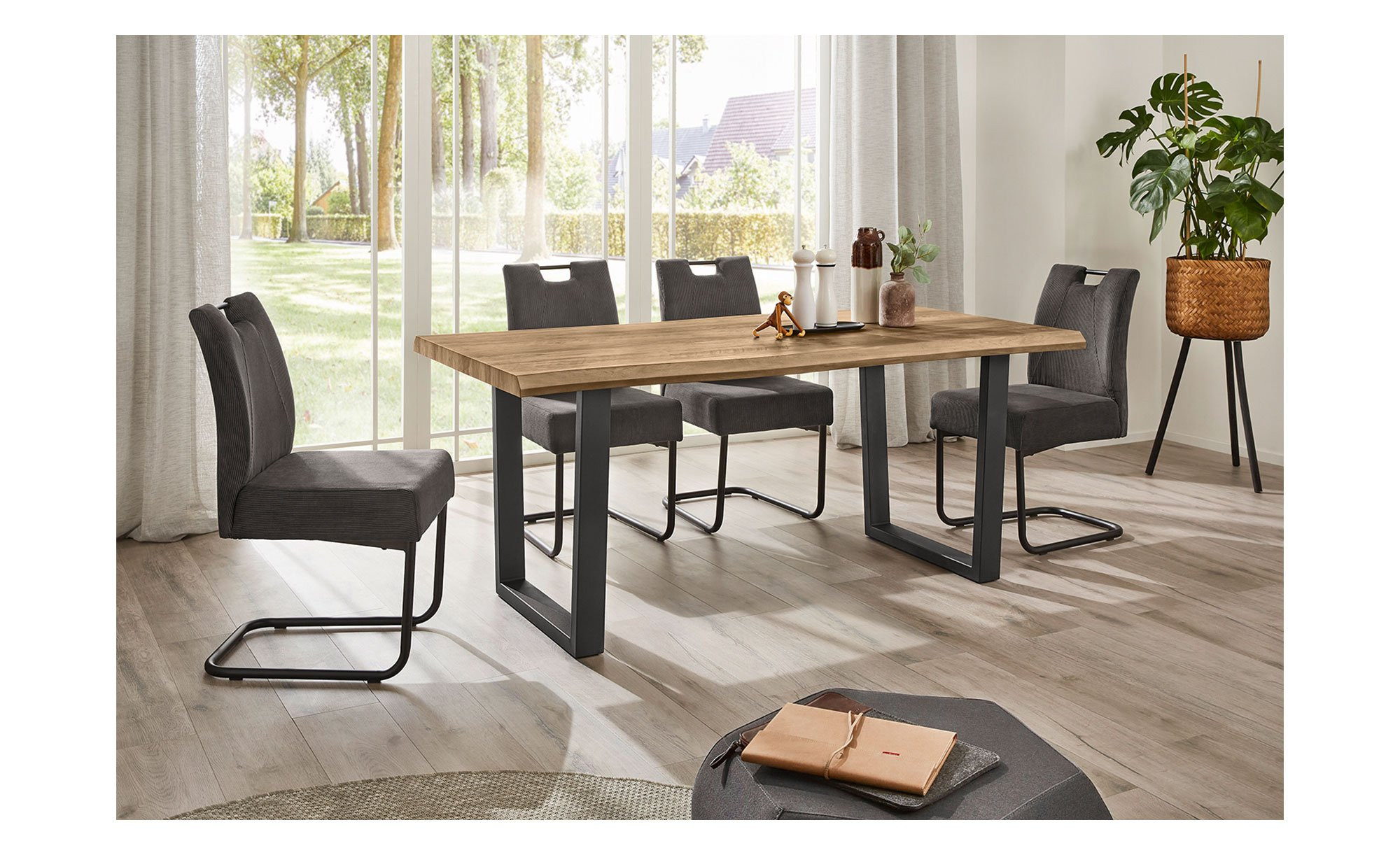 Der Cordstoff-Bezug des Stuhls besteht aus 100 % Polyester. Mit der Farbe Anthrazit passt er hervorragend zum schwarzen Rundrohr-Gestell aus Metall. Oben an der Rückenlehne wurde zusätzlich ein praktischer Handgriff integriert.