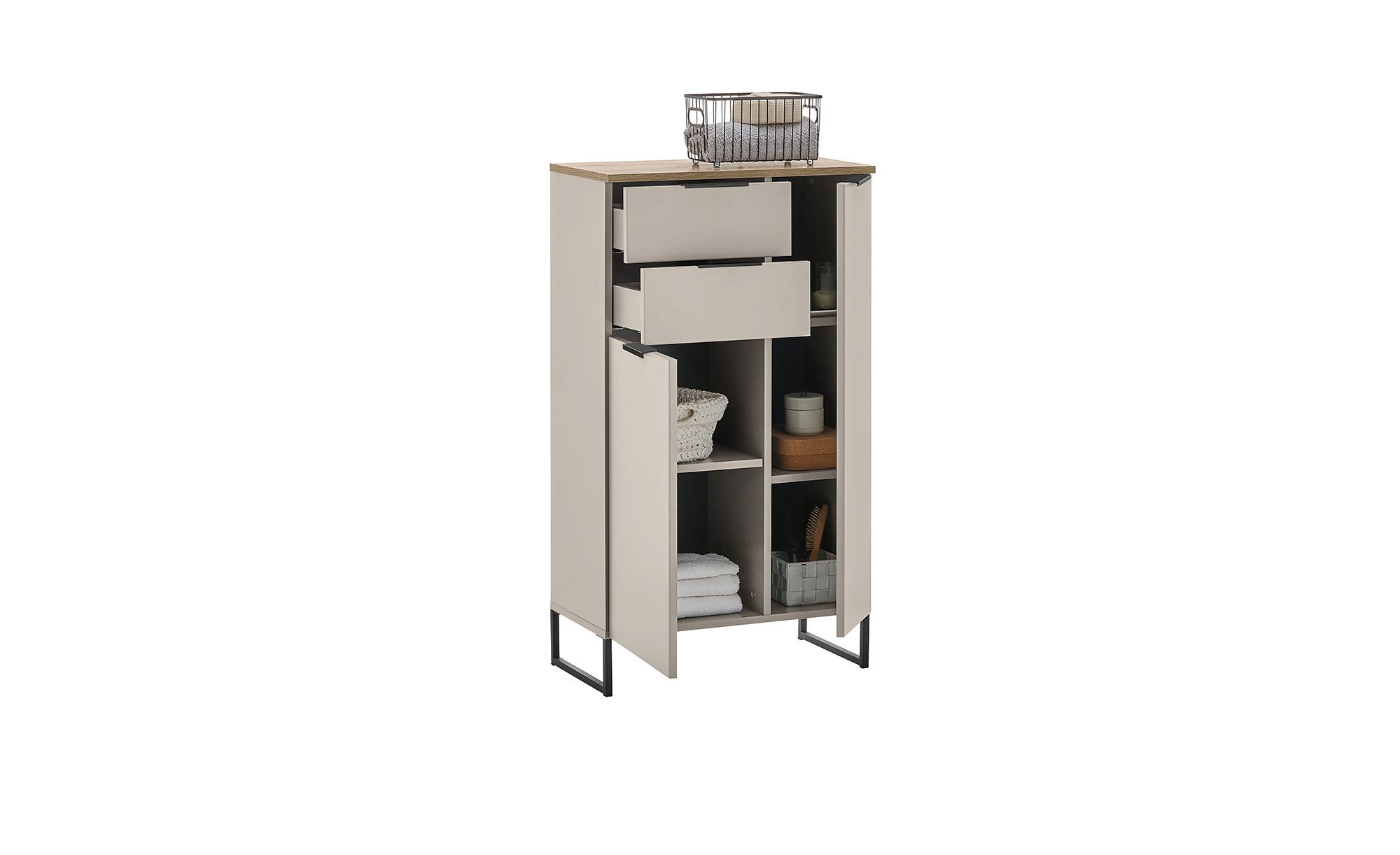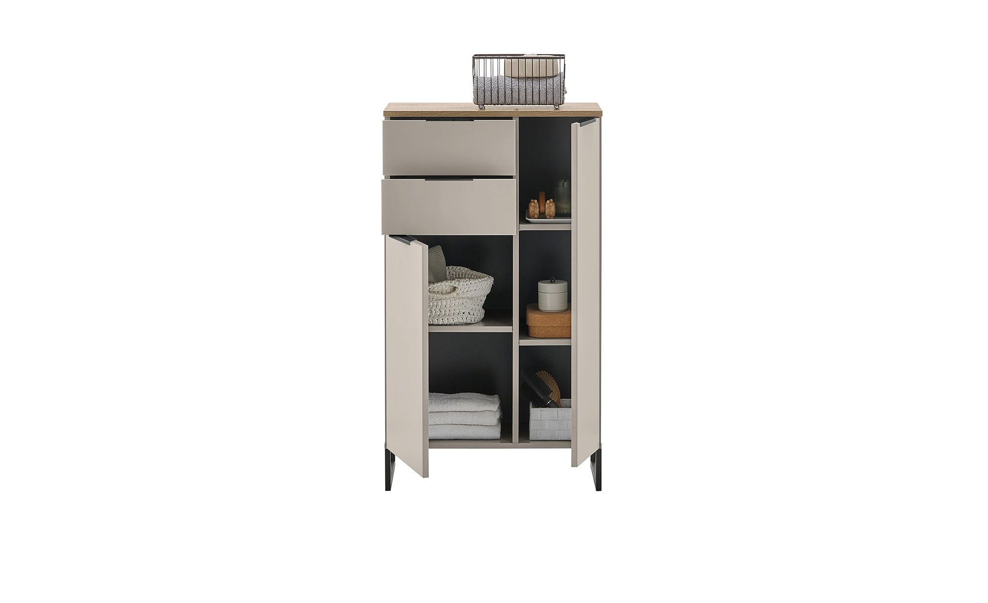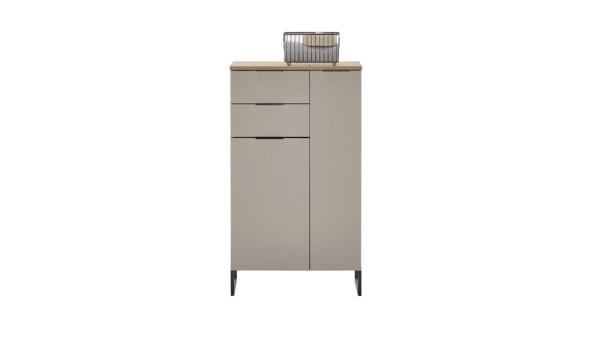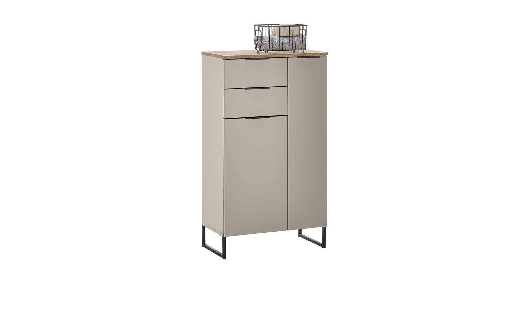 Der ca. 60 x 106 x 32 cm große Artikel besteht aus Holzwerkstoff. Er ist am Korpus und der Front im Farbton Kaschmir gehalten, lediglich die Oberplatte hebt sich davon im natürlichen Dekor Evoke Eiche ab. Einen besonders modernen Akzent erzeugen die Griffleisten und Füße aus schwarzem Metall.