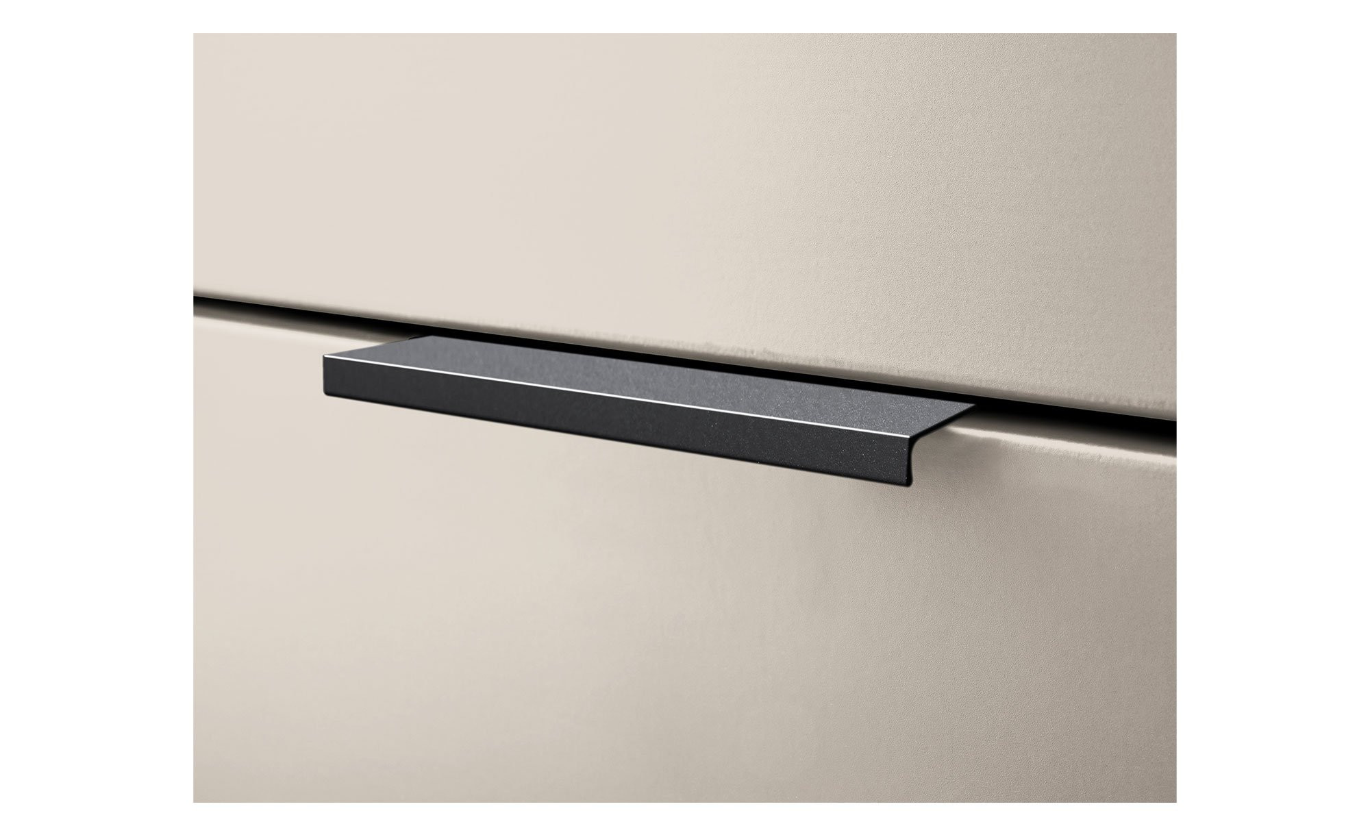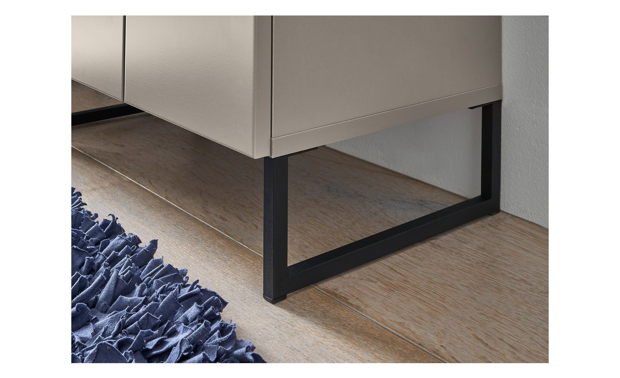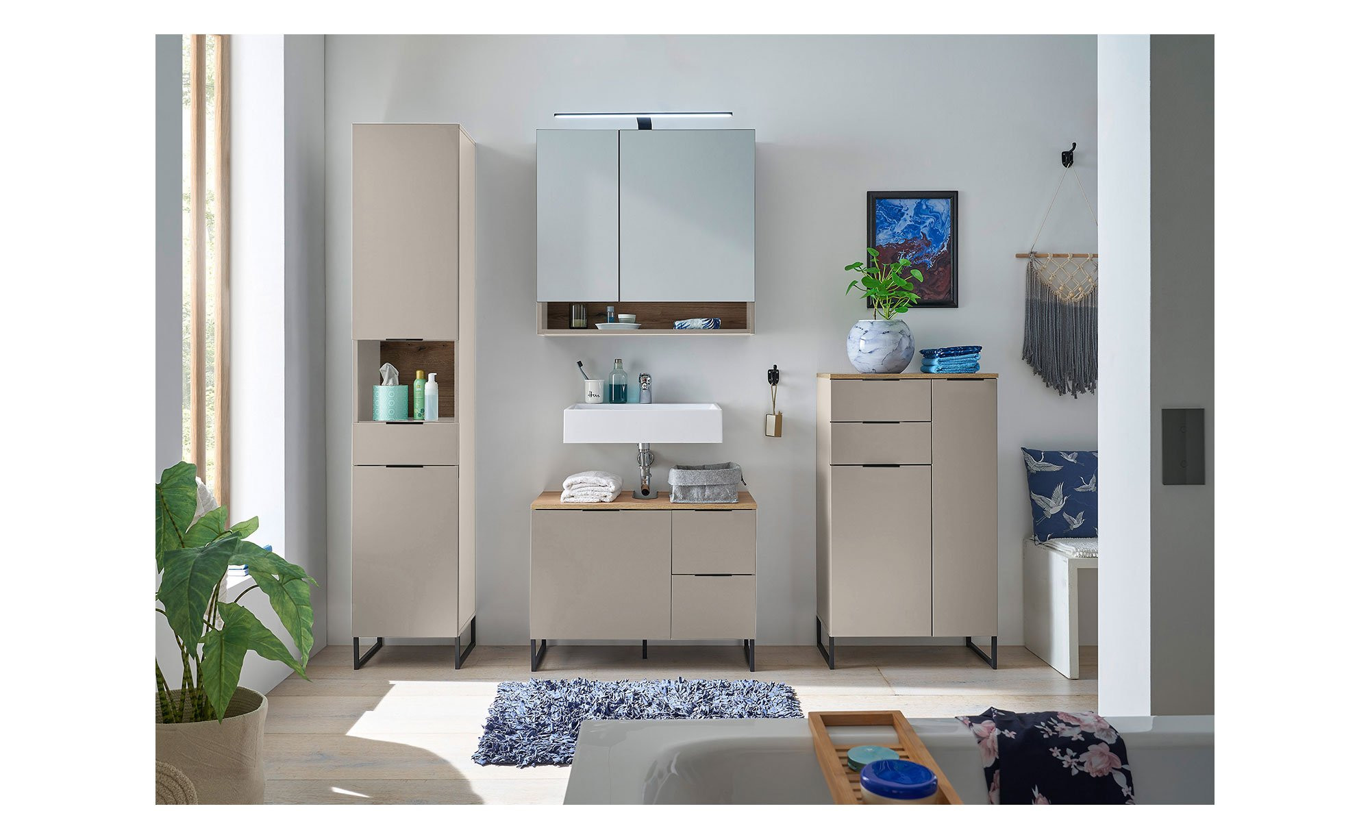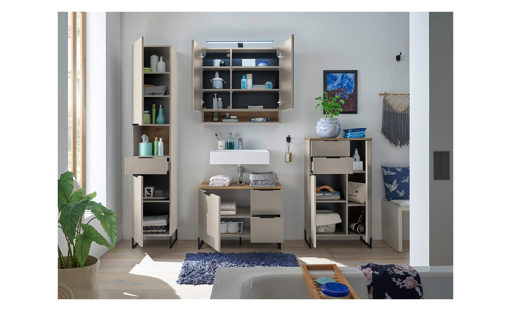 Der ca. 60 x 106 x 32 cm große Artikel besteht aus Holzwerkstoff. Er ist am Korpus und der Front im Farbton Kaschmir gehalten, lediglich die Oberplatte hebt sich davon im natürlichen Dekor Evoke Eiche ab. Einen besonders modernen Akzent erzeugen die Griffleisten und Füße aus schwarzem Metall.