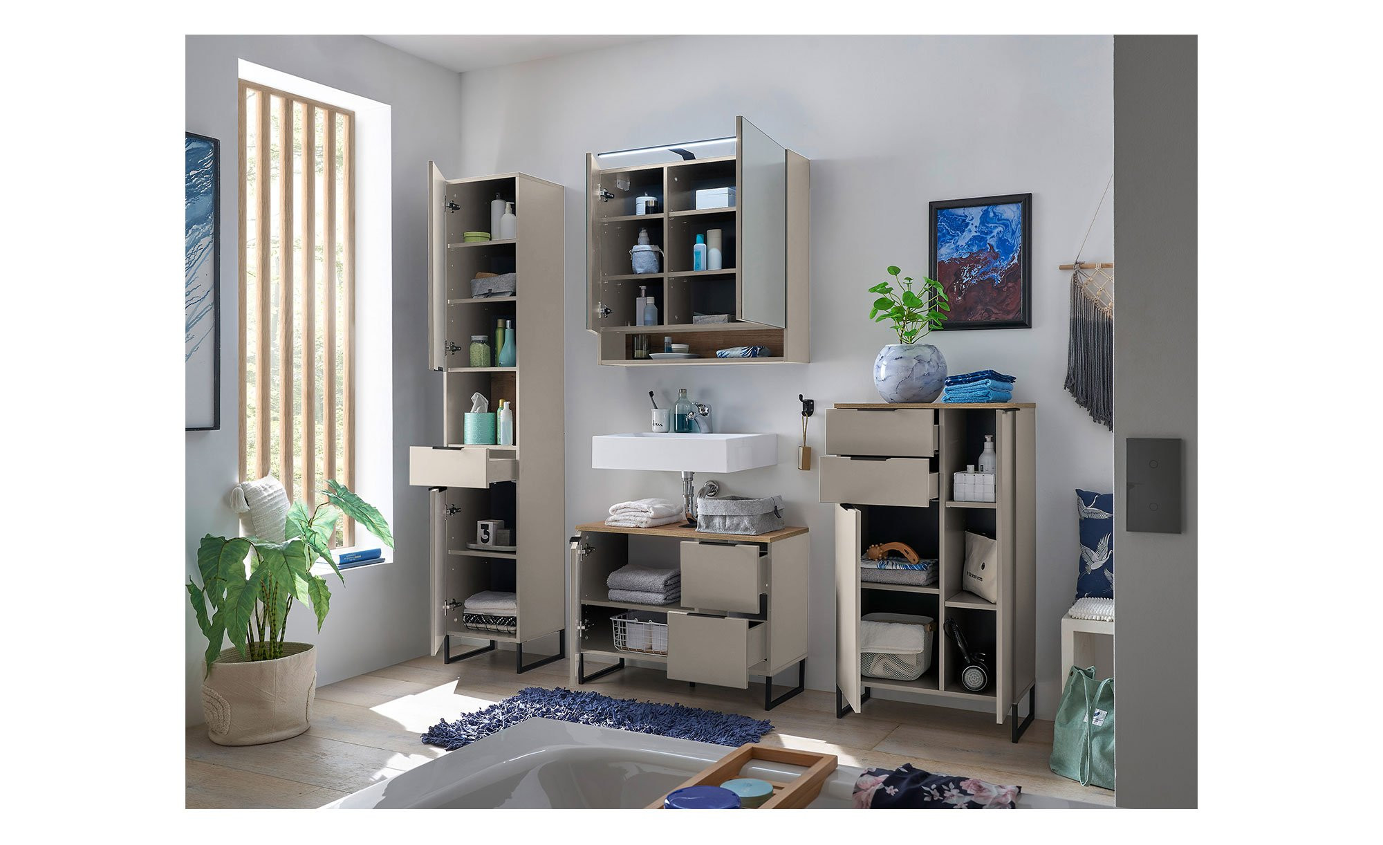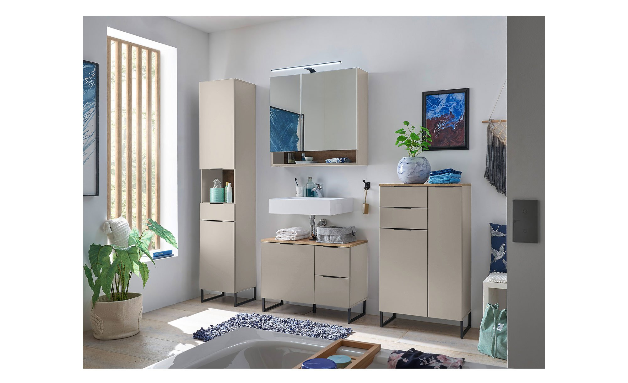 Platzsparend und elegant: Unser Seitenschrank Djerba schafft Struktur und eine besondere Wohlfühlatmosphäre in Ihrem Badezimmer.