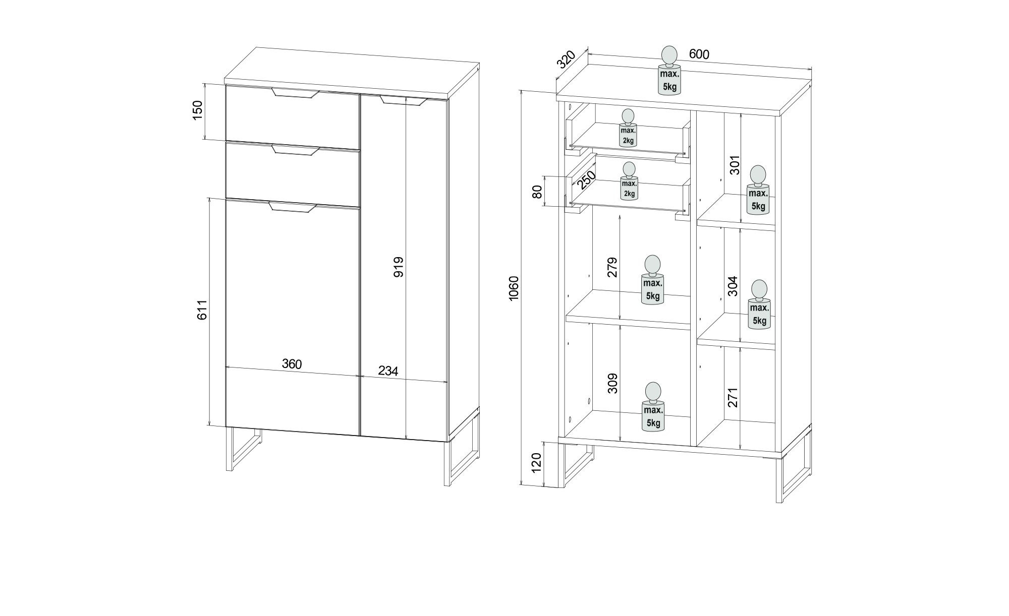 Für ein praktisches Stauraum-Angebot sorgen neben zwei Soft-Close-Schubkästen auch die beiden gedämpften Türen des Möbelstücks. Hinter ihnen erwarten Sie drei Böden zum Verstauen kleiner und größerer Utensilien.