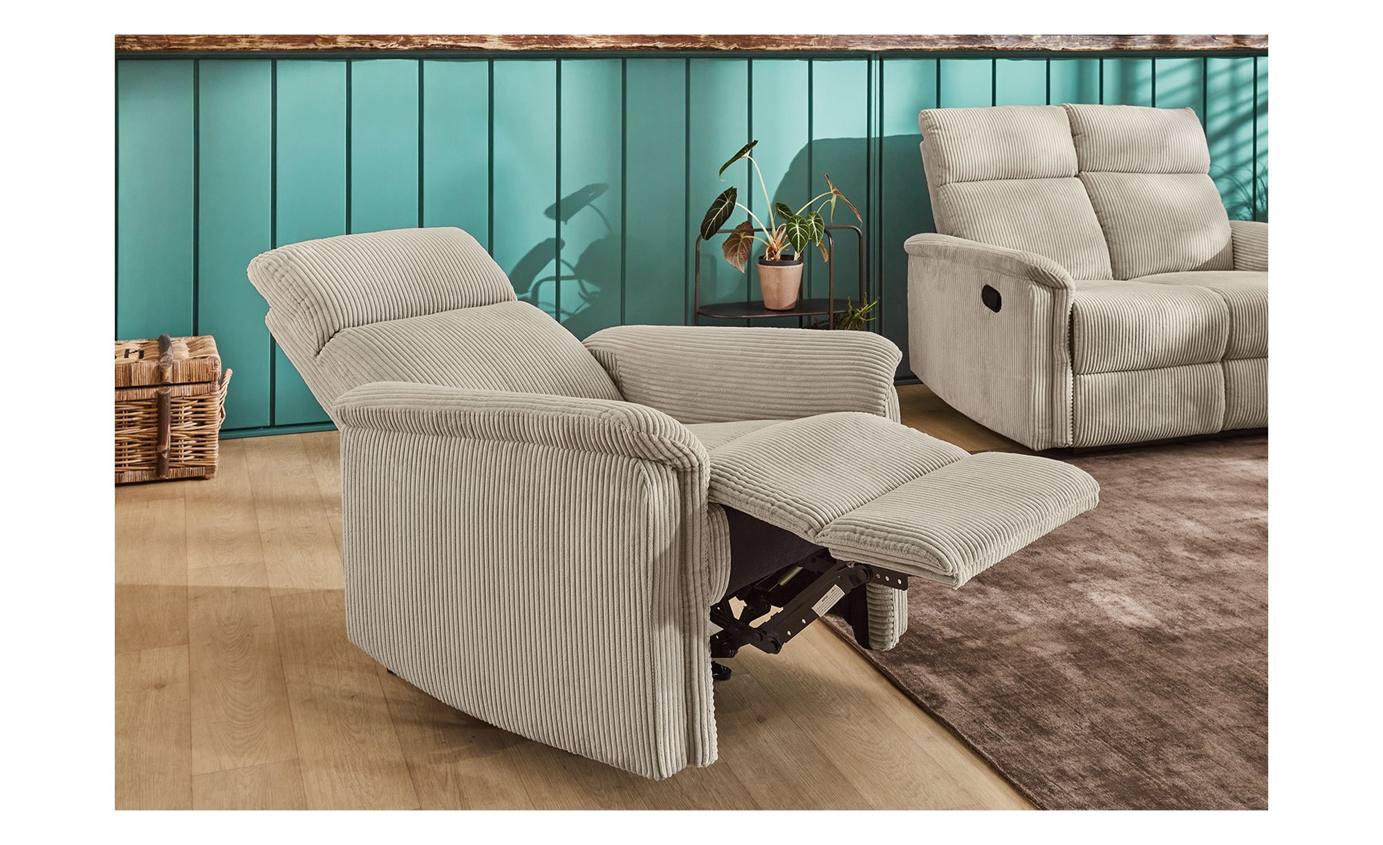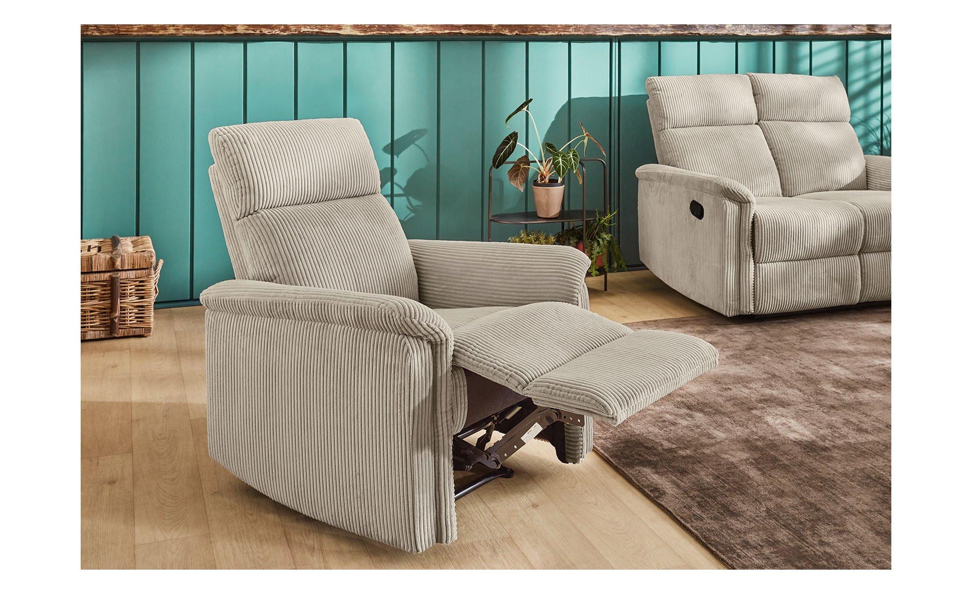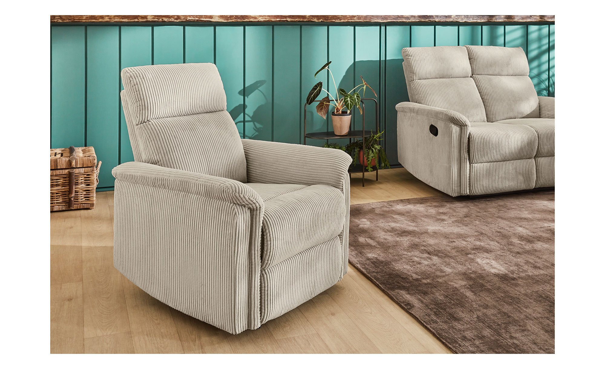 Das Möbelstück ist ca. 78 x 100 x 93-165 cm groß und inklusive Rücken mit einem Cord-Stoff bezogen. Dieser besteht aus 100 % Polyester und bildet mit der Farbe Light Greige einen perfekten Kontrast zu den schwarzen Kunststofffüßen.