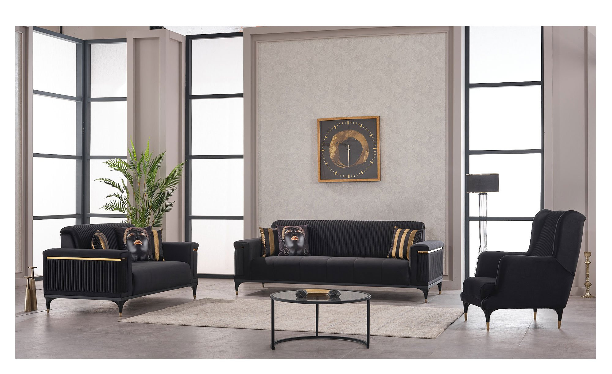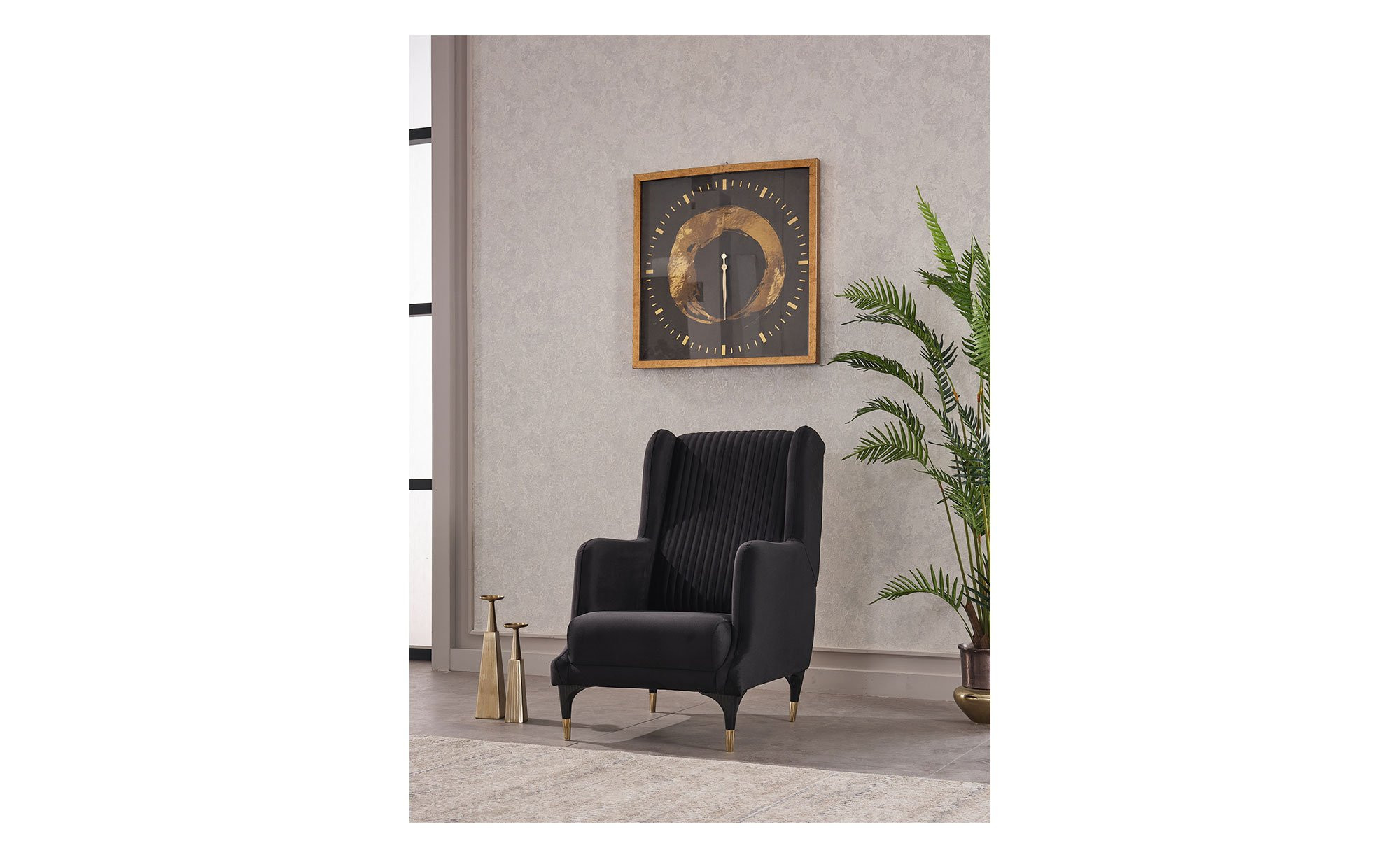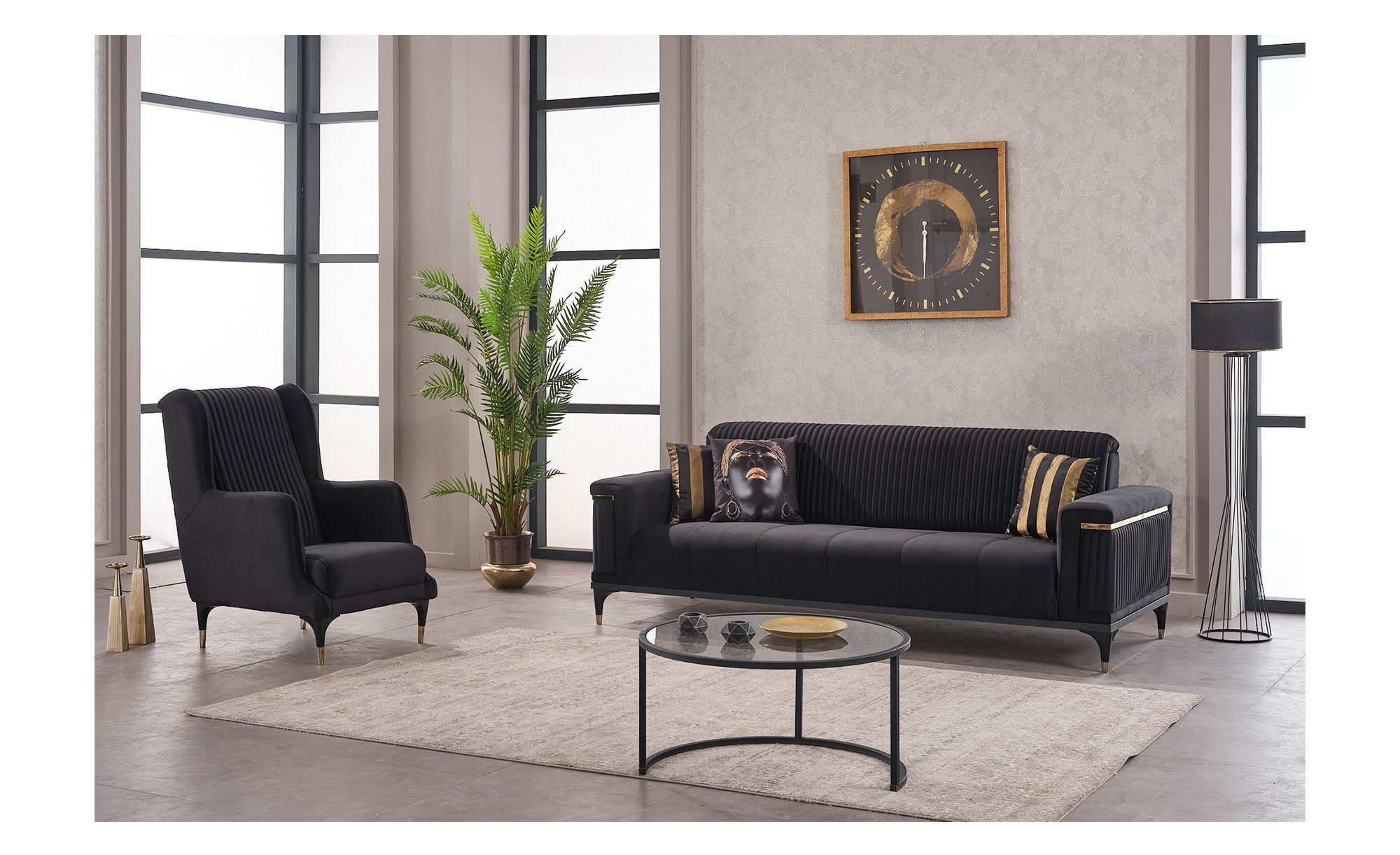 Das ca. 69 x 108 x 101 cm große Möbelstück begeistert mit einem weichen Stoff-Bezug in Anthrazit. Auch die ca. 19 cm hohen Metallfüße sind schwarz, verfügen allerdings über goldene Spitzen. Damit setzen sie gelungene Akzente und ziehen alle Blicke auf sich.