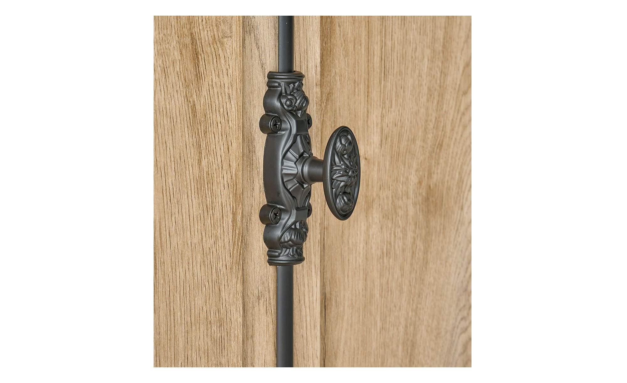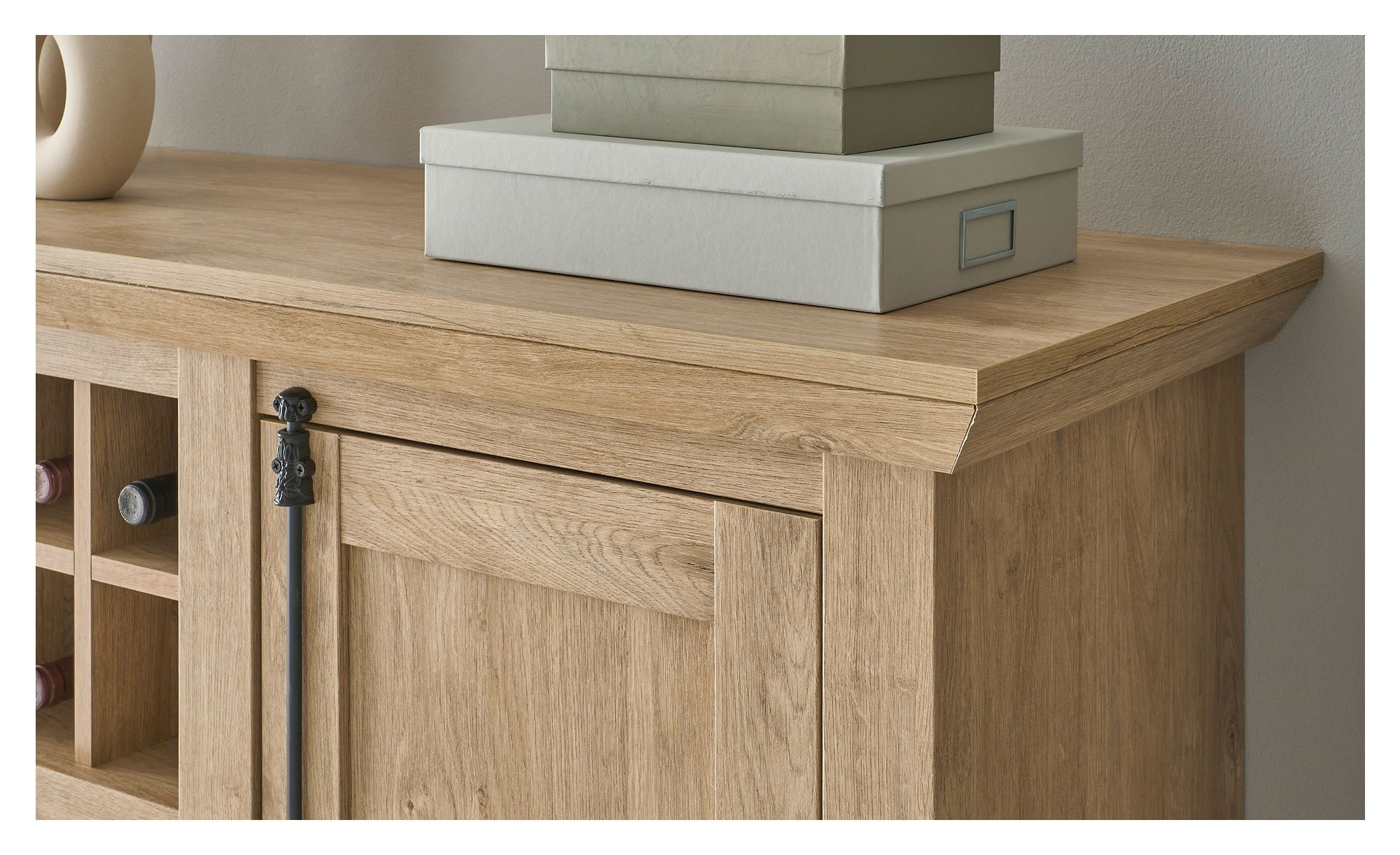 Das ca. 152 x 103 x 42 cm große Möbelstück besteht aus Holzwerkstoff im Dekor Gold Harbour Oak. Seine Vorderseite ist durch eine Beschichtung mit Melamin zuverlässig vor Kratzern und anderweitigem Verschleiß geschützt.