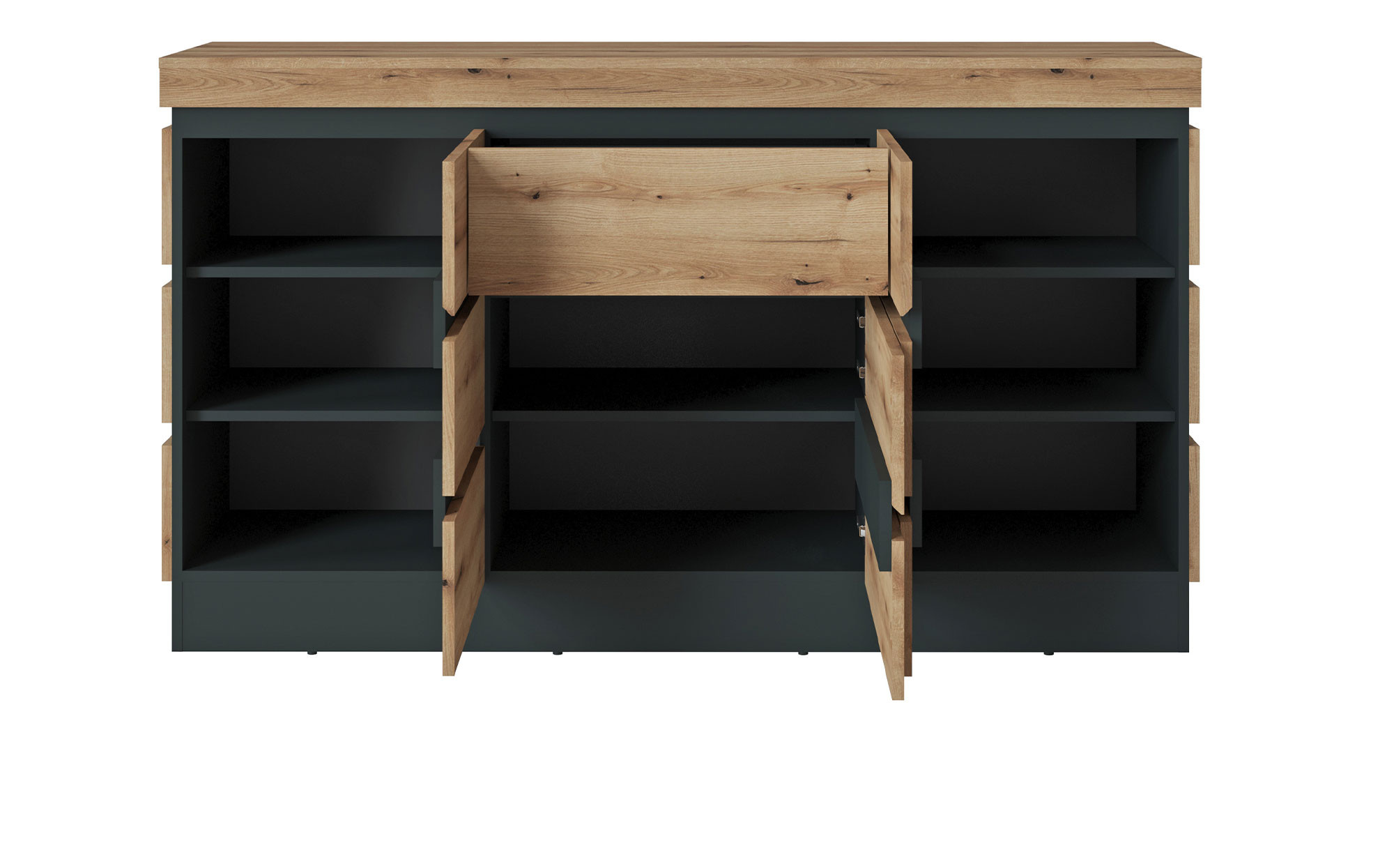 Neben der modernen Optik ist es auch ein großzügiges Stauraum-Angebot, mit welchem das Sideboard überzeugt. Hinter drei Türen mit Dämpfung verbergen sich fünf Böden und acht Fächer. Zudem gibt es eine Schublade mit Soft-Close Funktion.