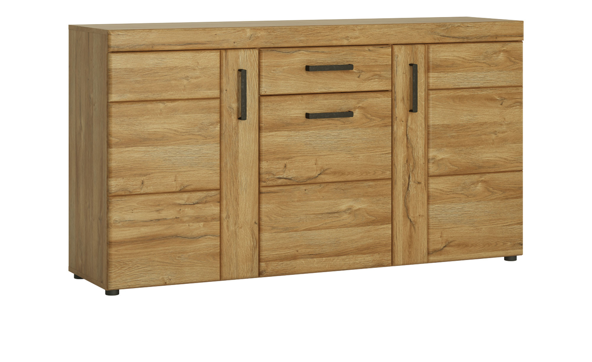 Front und Korpus des ca. 157 x 86 x 41 cm großen Schranks tragen das natürlich wirkende Dekor Grandson Eiche, während das Innendekor und die Rückwände in Wotan Eiche gestaltet wurden. Schwarze Kunststofffüße und die wertigen Metallgriffe im antiken Zinn-Look runden das Erscheinungsbild ab.