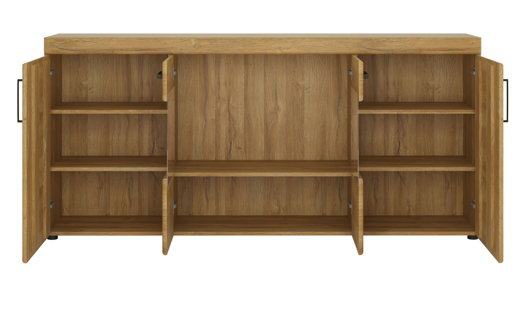 Zum ca. 185 x 86 x 41 cm großen Sideboard gehören vier Türen mit geräuscharmer Dämpfung. Hinter ihnen befinden sich fünf Böden und insgesamt acht geräumige Fächer.