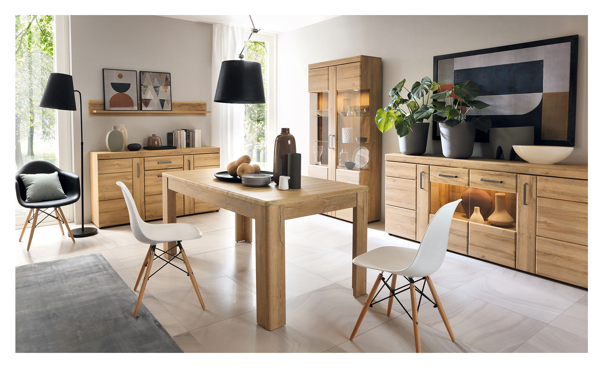 Während Rückwand und Innendekor im Dekor Wotan Eiche gestaltet wurden, begeistern die Fronten und der Korpus im Grandson Eiche-Look. Ihr naturnaher Charme sorgt sofort für ein angenehmes Gefühl im Raum. Über hochwertige Metallgriffe in antiker Zinn-Optik öffnen Sie die Türen. Eine Besonderheit ist dabei der Glasausschnitt, welcher Sie schon vorher einen Blick direkt ins Innere des Boards werfen lässt. Schwarze Füße aus Kunststoff gewährleisten derweil den stabilen Stand.