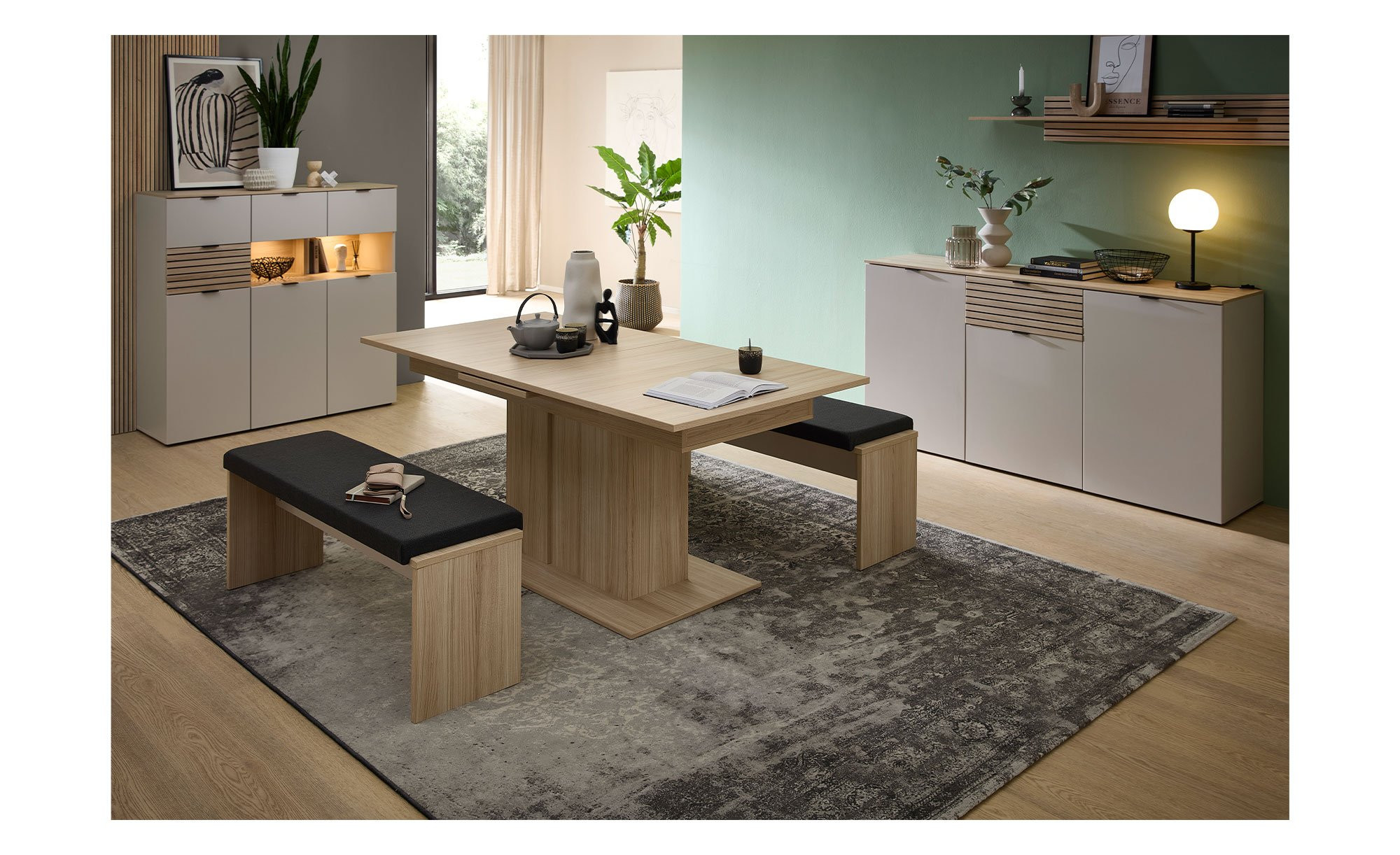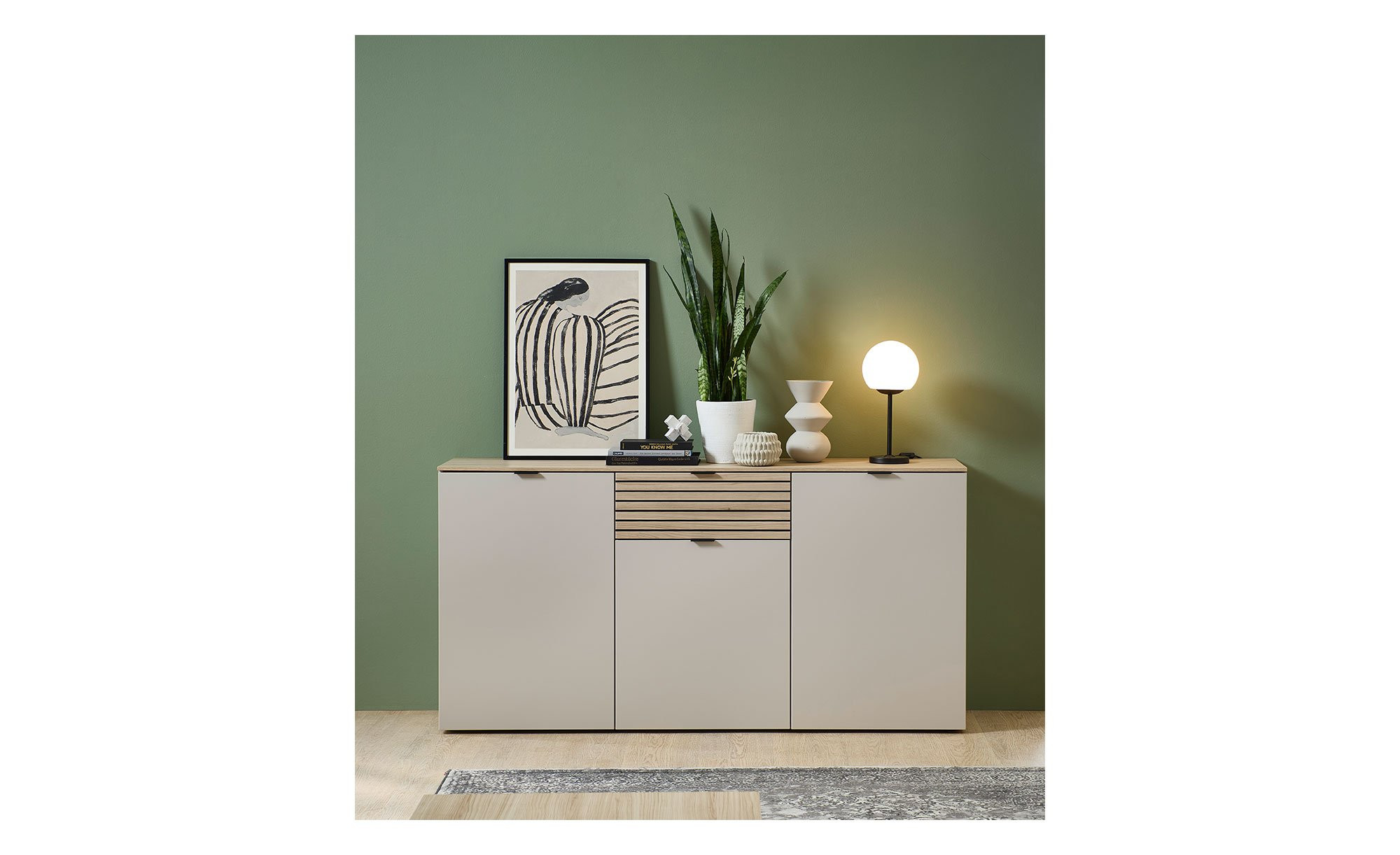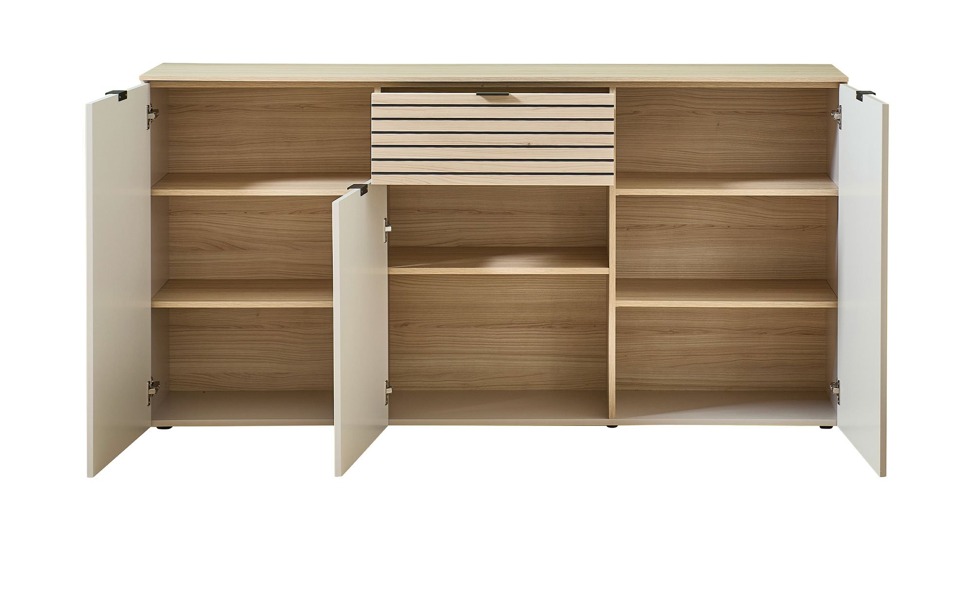 Der Artikel besteht aus Holzwerkstoff-MDF in der edlen Farbe Kaschmir. An der supermatten Vorderseite erwartet Sie zusätzlich eine Absetzung in einer Riva Eiche-Nachbildung in Leisten-Optik. Auch der Oberboden und Teile des Innenbereichs tragen das Holz-Dekor.
