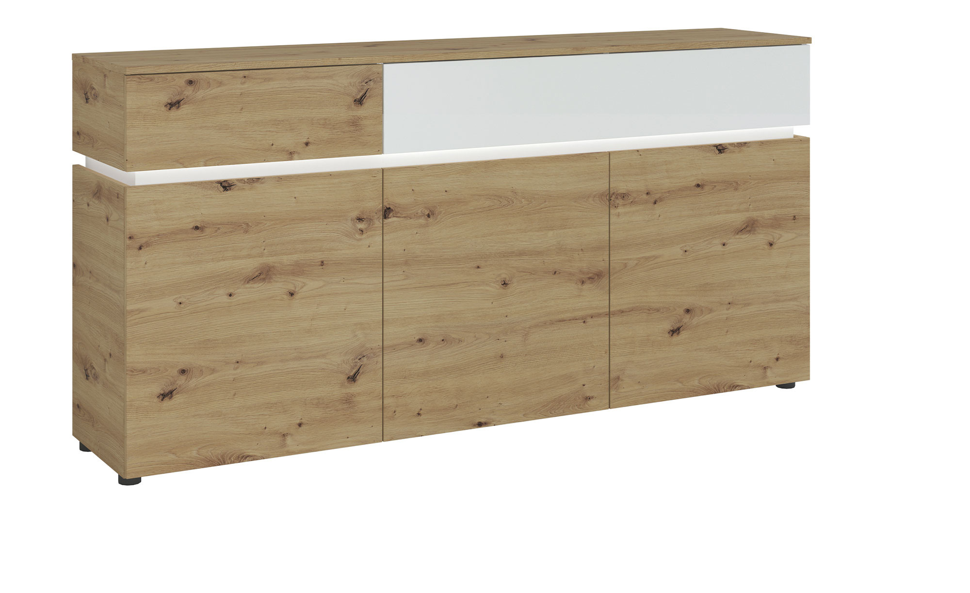 Das Sideboard steht auf schwarzen Kunststofffüßen und verfügt über insgesamt drei Türen mit angenehmer Dämpfung. Dahinter erwarten Sie sechs Fächer. Zusätzlich gibt es zwei Soft-Close Schubläden. Die Beleuchtung ist im Paket inbegriffen.