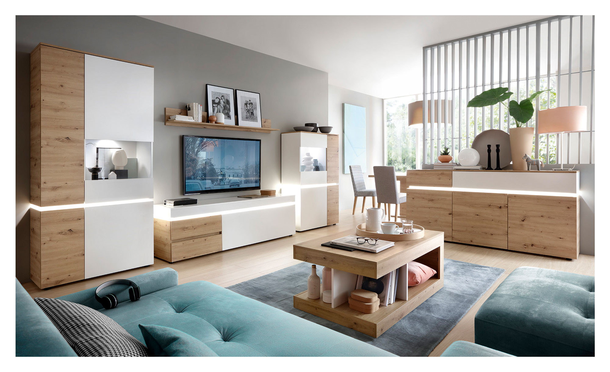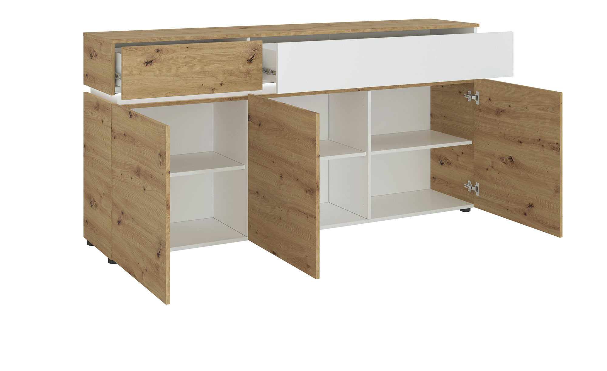 Sowohl der Korpus als auch die Front des ca. 181 x 90 x 40 cm großen Sideboards wurden im Dekor Artisan Eiche gestaltet. Eine alpinweiße Absetzung verleiht der naturnahen Optik einen modernen Einschlag. Auch das Innendekor und die Rückwand sind weiß. Dank der Melaminharzbeschichtung präsentieren sich die Oberflächen zudem äußerst widerstandsfähig gegenüber Kratzern und Schmutz.