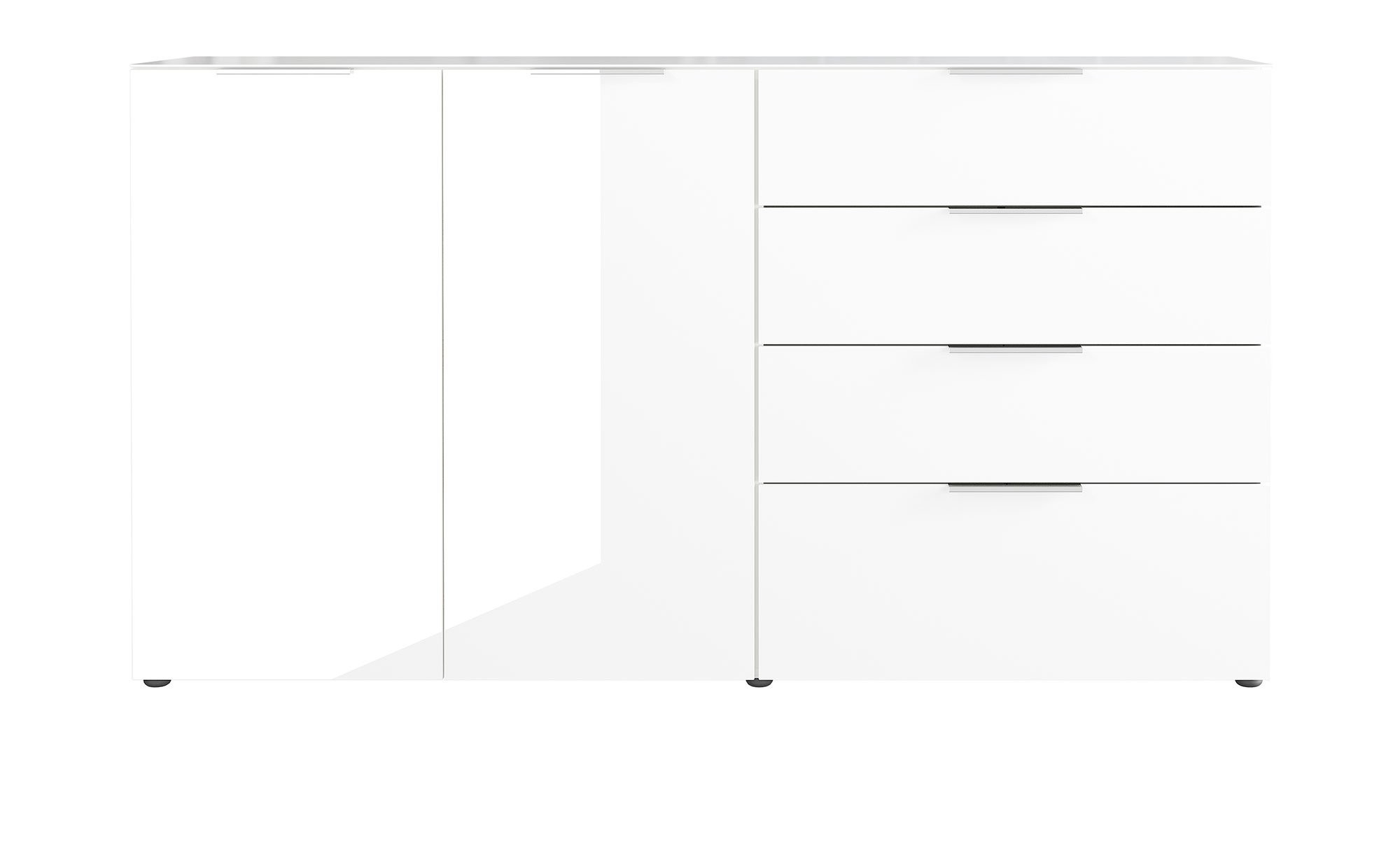 Zum Sideboard Owingen gehören außerdem schwarze Kunststofffüße und hochwertige Metallgriffe in Chrom-Optik. Letztere erleichtern Ihnen das Öffnen der beiden gedämpften Türen und der vier Soft-Close-Schubladen. Im Inneren finden Sie sechs Böden und acht Fächer mit viel Platz für diverse Gegenstände.