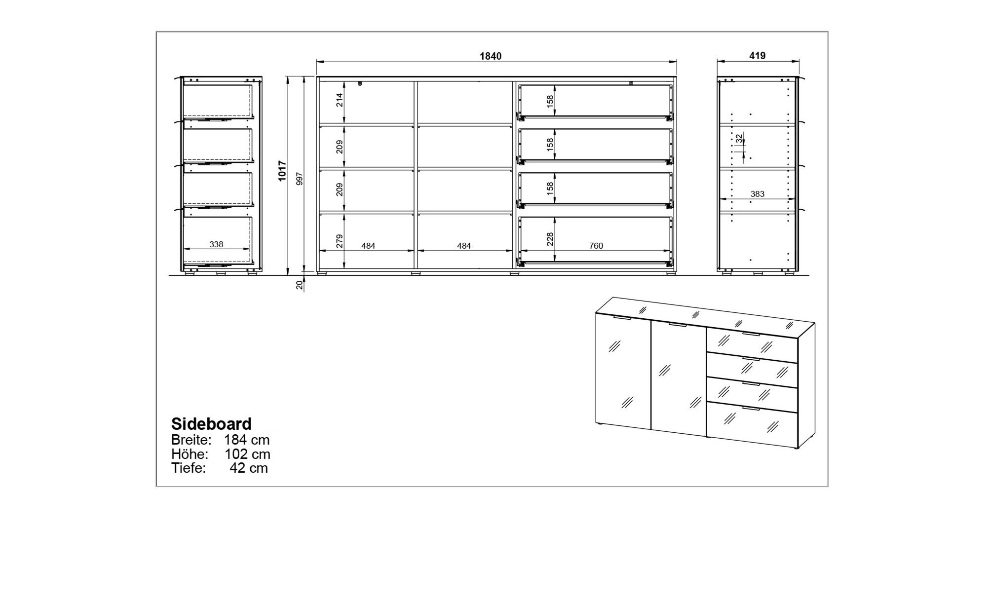 Dank ihrer Einscheibensicherheitsglas-Oberfläche ist die Front des Artikels ganz besonders widerstandsfähig. Doch auch am aus Holzwerkstoff gefertigten Korpus findet sich mit der kratzfesten Melaminharzbeschichtung eine große Robustheit. Zusätzlich schützen hochwertige ABS-Kanten das ca. 184 x 102 x 42 cm große Möbelstück vor Verschleiß.