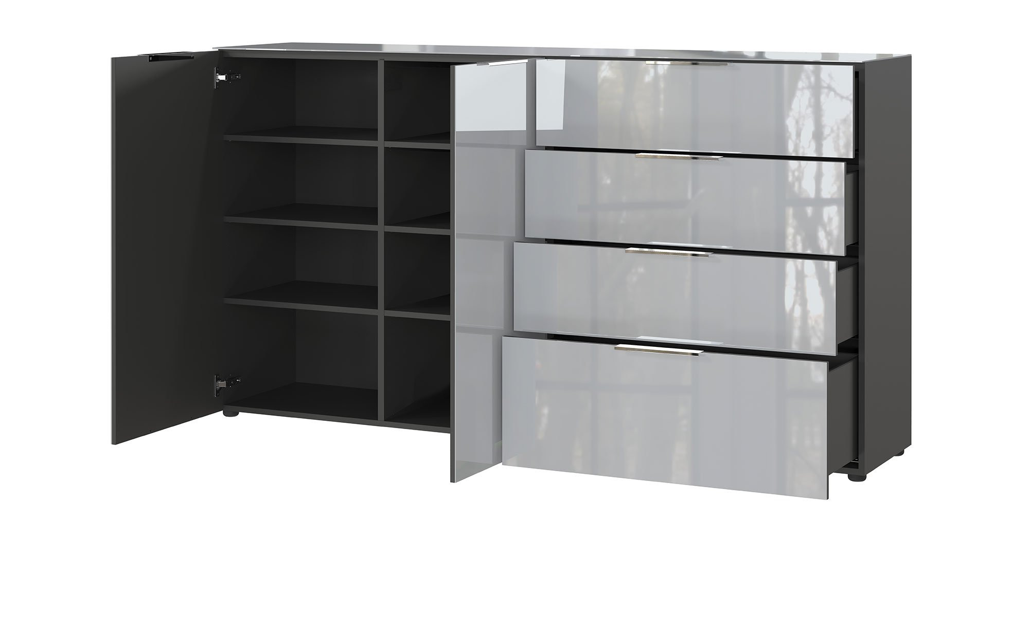 An der silbergrauen Front des Artikels erwartet Sie eine Einscheibensicherheitsglas-Oberfläche, die durch ihre hohe Widerstandskraft überzeugt. Der Korpus ist in einem eleganten Graphitfarbton gehalten und mit einer langlebigen Melaminharzbeschichtung versehen. Auch die ABS-Kanten tragen zur Haltbarkeit des Möbels bei.