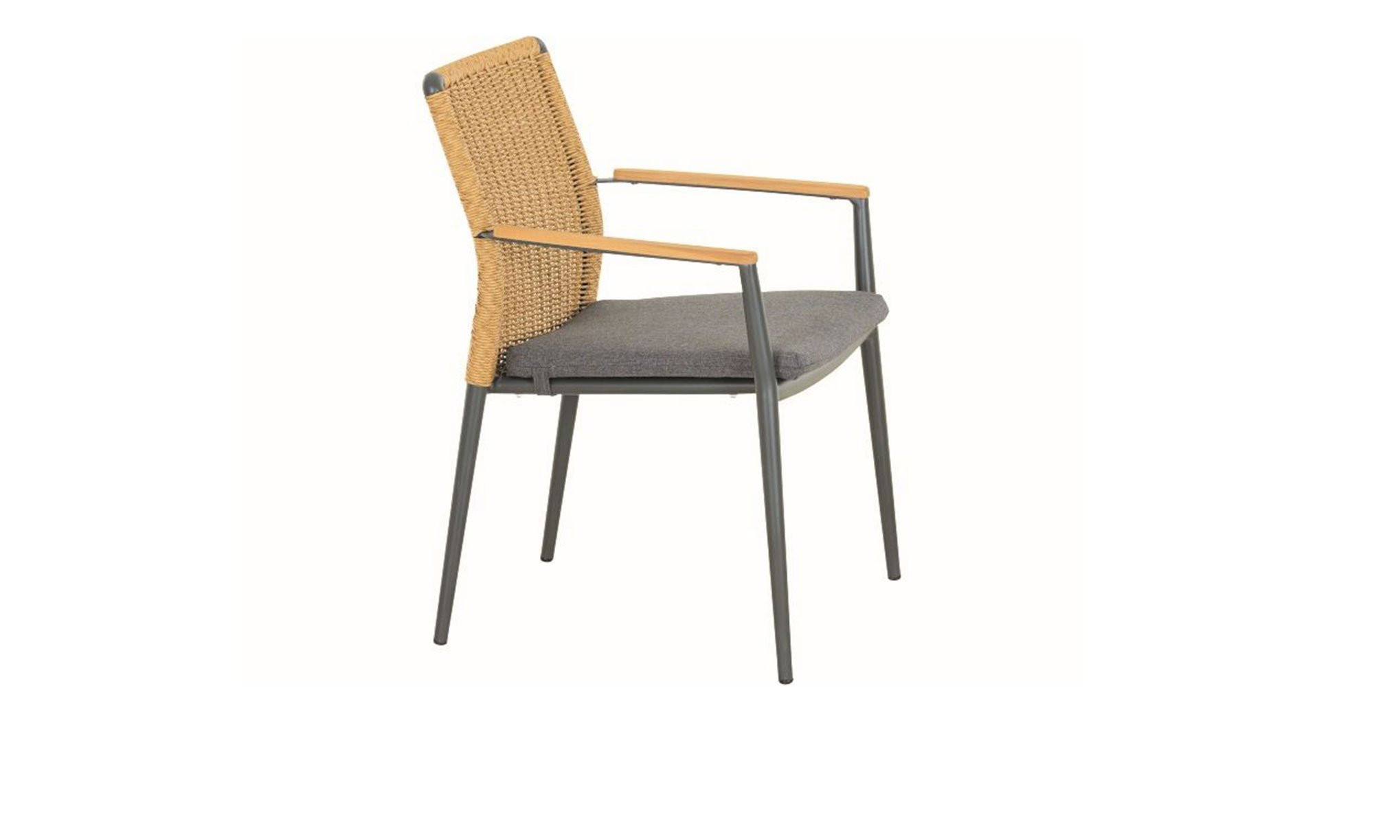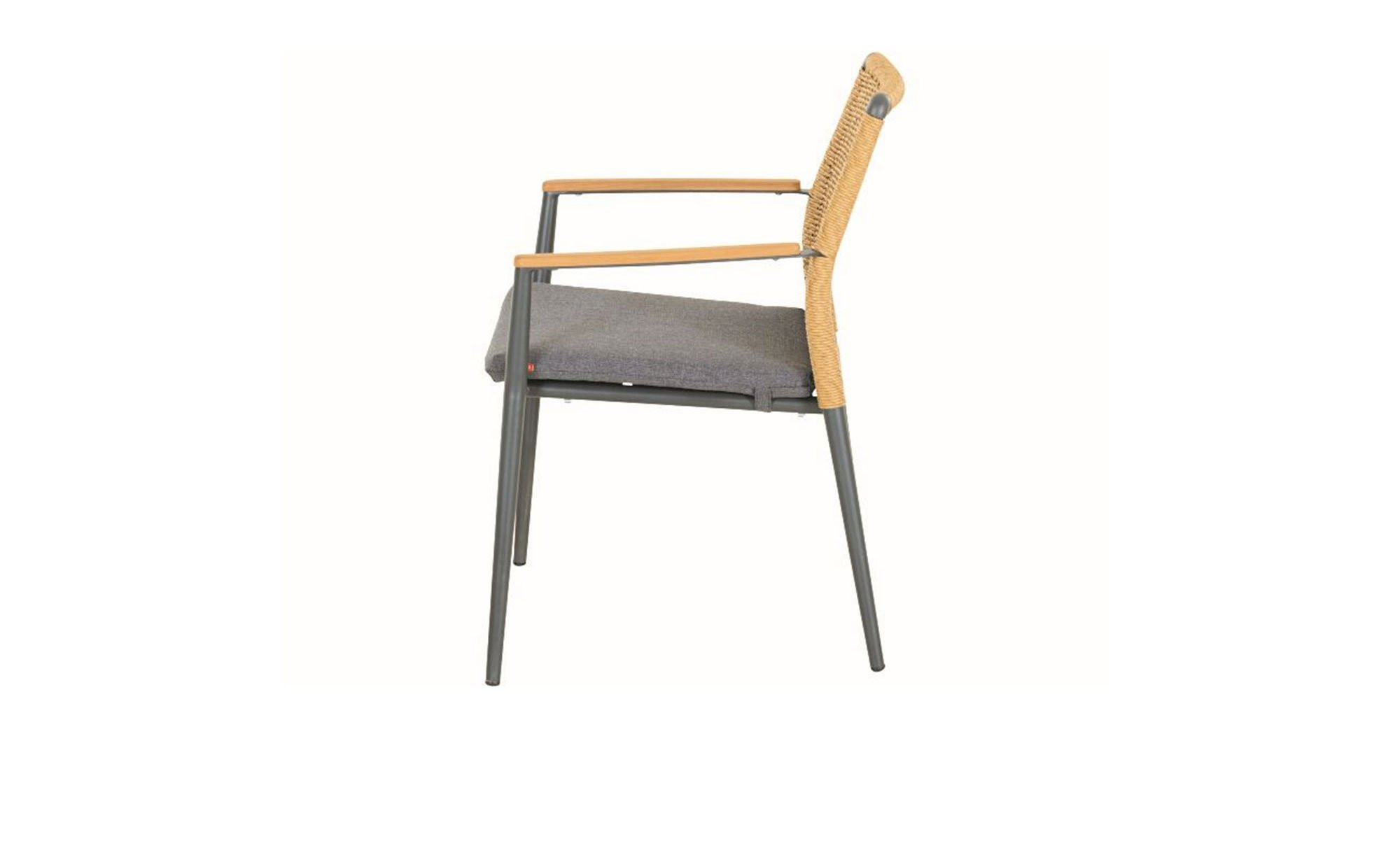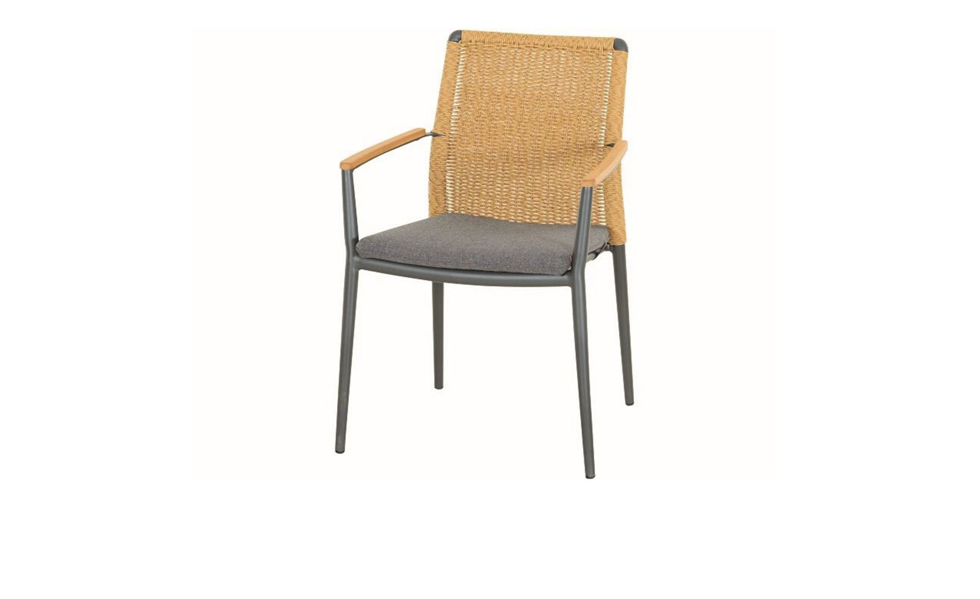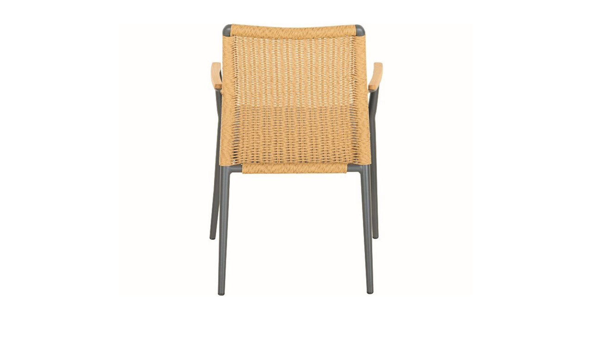 Als Basis des Siena Garden Gartenstuhls Roma fungiert ein stabiles Aluminiumgestell mit Pulverbeschichtung. Es verfügt über vier Füße und erzeugt durch seinen Anthrazit-Ton einen gelungenen Kontrast zum braunen Gardino-Geflecht am Rücken des Artikels. An den Armlehnen finden sich zudem Onlays aus Teakholz.