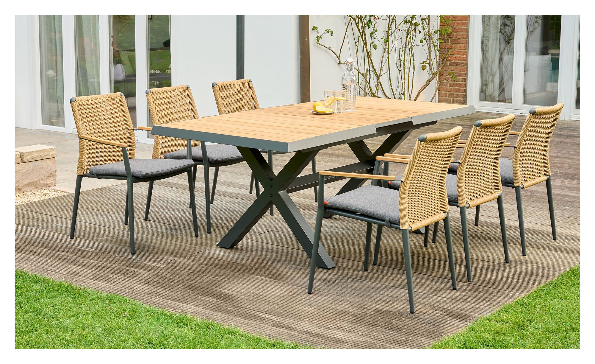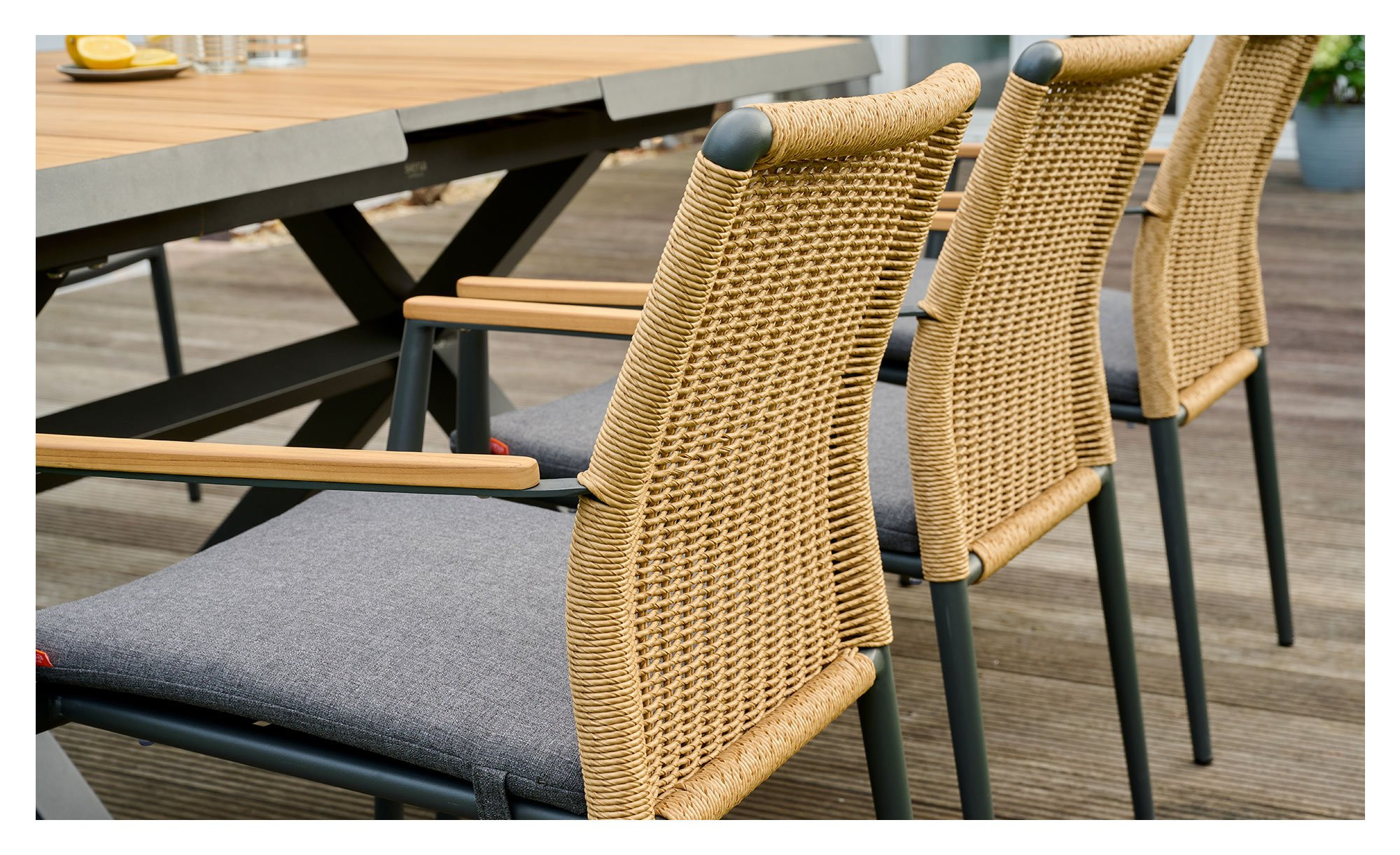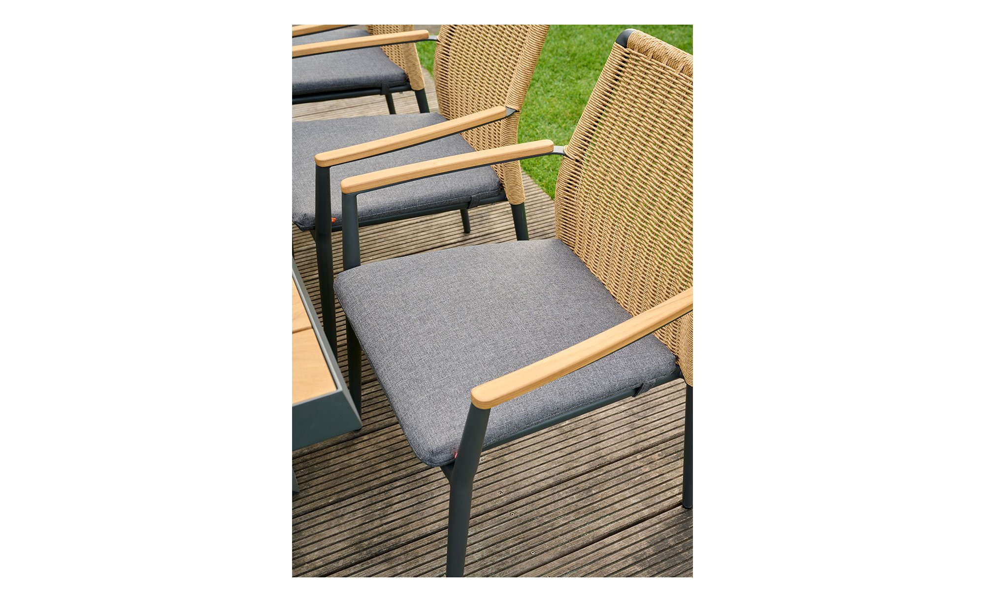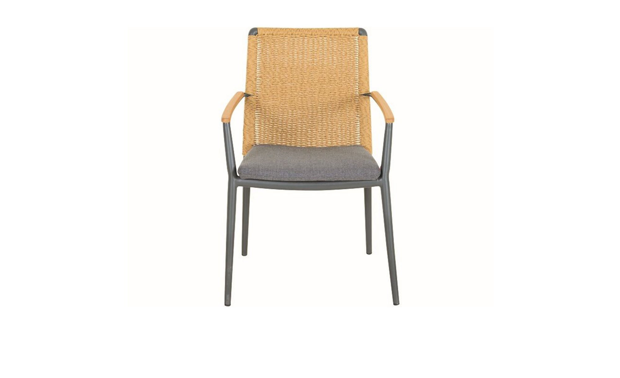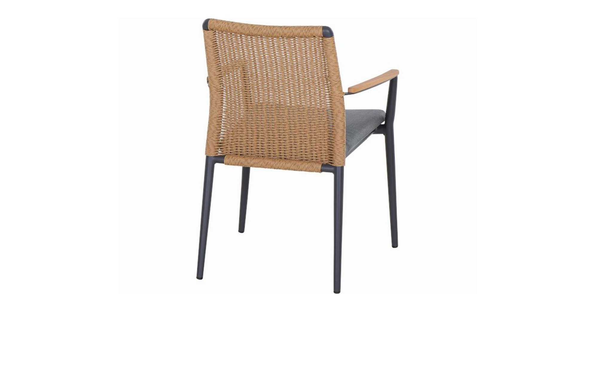 Als Basis des Siena Garden Gartenstuhls Roma fungiert ein stabiles Aluminiumgestell mit Pulverbeschichtung. Es verfügt über vier Füße und erzeugt durch seinen Anthrazit-Ton einen gelungenen Kontrast zum braunen Gardino-Geflecht am Rücken des Artikels. An den Armlehnen finden sich zudem Onlays aus Teakholz.