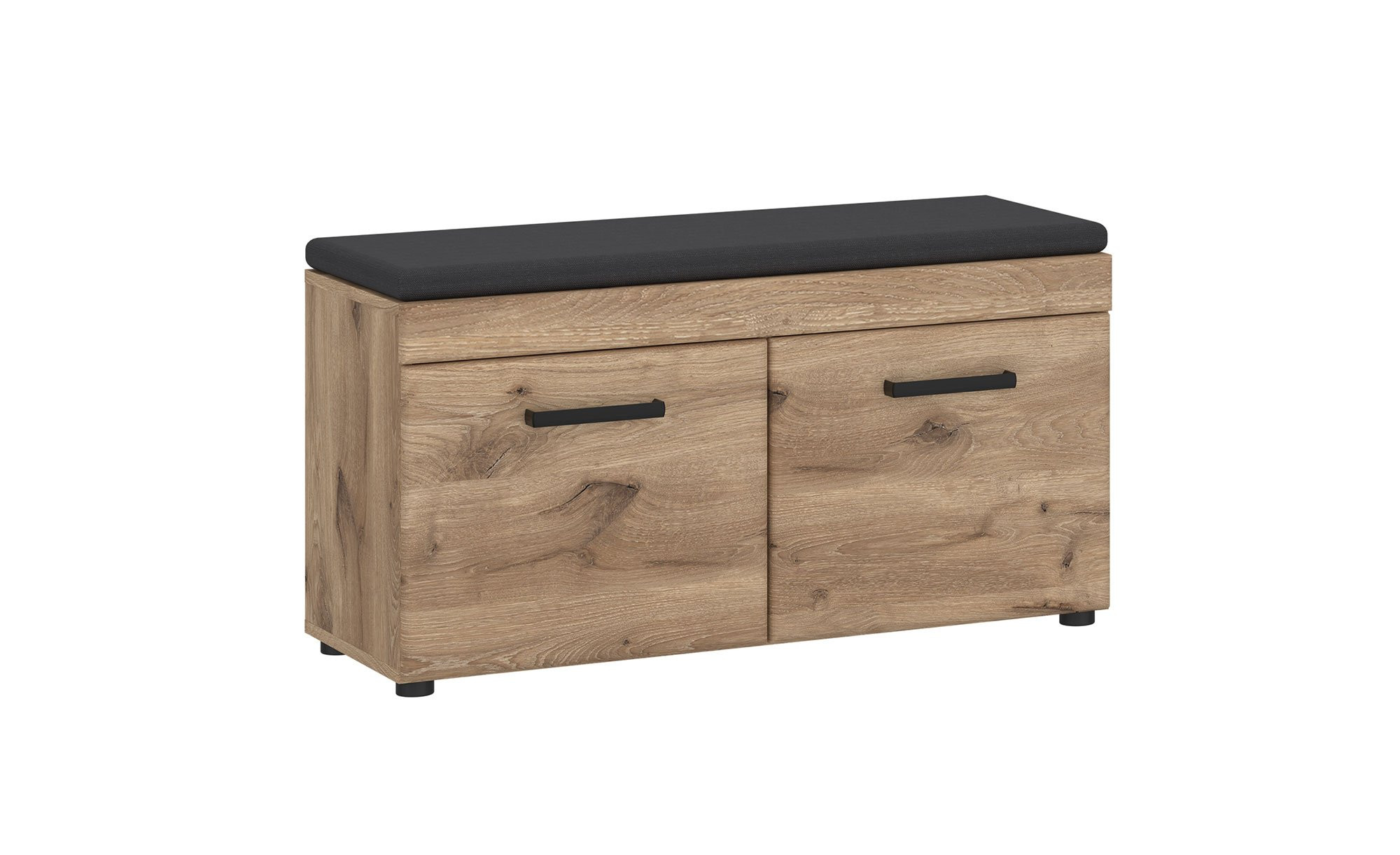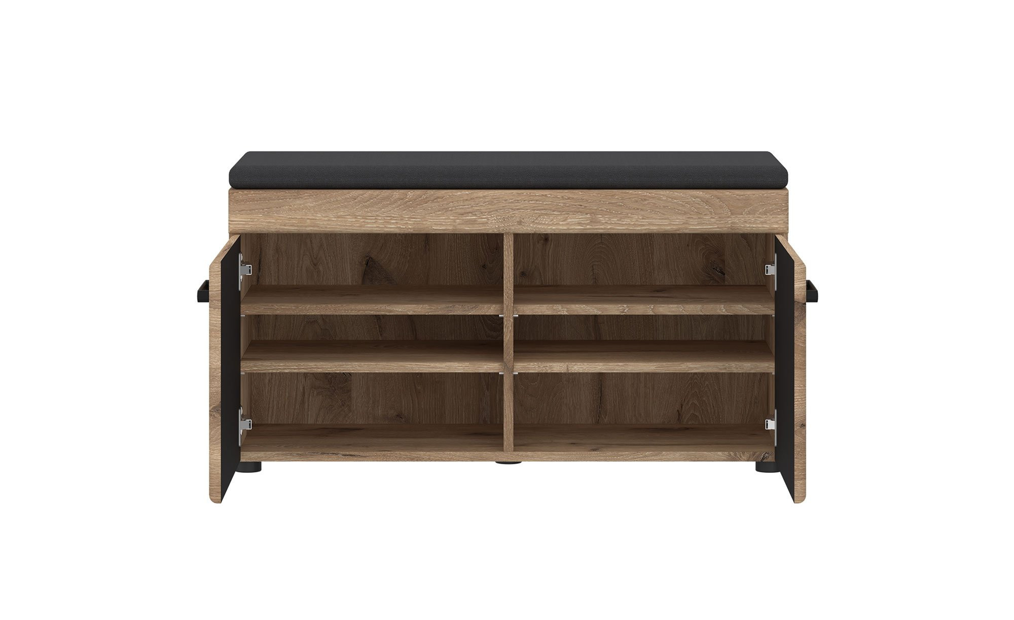 Hinter den beiden gedämpften Türen wurden vier Böden integriert, sodass sich sechs Fächer ergeben. Obenauf liegt ein bequemes Sitzpolster in Anthrazit.