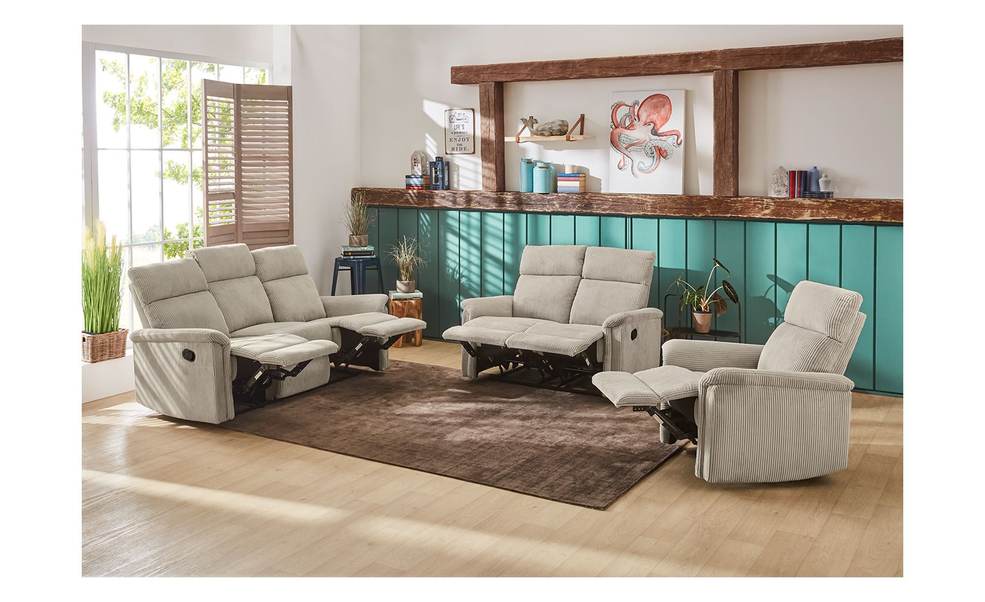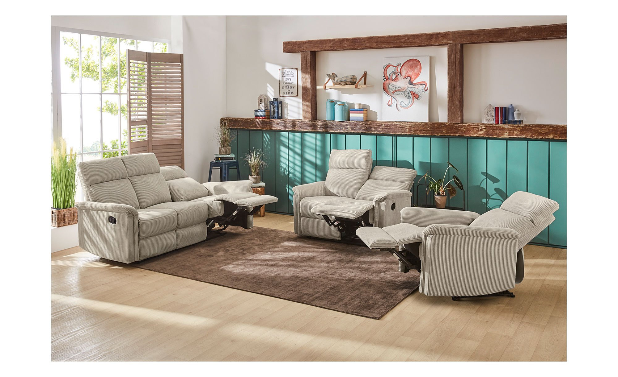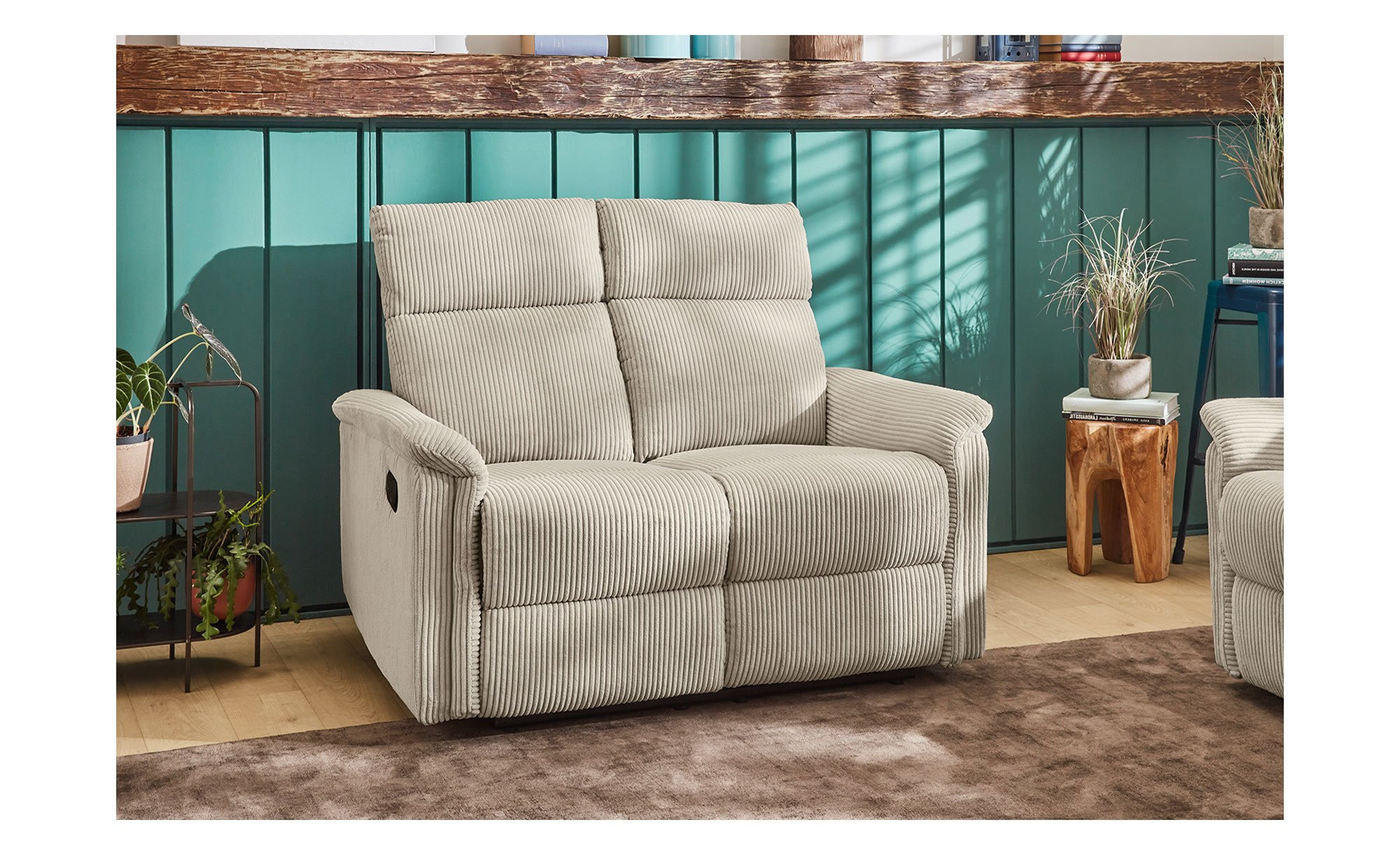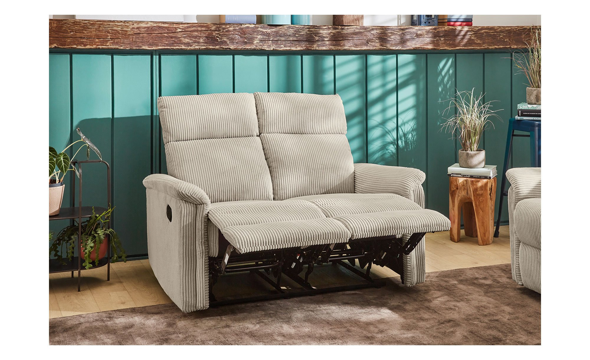 Ein weicher Cord-Bezug aus 100 % Polyester umschließt das ca. 127 x 100 x 93-165 cm große Möbelstück inklusive Rücken. Er ist in der Farbe Light Greige gehalten und bildet somit einen gelungenen Kontrast zu den schwarzen Füßen aus Kunststoff.
