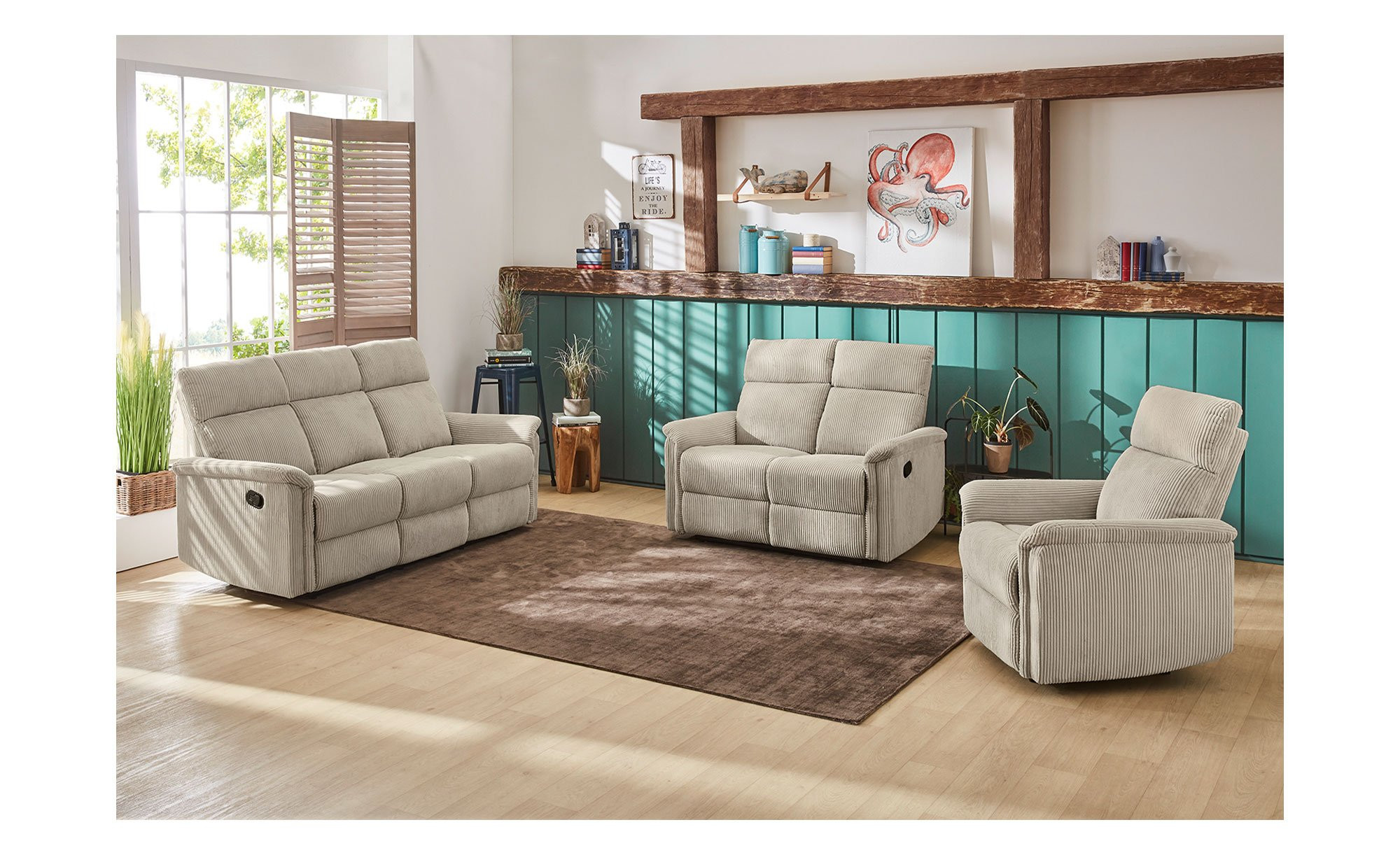 Ein weicher Cord-Bezug aus 100 % Polyester umschließt das ca. 180 x 100 x 93-165 cm große Möbelstück inklusive seines Rückens. Mit der Farbe Light Greige passt er hervorragend zu den Kunststofffüßen in Schwarz.