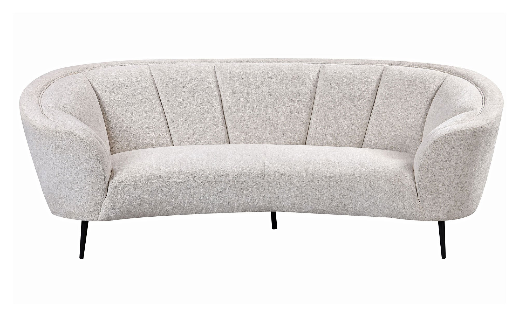 Mit Maßen von ca. 234 x 89 x 92 cm ist das Sofa mit einem cremefarbenen Stoff aus 100 % Polyester bezogen. Die moderne Liniensteppung zieht alle Blicke auf sich. Dank des echten Rückens können Sie das Sofa flexibel im Raum platzieren, während die ca. 20 cm hohen schwarzen Metallfüße das Gesamtbild perfekt abrunden.
