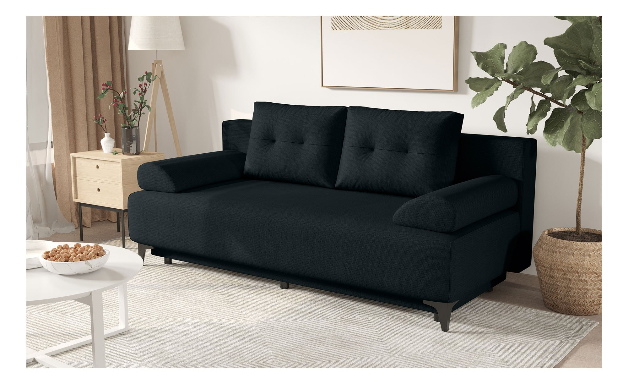 Das ca. 204 x 84 x 64 cm große Möbelstück ist mit einem Stoff aus 100 % Polyester im Farbton Dunkelblau bezogen. Zwei Nierenkissen und zwei Rückenkissen im selben Bezugsstoff sind im Angebot enthalten. Darüber hinaus dürfen Sie sich auf schwarze Metallfüße mit einer Höhe von ca. 13 cm freuen.