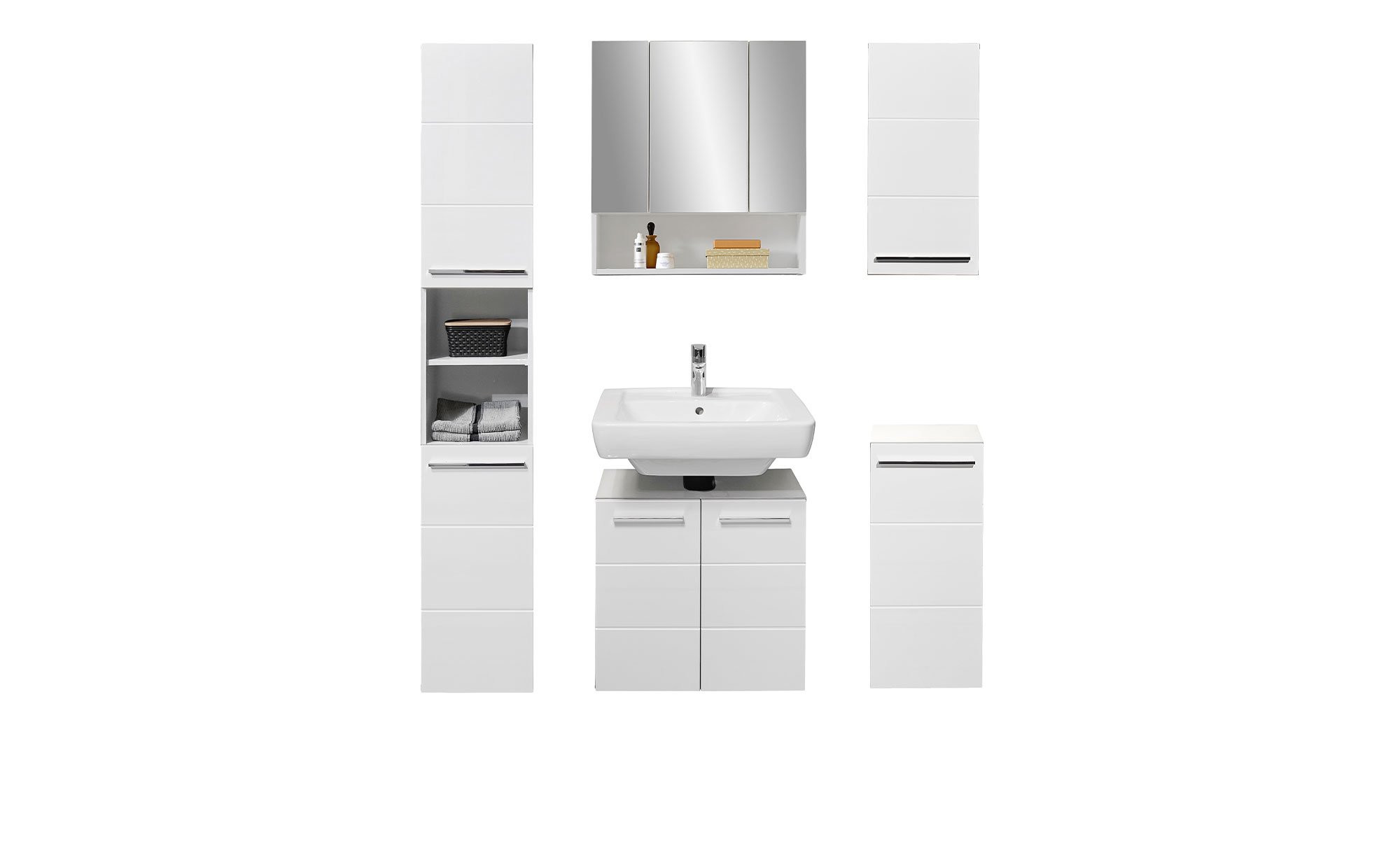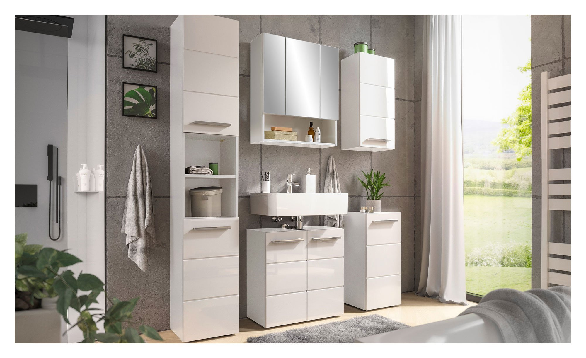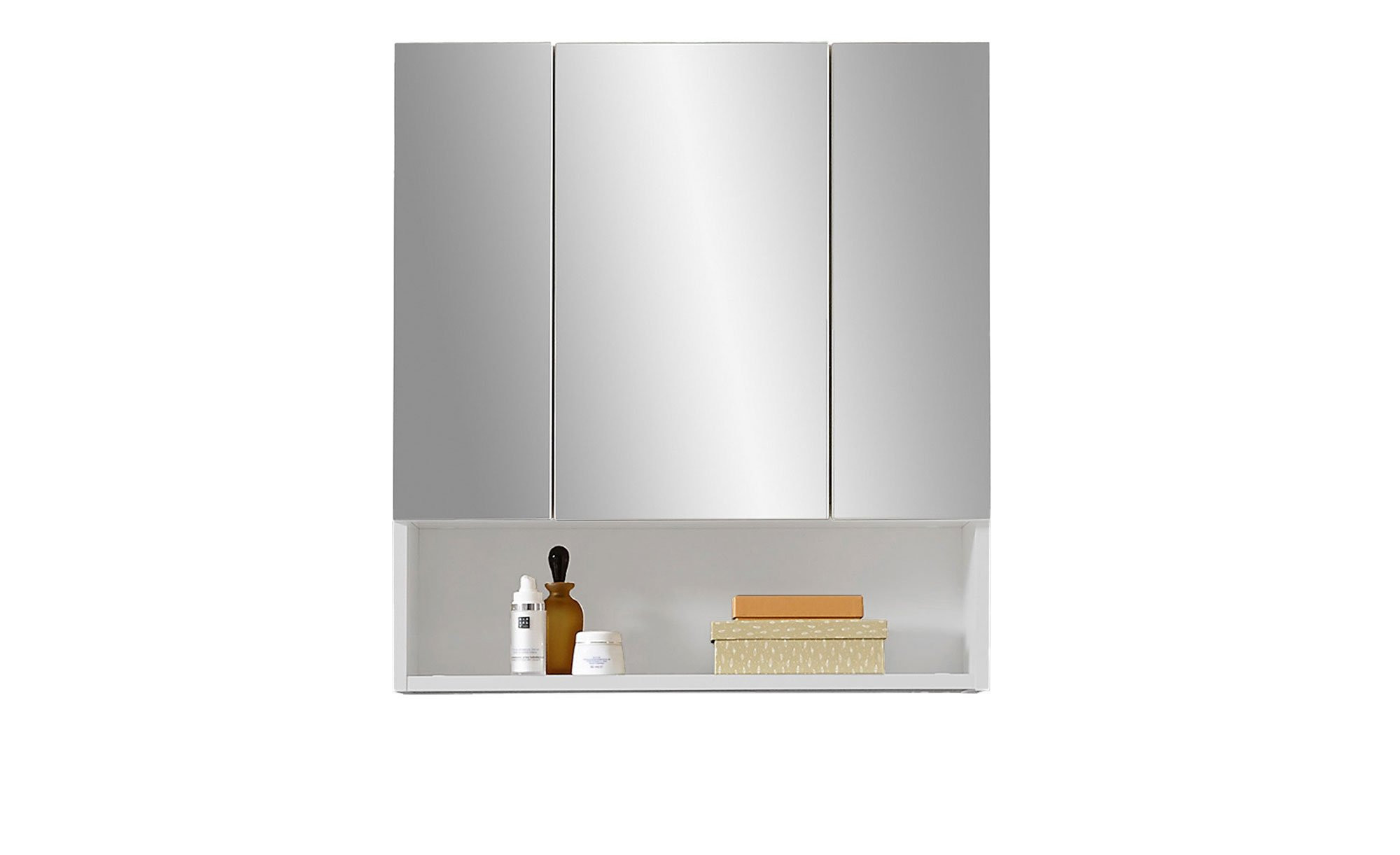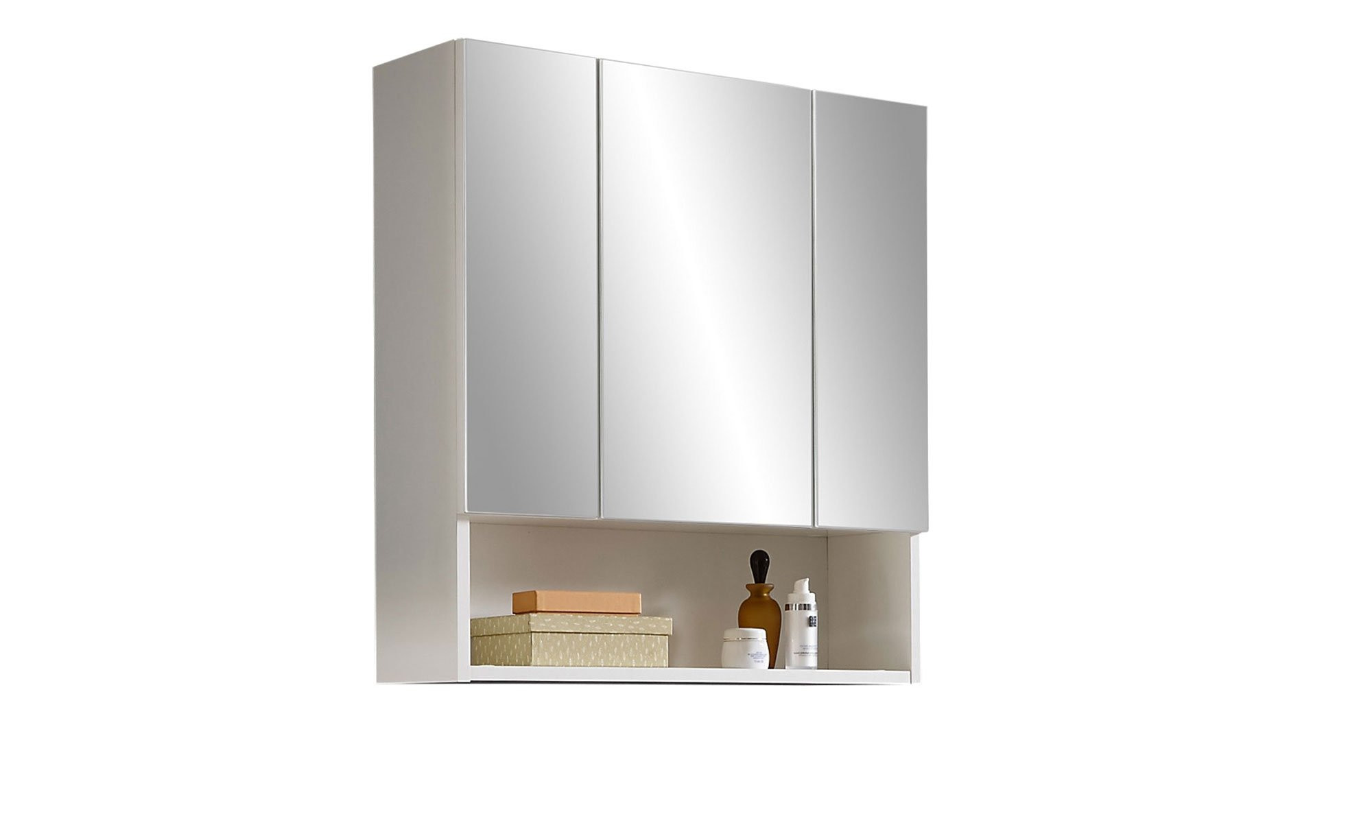 Die Front des ca. 65 x 71 x 20 cm großen Möbelstücks ist komplett mit Spiegelglas versehen, während der Korpus aus Holzwerkstoff in mattem Weiß gehalten ist. Eine Melaminbeschichtung schützt ihn zuverlässig vor Verschleiß. Mithilfe von Kunststoffgriffen in Hochglanzchrom-Optik lassen sich die drei Türen des Artikels problemlos öffnen. Dahinter erwarten Sie drei Böden, unterhalb wurde zudem ein offenes Fach integriert.