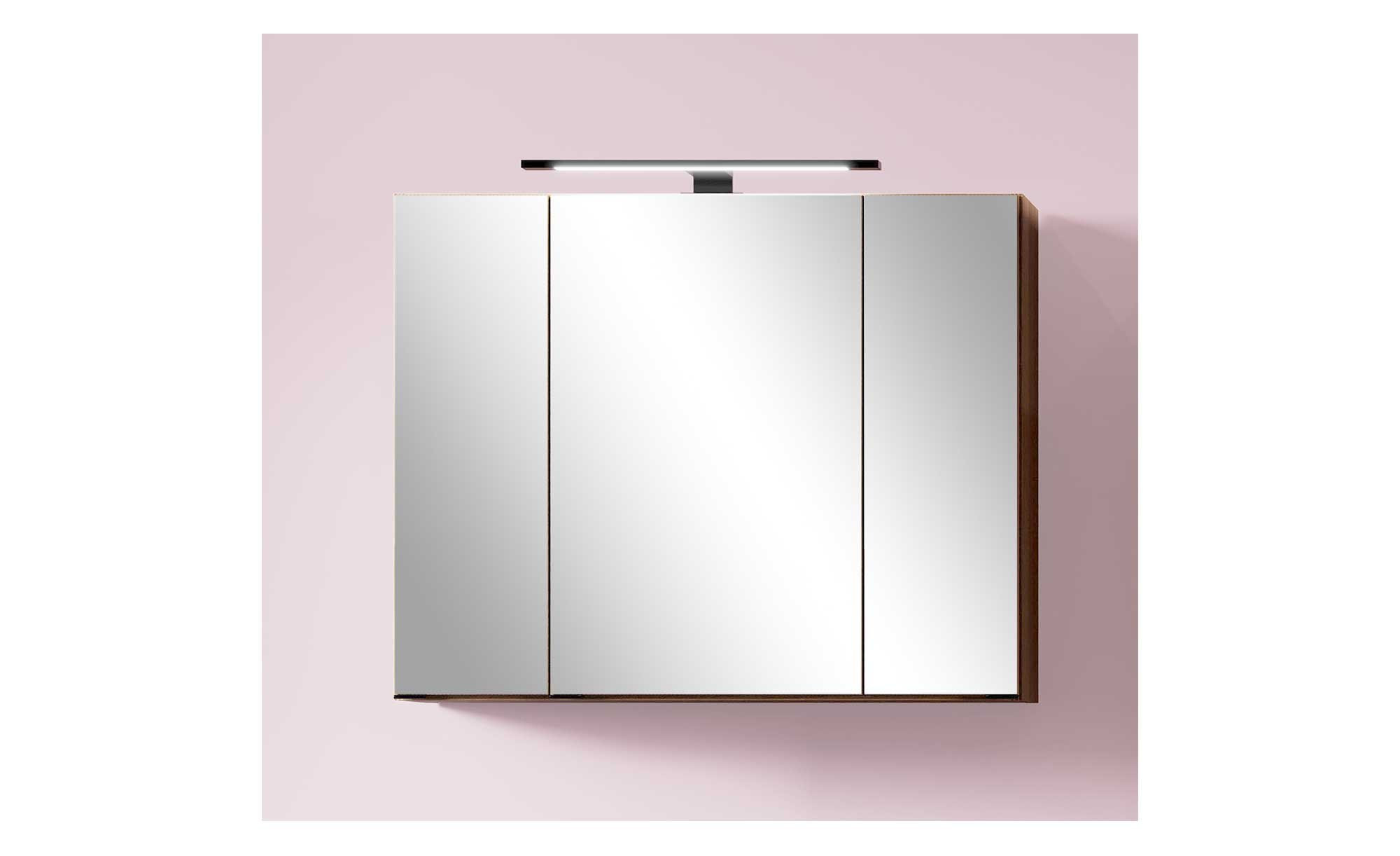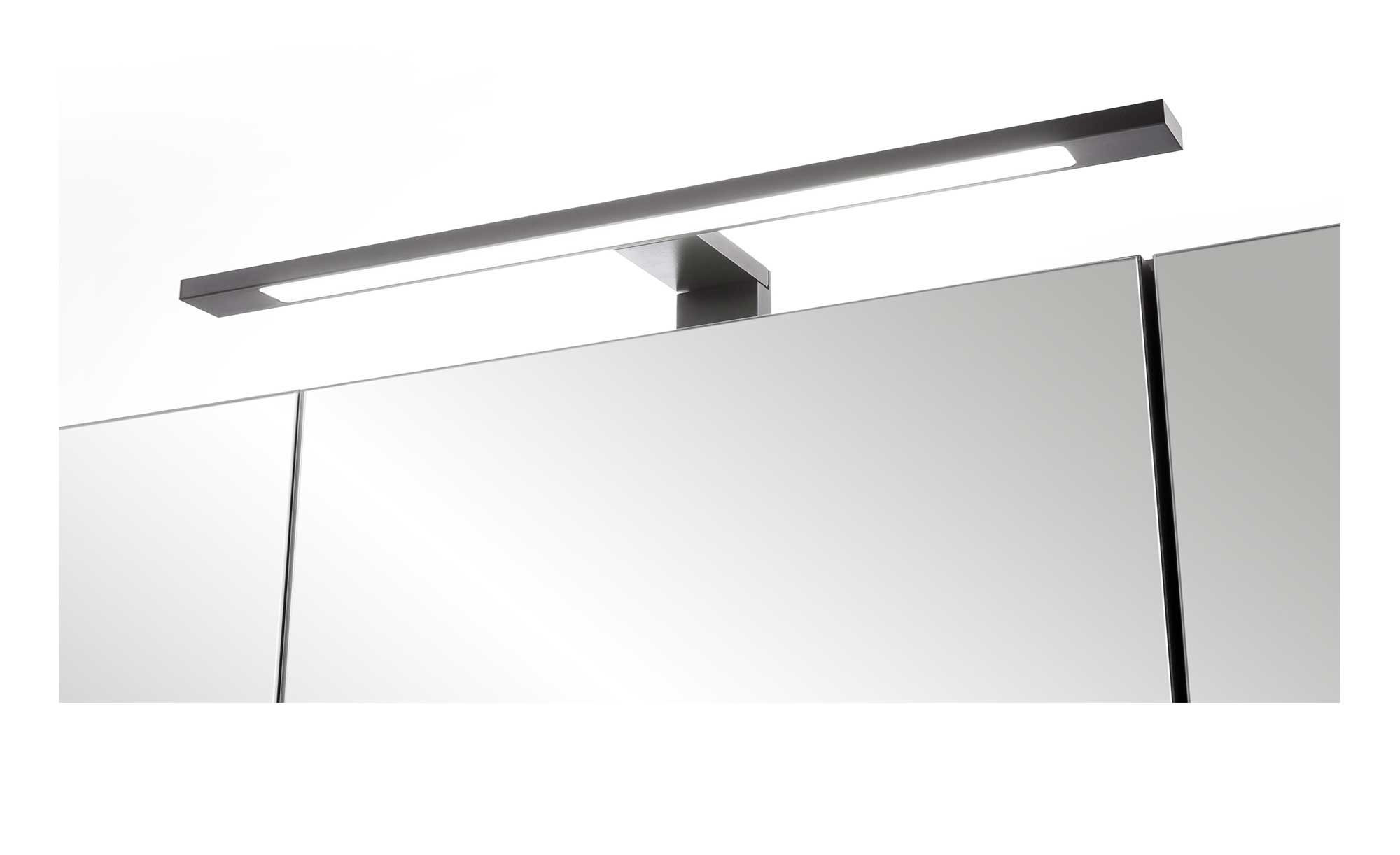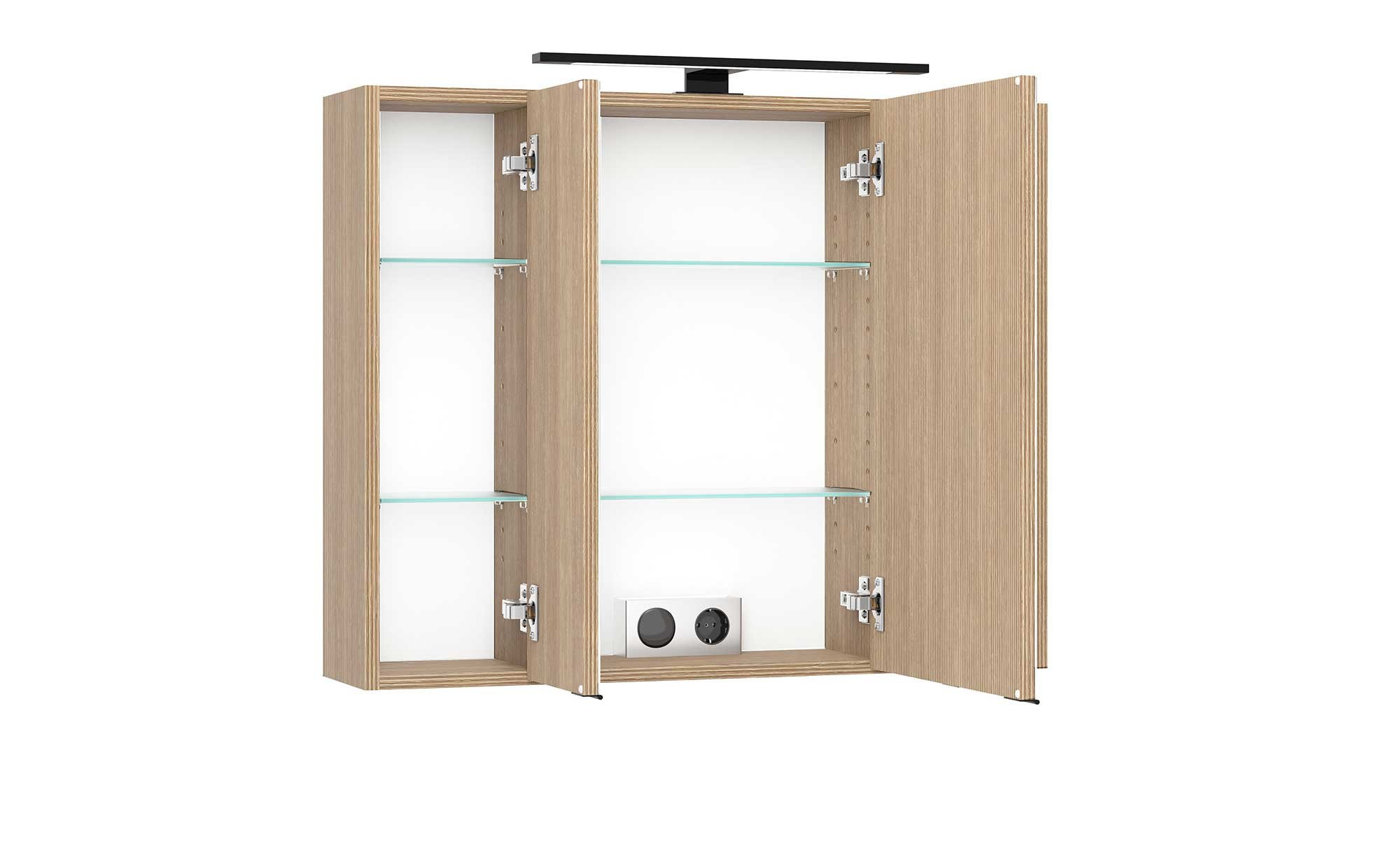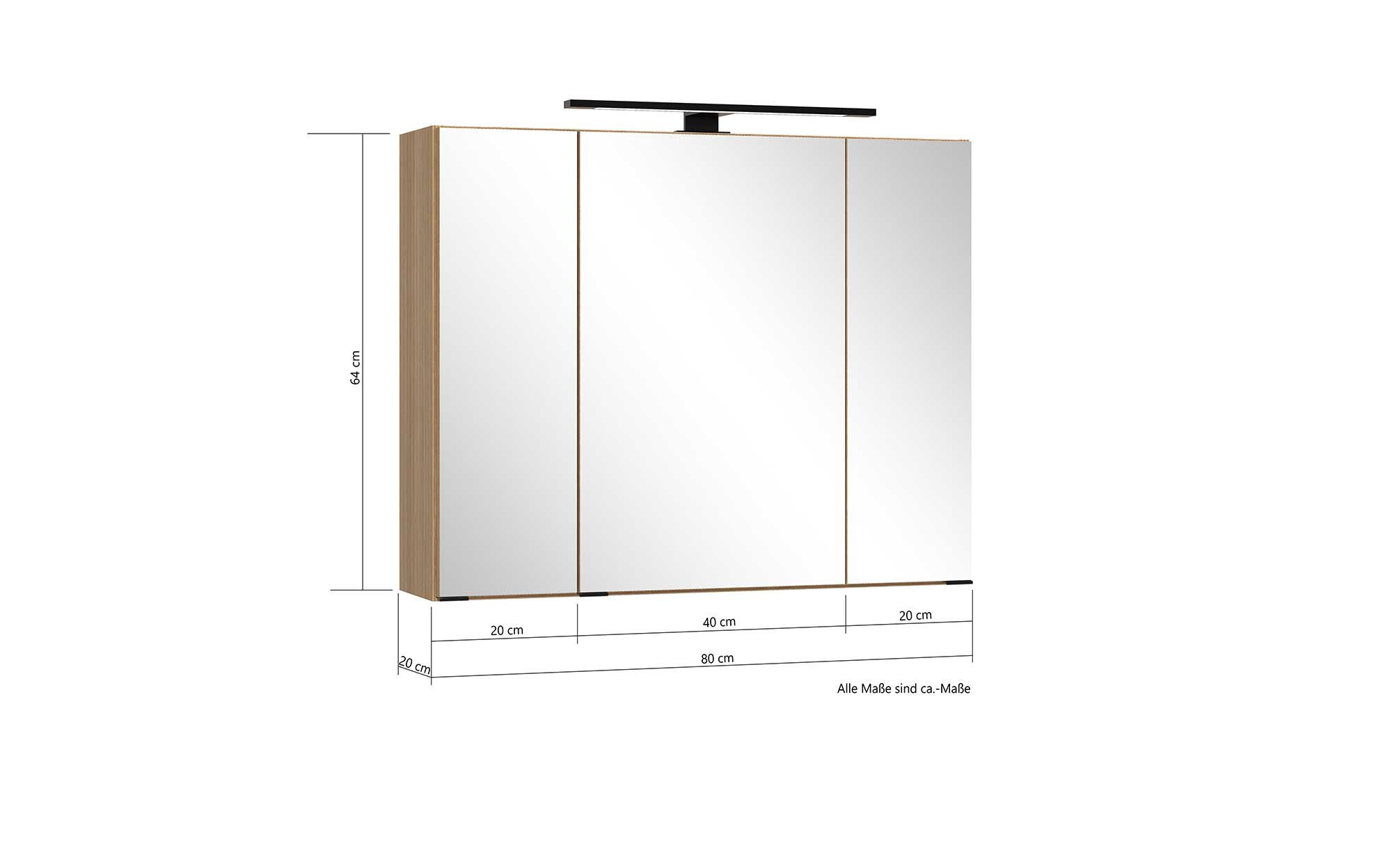 Der Korpus des ca. 80 x 64 x 20 cm großen Möbelstücks besteht aus Holzwerkstoff im Dekor Tira Eiche hell. An der Front findet sich hingegen verspiegeltes Glas. Während das Innendekor ebenfalls im Holz-Stil gestaltet wurde, ist die Rückwand vollkommen weiß. Zum Angebot gehört auch eine schwarze LED-Aufsatzleuchte, die Sie stets im richtigen Licht erscheinen lässt. Mitgeliefert werden außerdem eine Trafobox, ein Schalter und eine integrierte Steckdose.