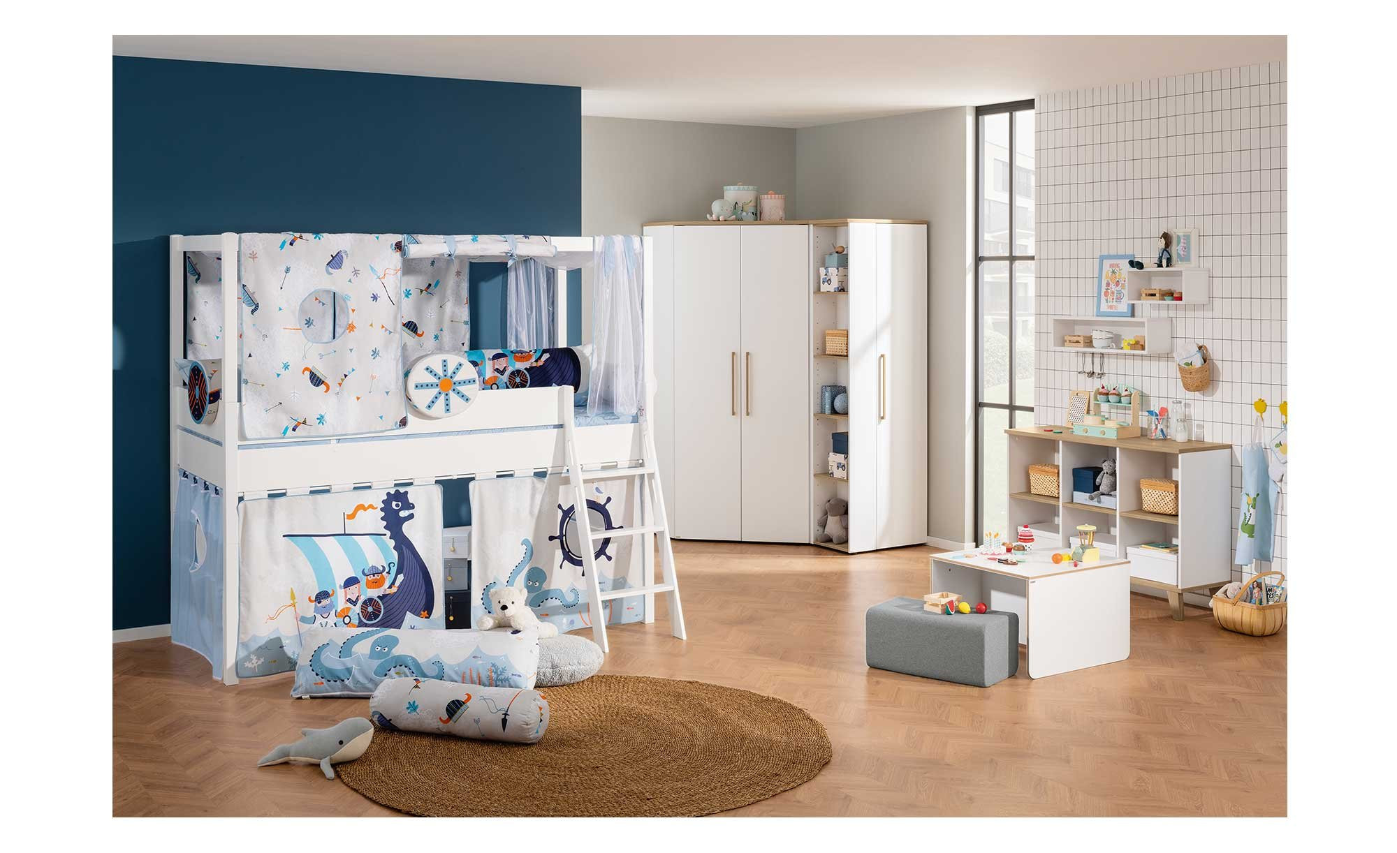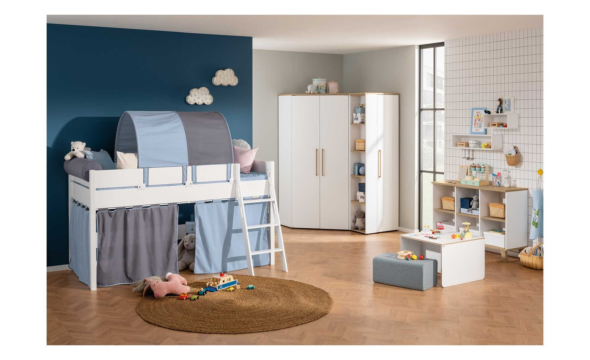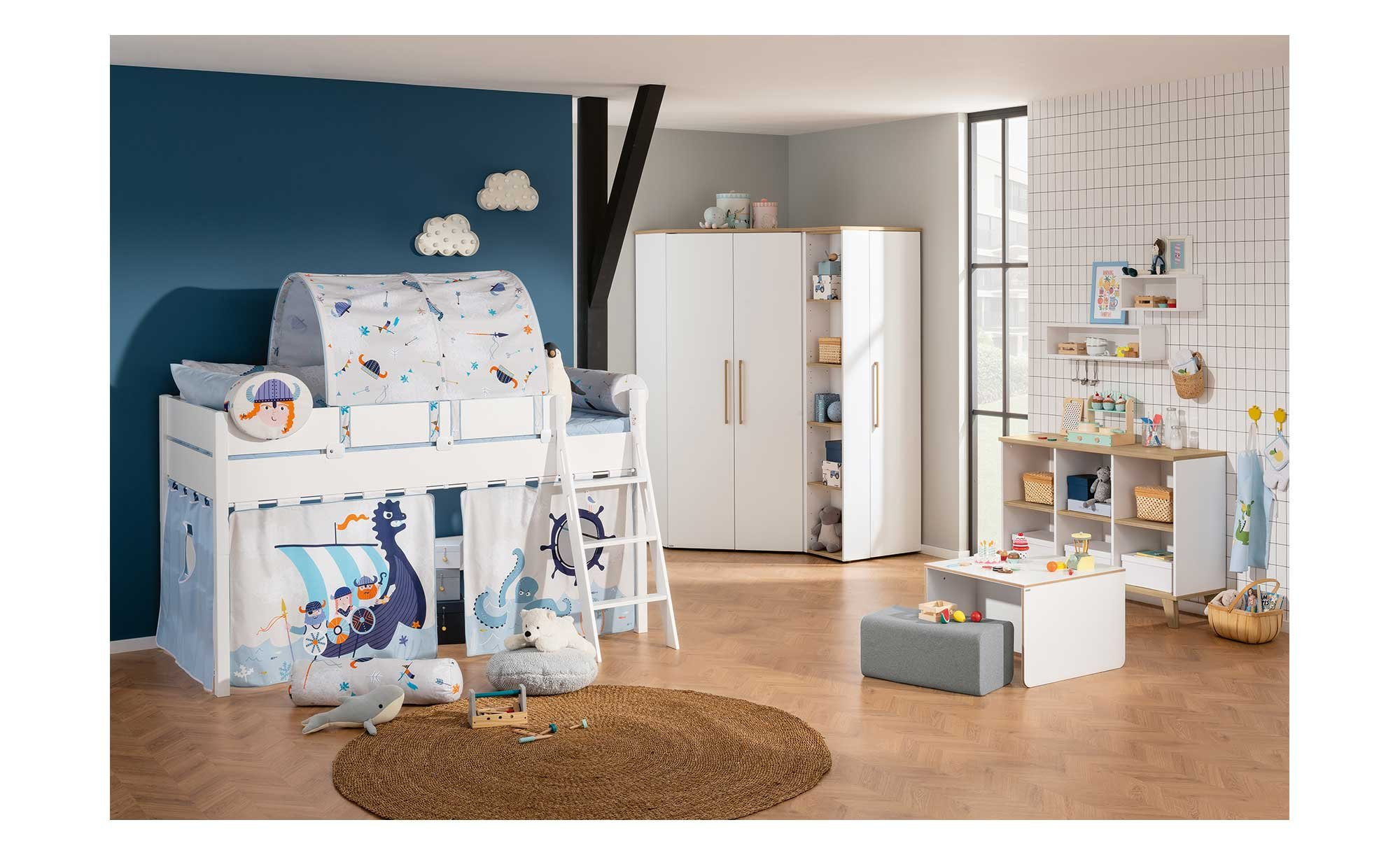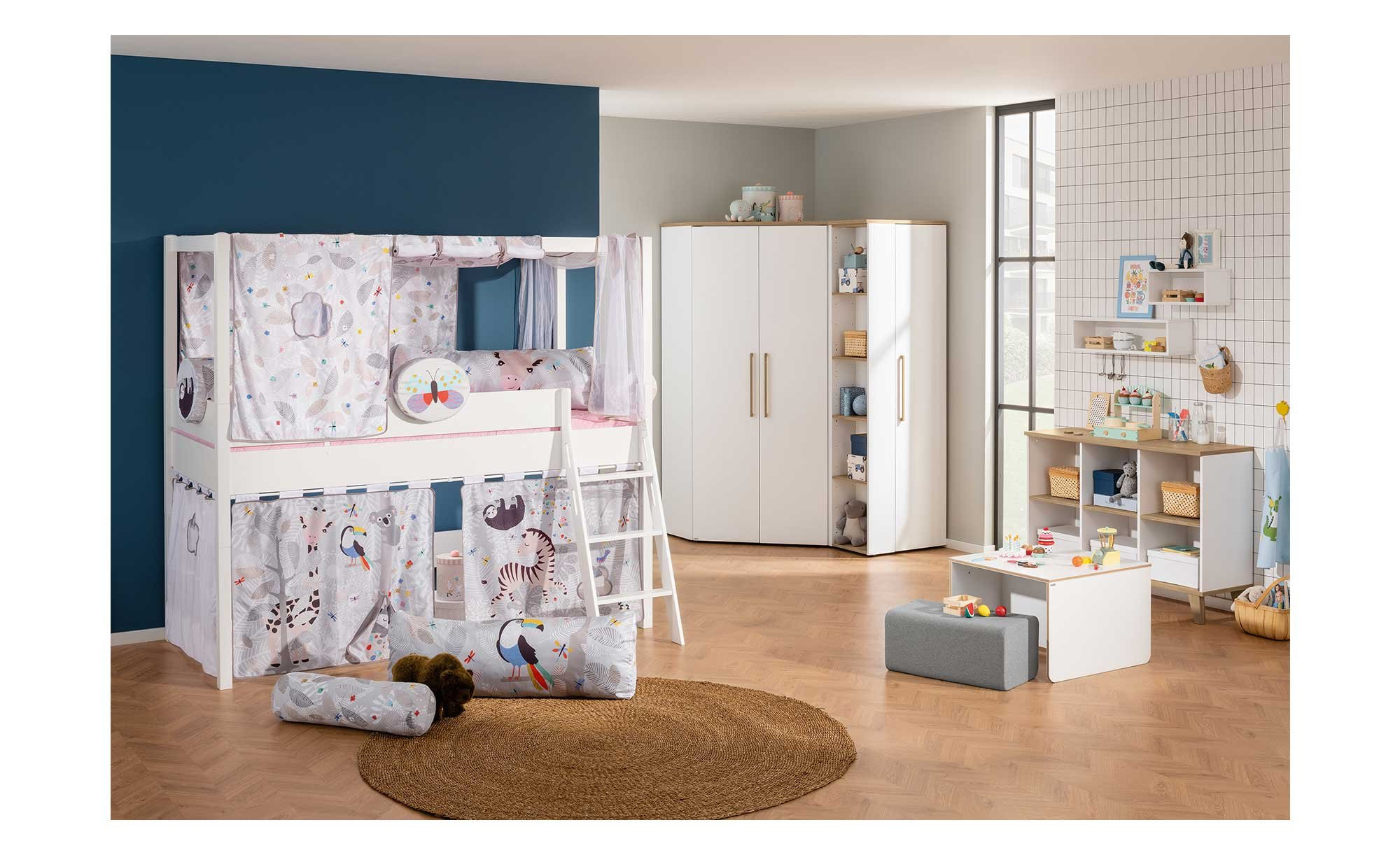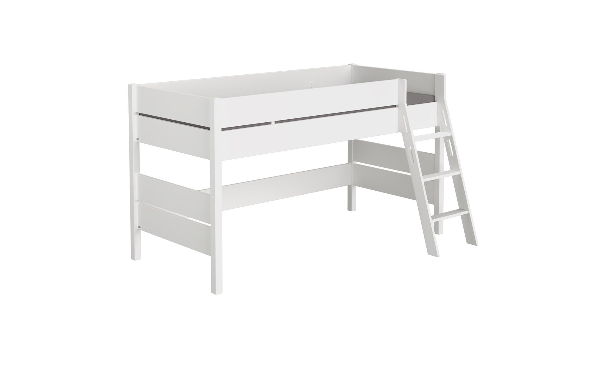 Mit dem Spielbett Tiago verbinden Sie eine erholsame Nachtruhe Ihres Kindes und die Möglichkeit, tagsüber ausgelassen zu toben und zu spielen. Kopfteil und Gestell des ca. 135 x 121 x 210 cm großen Möbels wurden im Dekor Kreideweiß gehalten. Um die ca. 90 x 200 cm umfassende Liegefläche zu erreichen, nutzt Ihr Kind eine schräge Griffleiter. Achtung: Verwenden Sie keine Matratze, die höher als 14 cm ist. Neben der Leiter sind auch Häupter, Bettseiten und Schutzseiten im Lieferumfang enthalten.